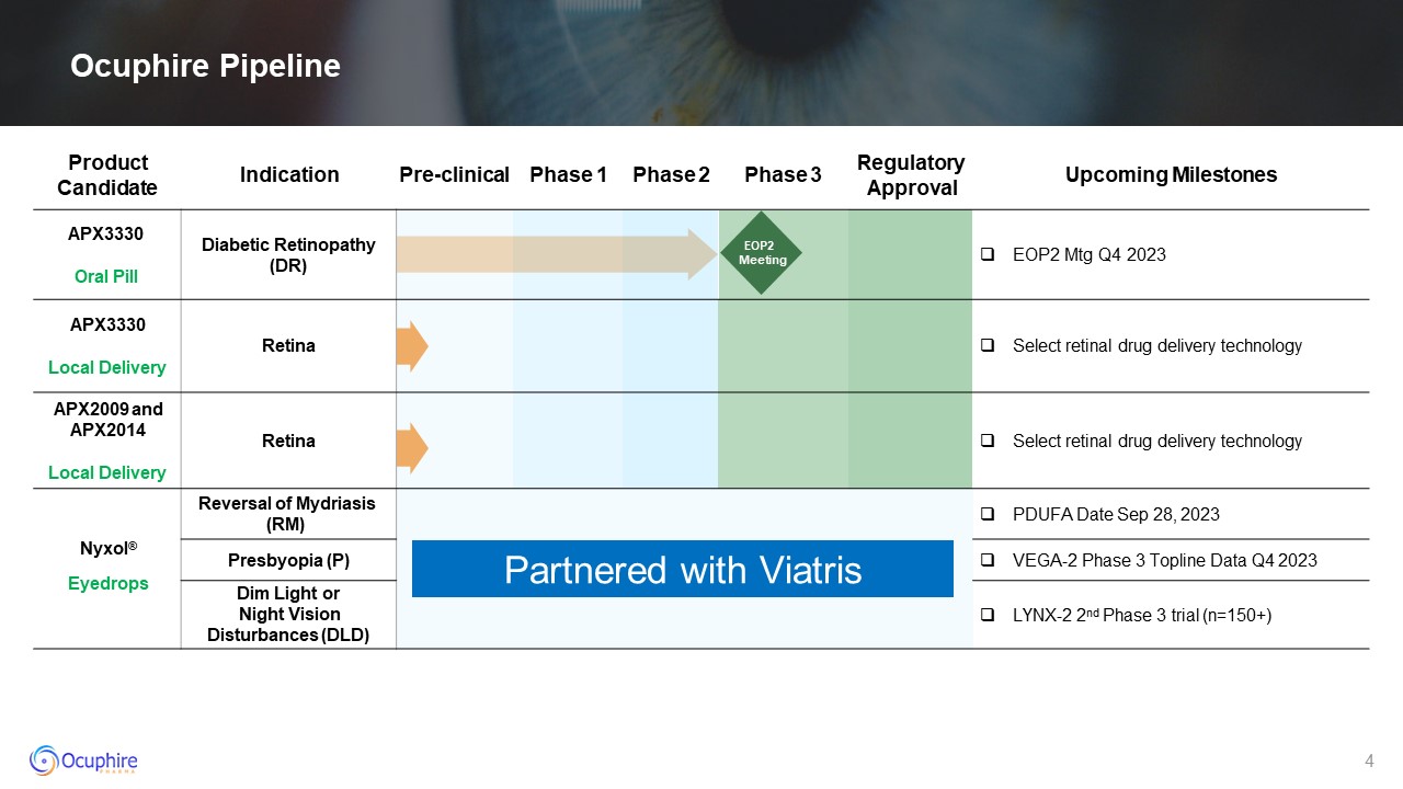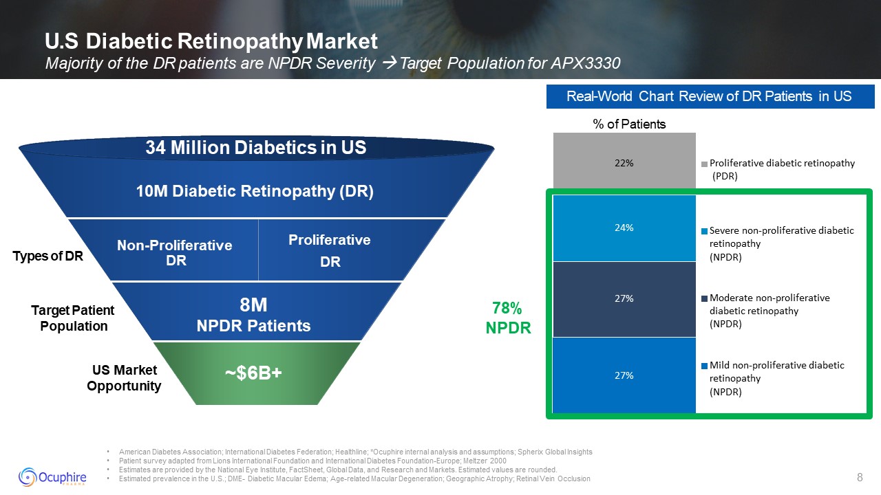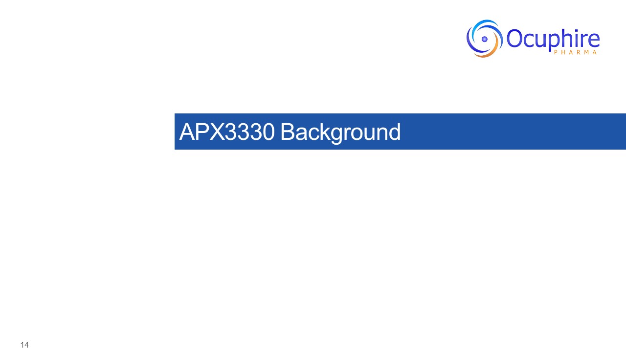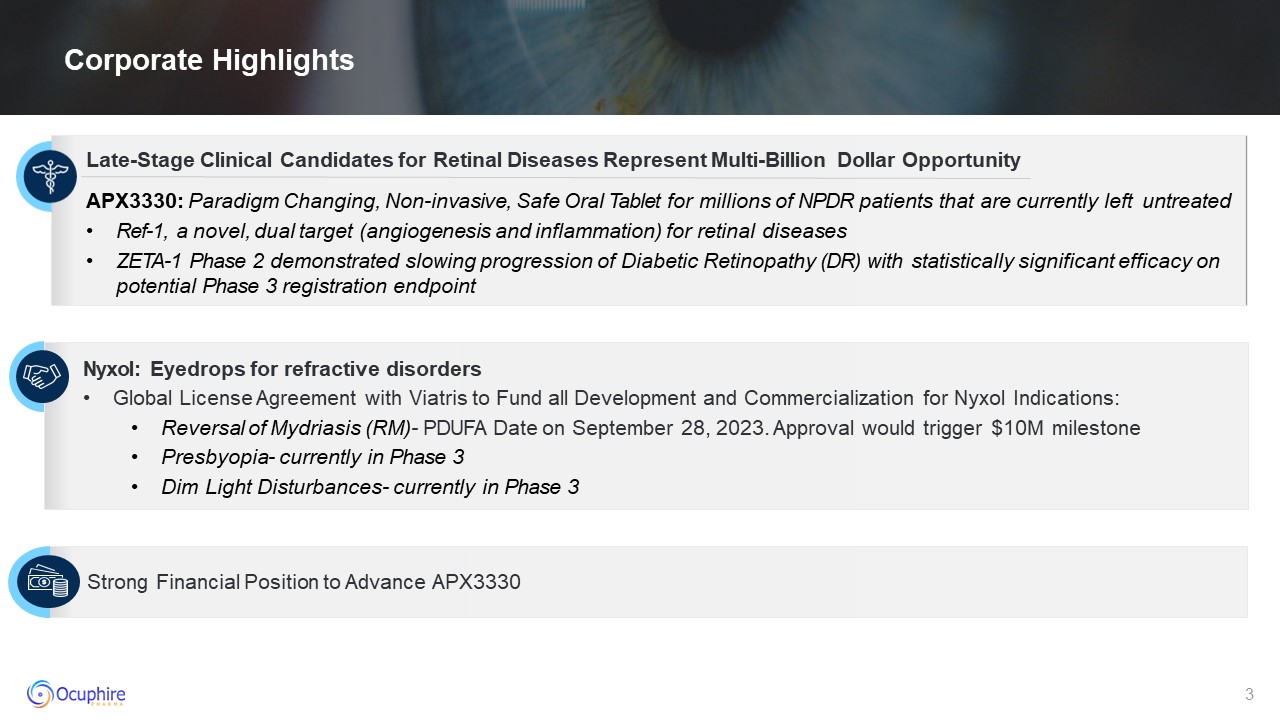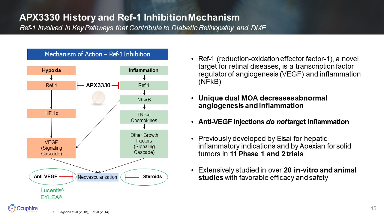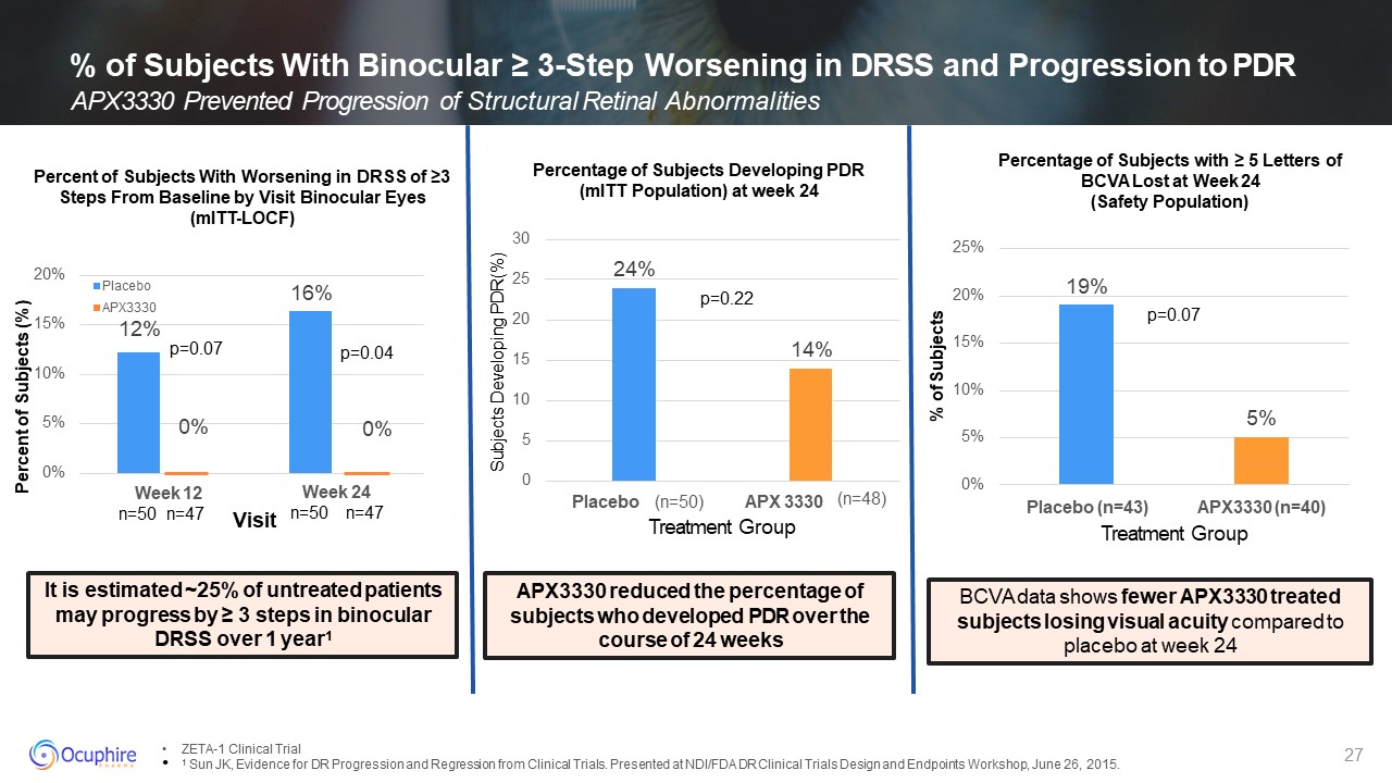 20 ZETA-1:口服AP3330在糖尿病视网膜病变受试者中的2期试验多中心、随机、双蒙面、安慰剂对照的24周试验主要:第24周DRSS(糖尿病视网膜病变严重程度量表1)改善≥ 2步的受试者百分比次级:DRSS改善≥ 1,≥ 2,≥ 3,≥ 4研究眼,对眼眼,双眼DRSS恶化≥ 1,≥ 2,≥ 3,≥ 4,研究眼,对眼眼,双眼进展为威胁视力的并发症中心亚视野厚度(CST)最佳矫正距离视力(BCDVA)DME同眼状态安全性和耐受性探索性:炎性细胞因子终点25个美国位点N = 103名中度重度至重度NPDR或轻度PDR(DRSS 47,53,61)的参与者关键纳入:≥ 18岁DRSS 47,53,或61非中枢性DME permitted2 ETDRS BCVA ≥ 60个字母(20/63)关键排除:OCT CST > 320 µ m2中心参与的DME允许在同侧眼睛中抗VEGF在过去6个月内3 HbA1c ≥ 12.0%资格标准103受试者入组(FPFV Apr 2021 to LPLV Aug 2022)Topline announced in January 2023 1:1 By Central Reading Center中心参与的DME在同侧眼睛中是可接受的包括系统性或IVT VEGF www.clinicaltrials.gov(NCT04692688);Eylea ®是再生元制药注册商标NPDR =非增殖性糖尿病视网膜病变PDR =增殖性糖尿病视网膜病变第0周第12周第24周第4周主要终点APX3330 600mg/天(BID)安慰剂BID随机化