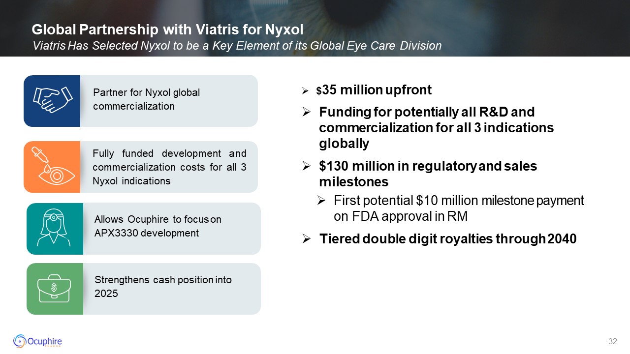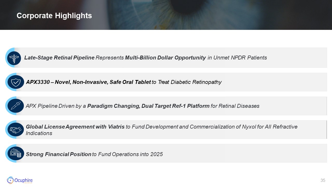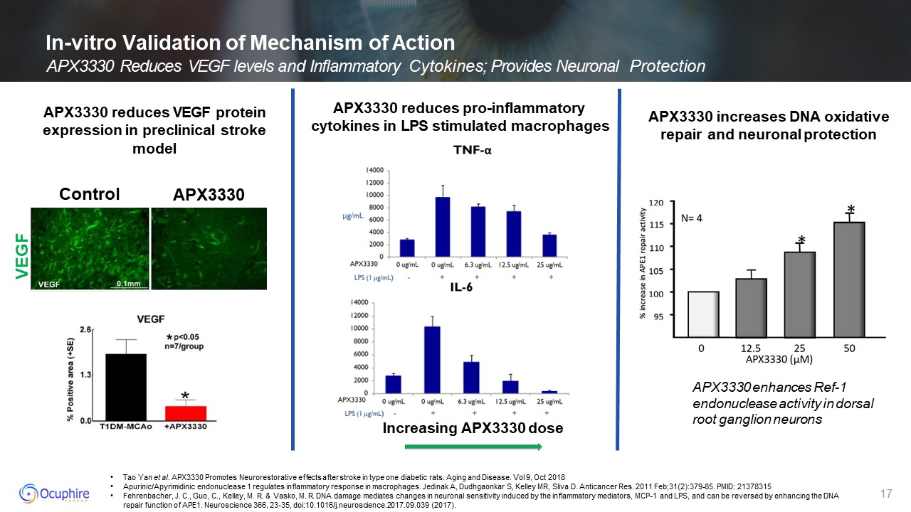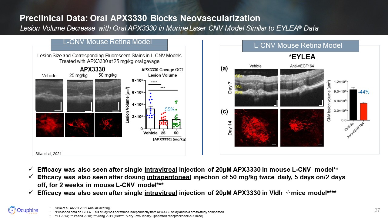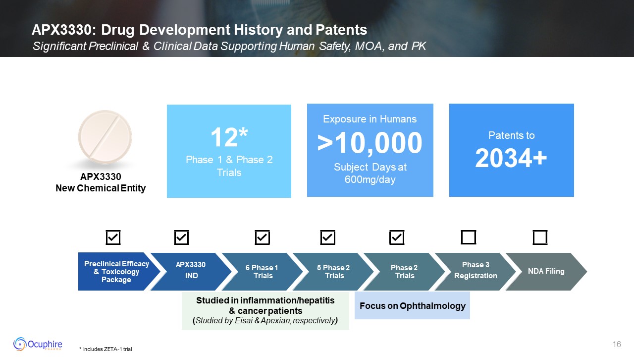 20 ZETA-1:口服AP3330在糖尿病视网膜病变受试者中的2期试验多中心、随机、双蒙面、安慰剂对照的24周试验主要:第24周DRSS(糖尿病视网膜病变严重程度量表1)改善≥ 2步的受试者百分比次级:DRSS改善≥ 1,≥ 2,≥ 3,≥ 4研究眼,对眼眼,双眼DRSS恶化≥ 1,≥ 2,≥ 3,≥ 4,研究眼,对眼眼,双眼进展为威胁视力的并发症中心亚视野厚度(CST)最佳矫正距离视力(BCDVA)DME同眼状态安全性和耐受性探索性:炎性细胞因子终点25个美国位点N = 103名中度重度至重度NPDR或轻度PDR(DRSS 47,53,61)的参与者关键纳入:≥ 18岁DRSS 47,53,或61非中枢性DME permitted2 ETDRS BCVA ≥ 60个字母(20/63)关键排除:OCT CST > 320 µ m2中心参与的DME允许在同侧眼睛中抗VEGF在过去6个月内3 HbA1c ≥ 12.0%资格标准103受试者入组(FPFV Apr 2021 to LPLV Aug 2022)Topline announced in January 2023 1:1 By Central Reading Center中心参与的DME在同侧眼睛中是可接受的包括系统性或IVT VEGF www.clinicaltrials.gov(NCT04692688);Eylea ®是再生元制药注册商标NPDR =非增殖性糖尿病视网膜病变PDR =增殖性糖尿病视网膜病变第0周第12周第24周第4周主要终点APX3330 600mg/天(BID)安慰剂BID随机化