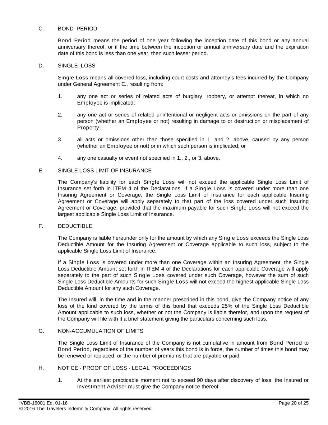 IVBB-16001版。01-16第20页,共25页©2016 The Travelers Indemnity Company。版权所有。C.债券期限债券期限是指自本次债券开始日或其任何周年日起一年的期间,或自本次债券开始日或周年日至到期日之间的时间不足一年的,则为该等较短期限。D.单一损失单一损失是指公司根据总协议E发生的所有承保损失,包括法庭费用和律师费,产生于:1.任何一名员工未受牵连的入室盗窃、抢劫或企图的任何一项或一系列相关行为;2.任何人(无论是否为员工)的任何一项或一系列相关的无意或疏忽行为或不作为,导致财产损坏或毁坏或放错地方;3.除上述1.和2.规定的行为或不作为之外的所有其他行为或不作为,由任何人(不论是否雇员)造成或与该人有牵连;或4.上述1.、2.或3.中未指明的任何一项伤亡或事件。E.保险单笔损失限额公司对每笔损失的赔偿责任将不超过声明第4项规定的适用的保险单笔损失限额。单一损失在一项以上投保协议或承保范围内承保的,每项适用的投保协议或承保范围的保险单一损失限额将分别适用于该保险协议或承保范围内承保的该部分损失,前提是该等单一损失的最高应赔额将不超过保险最大适用的单一损失限额。F.可扣除本公司仅对任何单一损失超过适用于该损失的保险协议或承保范围的单一损失可扣除金额的金额承担本协议项下的责任,但须遵守适用的保险单一损失限额。如果一项单一损失在一份保险协议内的不止一项承保范围内得到承保,则各适用承保范围的声明项目4中规定的单一损失免赔额将分别适用于该承保范围内的该单一损失承保部分,但该单一损失的该单一损失免赔额之和将不超过任何该单一损失承保范围的最高适用单一损失免赔额。被保险人将按照本次债券规定的时间和方式,就本次债券条款所涵盖的任何种类的损失,向公司发出通知,该损失超过适用于该损失的单一损失可扣除金额的25%,无论公司是否对此承担责任,并应公司的要求向其提交一份简要说明,说明有关该损失的详情。G.不累积限额本公司保险单笔损失限额在债券期间至债券期间不发生金额累计,无论本次债券有效年限、本次债券可续期或置换的次数、或应付或支付的保费的次数。H.通知-损失证明-法律程序1。在发现损失后不超过90天的最早实际可行时刻,被保险人或投资顾问必须就此向公司发出通知。