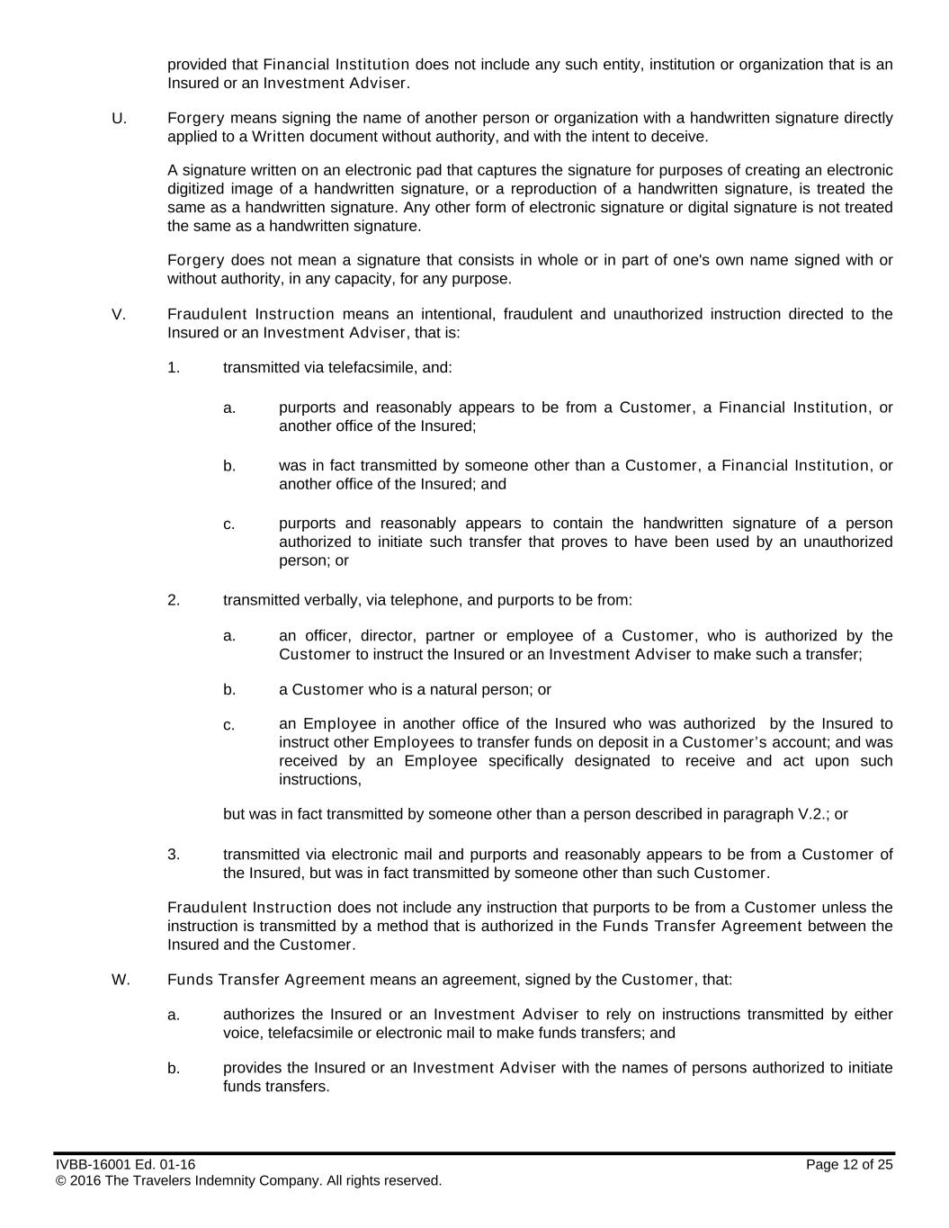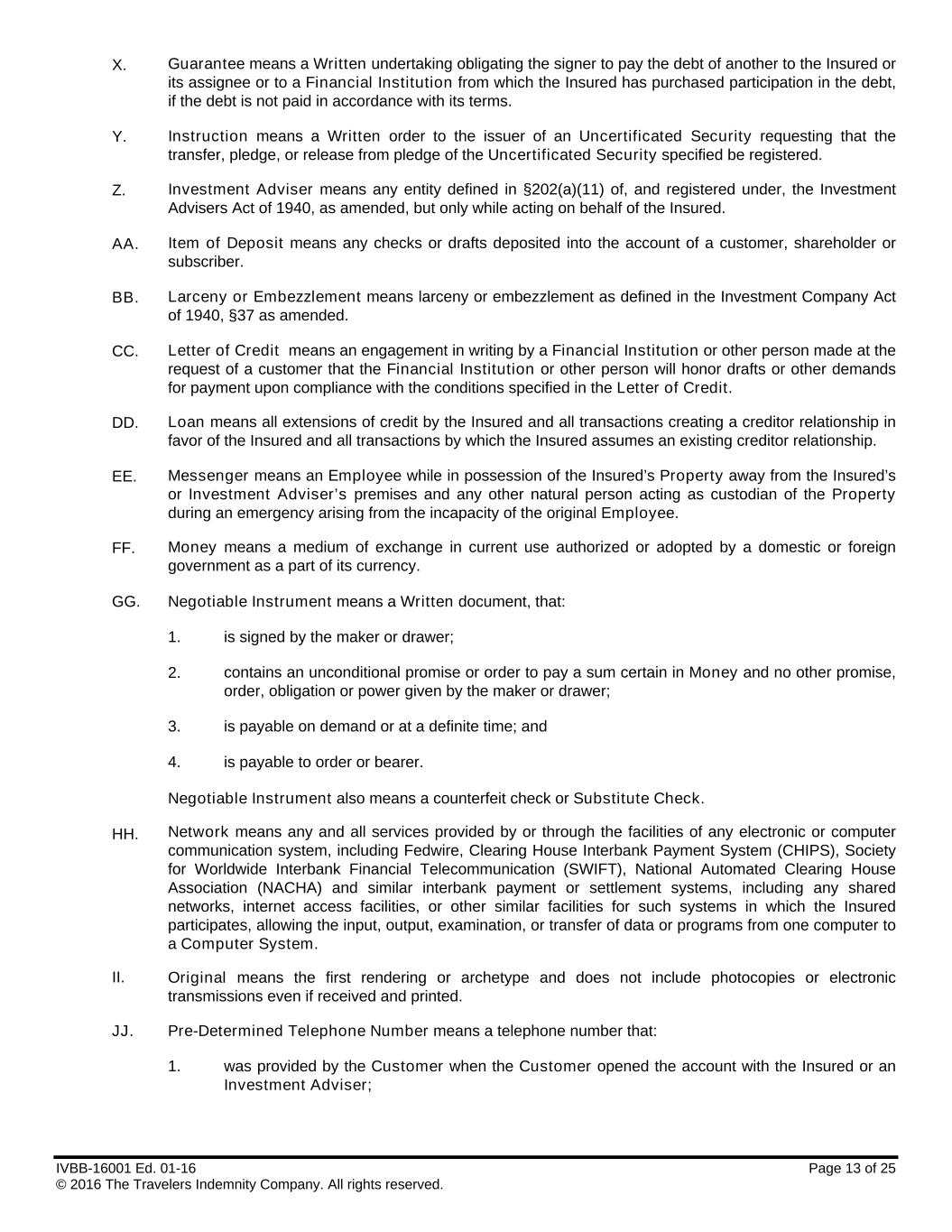 IVBB-16001版。01-16第13页,共25页©2016 The Travelers Indemnity Company。版权所有。十、担保是指书面承诺,规定签字人有义务向被保险人或其受让人或被保险人向其购买参与债务的金融机构支付他人的债务,如果债务未按照其条款支付。Y.指示是指向无证明证券的发行人发出书面命令,要求对指定的无证明证券的转让、质押或解除质押进行登记。Z. Investment Adviser是指《1940年投资顾问法》(经修订)第202(a)(11)条中定义并根据其注册的任何实体,但仅限于代表被保险人行事时。AA。存款项目是指存入客户、股东或认购人账户的任何支票或汇票。BB。盗窃或挪用是指经修订的1940年《投资公司法》第37条所定义的盗窃或挪用公款行为。CC。信用证是指金融机构或其他人应客户要求作出的在符合信用证规定条件时由金融机构或其他人兑现汇票或其他付款要求的书面约定。DD。贷款是指被保险人的所有信贷展期和所有产生有利于被保险人的债权人关系的交易以及被保险人承担现有债权人关系的所有交易。EE。Messenger是指在原雇员丧失工作能力引起的紧急情况期间,在远离被保险人或投资顾问场所的地方占有被保险人财产的雇员和担任财产保管人的任何其他自然人。FF。货币是指国内或外国政府授权或采用的当前使用的交换媒介,作为其货币的一部分。GG。票据是指书面文件,即:1.由出票人或出票人签署;2.包含无条件承诺或命令,以支付一定金额的金钱,而不包含出票人或出票人给予的其他承诺、命令、义务或权力;3.按要求或在确定的时间支付;以及4.支付给定单或不记名人。票面券也意味着伪造支票或替代支票。HH。网络是指由或通过任何电子或计算机通信系统的设施提供的任何和所有服务,包括FedWire、清算所银行间支付系统(CHIPS)、全球银行间金融电信协会(SWIFT)、国家自动化清算所协会(NACHA)和类似的银行间支付或结算系统,包括任何共享网络、互联网接入设施或被保险人参与的此类系统的其他类似设施,允许数据或程序从一台计算机输入、输出、检查或传输到计算机系统。ii.原件是指第一张渲染图或原型,即使收到并打印,也不包括影印件或电子传输。JJ. JJ. JJ. JJ. JJ. JJ. JJ. JJ. JJ. JJ. JJ. JJ. JJ. JJ. JJ. JJ. JJ. JJ. JJ. JJ. JJ. JJ. JJ. JJ. JJ. JJ. JJ. JJ. JJ。预先确定的电话号码是指:1.客户在被保险人或投资顾问开户时提供的电话号码;