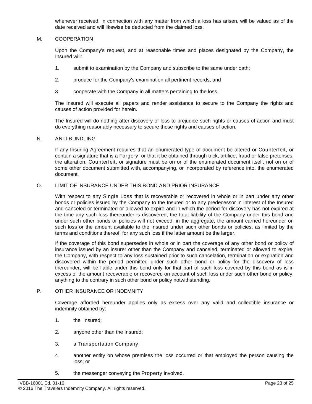 IVBB-16001版。01-16第23页,共25页©2016 The Travelers Indemnity Company。保留所有权利。无论何时收到,与产生损失的任何事项有关,将在收到之日进行估价,同样将从索赔损失中扣除。M.合作应公司要求,在公司指定的合理时间和地点,被保险人将:1、提交公司审查并经宣誓后认购;2、出示所有相关记录供公司审查;3、与公司合作办理与损失有关的一切事宜。被保险人将执行所有文件并提供协助,以确保公司在此规定的权利和诉讼因由。被保险人在发现损失后不会采取任何行动损害这些权利或诉讼因由,必须采取一切合理必要的措施来保障这些权利和诉讼因由。N.反捆绑如果任何保险协议要求某一列举类型的单证被涂改或仿冒,或包含一种伪造的签名,或通过诡计、诡计、欺诈或虚假借口获得,则涂改、仿冒或签名必须在列举单证本身上或其上,而不是在与列举单证一起提交、随附或通过引用并入列举单证的其他单证上或其上。O.本债券项下的保险限额及先前保险就本公司向被保险人或被保险人的利益向任何前任发行的任何其他债券或保单项下可全部或部分收回或收回的任何单一损失而取消、终止或允许到期,且在发现其项下的任何该等损失时发现期限尚未届满的情况下,本公司在本债券项下及该等其他债券或保单项下的负债总额将合计不超过,此类损失在本合同项下结转的金额或受其条款和条件限制的被保险人在此类其他债券或保单下可用于任何此类损失的金额(如果后一金额较大)。如本次债券的覆盖范围全部或部分取代由公司以外的保险人发行的任何其他债券或保单的覆盖范围并被取消、终止或允许到期,则公司就在该等取消、终止或到期之前遭受并在该等其他债券或保单允许的期间内发现的任何损失,根据本债券,将仅对本债券涵盖的损失超过根据该等其他债券或保单因该等损失而可收回或追回的金额的部分承担责任,尽管该等其他债券或保单中有任何相反的情况。P.本合同项下提供的其他保险或赔偿范围仅适用于超出由以下人员获得的任何有效且可收回的保险或赔偿的部分:1.被保险人;2.被保险人以外的任何人;3.运输公司;4.发生损失的场所或雇用造成损失的人的另一实体;或5.运送所涉财产的信使。