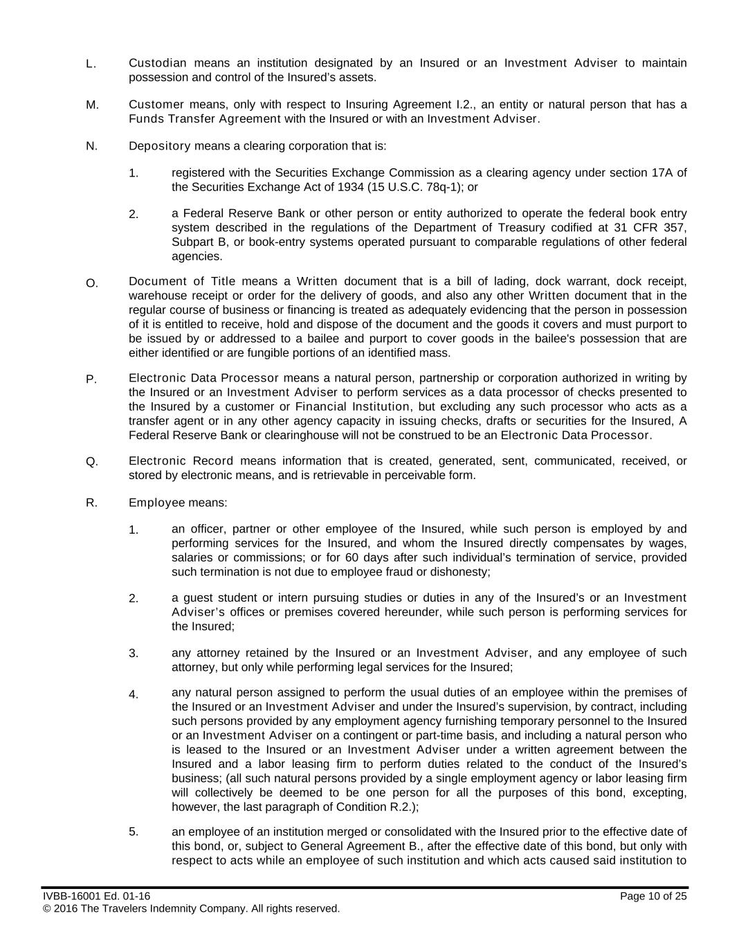 IVBB-16001版。01-16第10页,共25页©2016 The Travelers Indemnity Company。版权所有。L.托管人是指被保险人或投资顾问指定的对被保险人资产保持占有和控制的机构。M.客户是指,仅就投保协议I.2.而言,与被保险人或投资顾问有资金转移协议的实体或自然人。N. Depository是指清算公司,即:1.根据1934年《证券交易法》(15 U.S.C. 78q-1)第17A条在证券交易委员会注册为清算机构;或2.联邦储备银行或其他被授权运营财政部条例中所述的联邦账簿记入系统的个人或实体,该条例编纂于31 CFR 357,子部分B,或根据其他联邦机构的类似条例运营的账簿记入系统。O.所有权文件是指提单、船坞仓单、船坞收据、仓单或交付货物的订单的书面文件,也包括在正常业务或融资过程中被视为充分证明占有该文件的人有权获得的任何其他书面文件,持有和处置文件及其涵盖的货物,必须声称是由受管人签发或寄给受管人,并声称涵盖受管人所拥有的货物,这些货物要么是已识别的,要么是已识别的质量的可替代部分。P.电子数据处理商是指由被保险人或投资顾问书面授权的自然人、合伙企业或公司,作为客户或金融机构向被保险人出示的支票的数据处理商提供服务,但不包括作为转账代理或以任何其他代理身份为被保险人签发支票、汇票或证券的任何此类处理商,联邦储备银行或清算所将不被解释为电子数据处理商。问:电子记录是指以电子方式创建、生成、发送、通信、接收或存储的、以可感知形式检索的信息。R.雇员是指:1.被保险人的高级职员、合伙人或其他雇员,当该人员受雇于被保险人并为其提供服务,并由被保险人直接以工资、薪金或佣金予以补偿;或该个人终止服务后的60天内,前提是该终止服务不是由于雇员欺诈或不诚实;2.在本合同所涵盖的任何被保险人或投资顾问的办公室或场所从事学习或职责的客座生或实习生,当该人为被保险人提供服务时;3.被保险人或投资顾问聘请的任何律师,以及该律师的任何雇员,但仅限于为被保险人提供法律服务时;4.任何被指派在被保险人或投资顾问的场所内并在被保险人的监督下,通过合同履行雇员通常职责的自然人,包括任何职业介绍所提供的临时人员给被保险人或投资顾问以或有或兼职方式提供的这些人,并包括根据被保险人与劳务租赁公司之间的书面协议租赁给被保险人或投资顾问的自然人,以履行与被保险人业务开展相关的职责;(由单一职业介绍机构或劳务租赁公司提供的所有此类自然人,就本次债券的所有目的而言,将被视为一人,但条件R.2.最后一段除外);5.在本次债券生效日期之前与被保险人合并或合并的机构的雇员,或,受总协议B规限,在本债券生效日期后,但仅限于作为该机构雇员期间的行为,以及哪些行为导致该机构