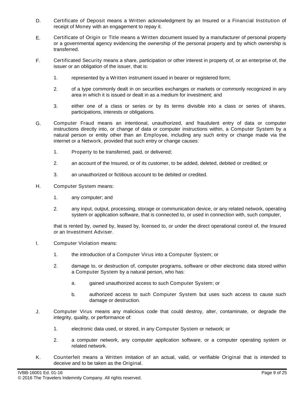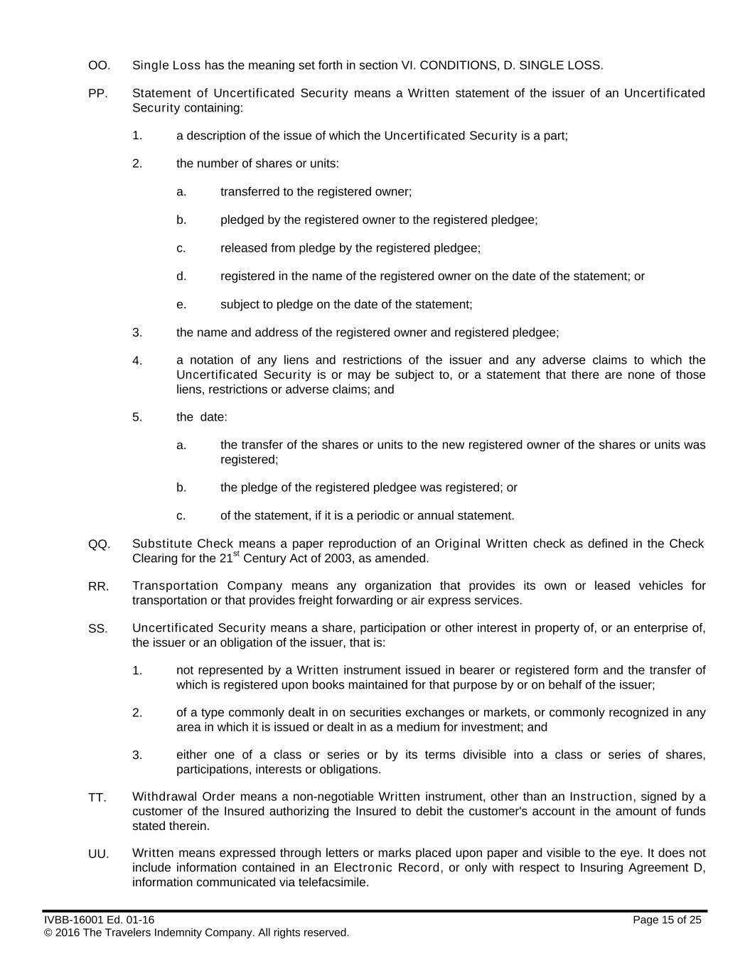 IVBB-16001版。01-16第25页©2016 The Travelers Indemnity Company。版权所有。OO。单一损失具有第六节规定的含义。条件,D.单一损失。PP。无证证券声明是指无证证券发行人的书面声明,其中包含:1.无证证券为其组成部分的发行情况说明;2.股份数量或单位数量:a.转让给登记所有人;b.由登记所有人质押给登记质权人;c.由登记质权人解除质押;d.在声明日登记在登记所有人名下;或e.在声明日受质押限制;3.登记所有人的姓名和地址和登记质权人;4.对发行人的任何留置权和限制以及未证明证券受到或可能受到的任何不利债权的注释,或对不存在任何这些留置权、限制或不利债权的声明;以及5.日期:a.股份或单位转让给股份或单位的新登记所有人登记;b.登记的质权人的质押登记;或报表的c.,如果是定期或年度报表。QQ。替代支票是指经修订的2003年《21世纪法案》支票清算所定义的原始书面支票的纸质复制品。ST RR。运输公司是指提供自有或租赁车辆进行运输或提供货运代理或航空快递服务的任何组织。党卫军。无证明证券是指发行人的财产或其企业的股份、参与或其他权益或发行人的义务,即:1.不以无记名或记名形式发行的书面文书为代表,其转让登记在发行人或其代表为此目的维持的账簿上;2.在证券交易所或市场上通常交易的类型,或在其发行或交易的任何领域被普遍认可为投资媒介;以及3.类别或系列中的任何一种或按其条款可分为类别或系列的股份、参与、利益或义务。TT。退单是指由被保险人的客户签署的授权被保险人以其中规定的资金金额从客户账户借记的不可转让的书面文书,但指示除外。UU. UU. UU. UU. UU. UU. UU. UU. UU. UU. UU. UU. UU. UU. UU. UU. UU. UU. UU. UU. UU. UU. UU. UU. UU. UU. UU. UU. UU. UU. UU. UU. UU. UU. UU. UU. UU. UU. UU. UU. UU. UU. UU. UU. UU. UU. UU. UU. UU. UU. UU. UU. UU. UU. UU. UU. U书面是指通过放置在纸上、肉眼可见的字母或标记表达的意思。它不包括电子记录中包含的信息,或仅涉及保险协议D、通过电传传达的信息。