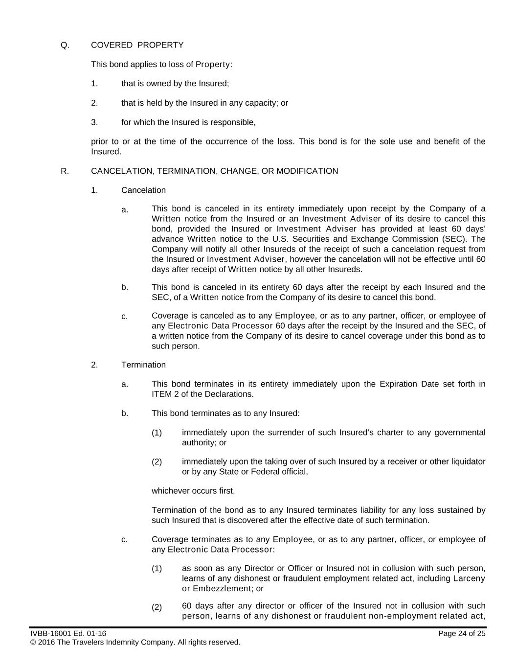 IVBB-16001版。01-16第24页共25页©2016年旅行者赔偿公司。版权所有。问:承保财产本保证金适用于财产损失:1.由被保险人所有的;2.由被保险人以任何身份持有的;或3.在发生损失之前或发生时由被保险人负责的。这笔债券仅供被保险人使用和使用。R.取消、终止、变更或修改1。取消a。只要被保险人或投资顾问至少提前60天向美国证券交易委员会(SEC)提供书面通知,公司在收到被保险人或投资顾问关于其希望取消这笔债券的书面通知后,立即将这笔债券全部取消。公司将在收到被保险人或投资顾问的此类取消请求后通知所有其他被保险人,但取消将在所有其他被保险人收到书面通知后60天后生效。b。本次债券在每个被保险人和SEC收到公司希望取消本次债券的书面通知后60天全部取消。c.在被保险人和SEC收到公司希望取消本次债券的承保范围的书面通知60天后,对任何员工或任何合作伙伴、高级职员或任何电子数据处理器的员工取消承保范围。2.终止a。该债券于声明第2项所载的到期日立即全部终止。b。对于任何被保险人,本保证金终止:(1)在将该被保险人的章程移交给任何政府当局后立即终止;或(2)在接管人或其他清盘人或任何州或联邦官员接管该被保险人后立即终止,以先发生者为准。任何被保险人的债券终止终止对该被保险人在该终止生效日期后发现的任何损失的赔偿责任。c.承保范围终止于任何雇员,或任何电子数据处理商的任何合伙人、高级人员或雇员:(1)任何董事或高级人员或非与该人串通的被保险人一旦知悉任何不诚实或欺诈的雇佣相关行为,包括盗窃或贪污;或(2)被保险人的任何董事或高级人员非与该人串通的60天后,获悉任何不诚实或欺诈的非就业相关行为,