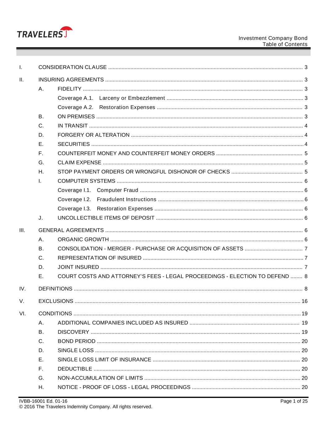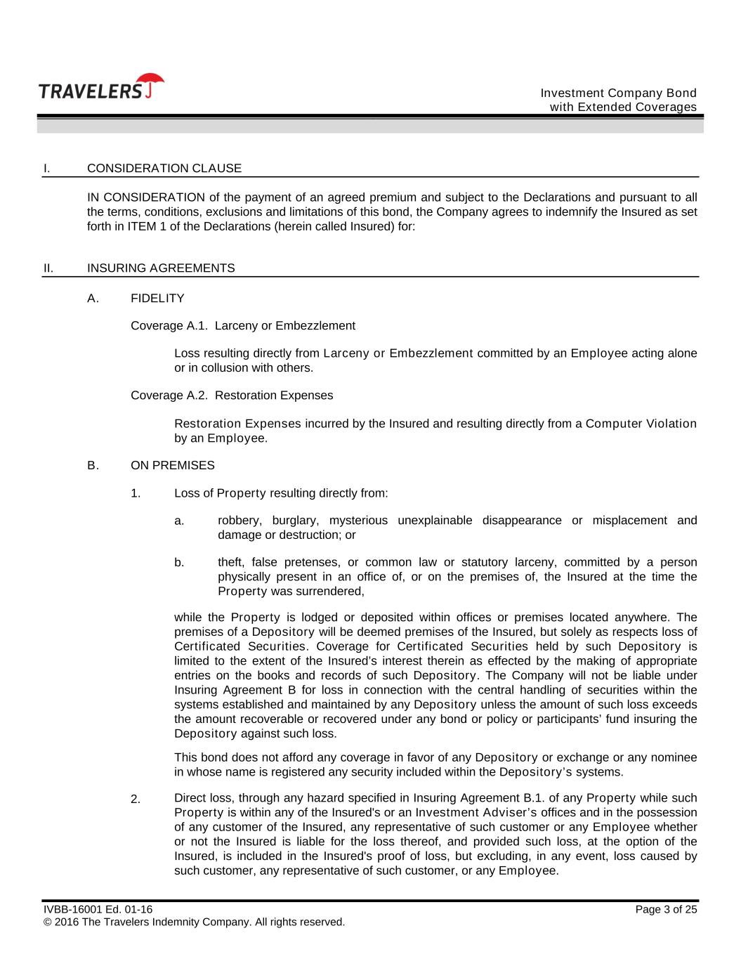 IVBB-16001版。01-16第3页,共25页©2016 The Travelers Indemnity Company。版权所有。延长承保范围的投资公司债券I.考虑支付约定保费的考虑条款,并在遵守声明的前提下,根据本次债券的所有条款、条件、除外责任和限制,公司同意对声明项目1中规定的被保险人(在此称为被保险人)进行赔偿:II。保险协议A.诚信保险A.1。员工单独行动或与他人串通实施的盗窃或侵占行为直接导致的盗窃或侵占损失。覆盖范围A.2。修复费用由被保险人发生的、直接因员工计算机违规而产生的修复费用。B.在房地1。直接导致的财产损失:a.抢劫、入室盗窃、神秘的无法解释的失踪或放错地方以及损坏或毁坏;或b.盗窃、虚假借口或普通法或法定盗窃,由在交出财产时实际存在于被保险人的办公室或场所内的人实施,而财产存放在位于任何地方的办公室或场所内。存管人的处所将被视为被保险人的处所,但仅作为凭证证券的损失。该保存人所持有的凭证式证券的承保范围限于在该保存人的簿册和记录上作出适当记项所影响的被保险人在其中的权益的范围。公司将不会根据保险协议B对任何存管机构建立和维护的系统内的证券集中处理有关的损失承担责任,除非该损失的金额超过根据任何债券或保单或参与者的资金向存管机构投保该损失时可追回或追回的金额。该债券不提供任何有利于任何存管机构或交易所或以其名义注册的任何代名人的覆盖范围,包括在存管机构系统中的任何证券。2.任何财产在被保险人的任何客户、该客户的任何代表或任何雇员(无论该被保险人是否对其损失承担责任)管有期间,通过投保协议B.1.中规定的任何危险造成的直接损失,且前提是该损失由被保险人自行选择,包括在被保险人的损失证明中,但无论如何不包括该客户、该客户的任何代表或任何雇员造成的损失。