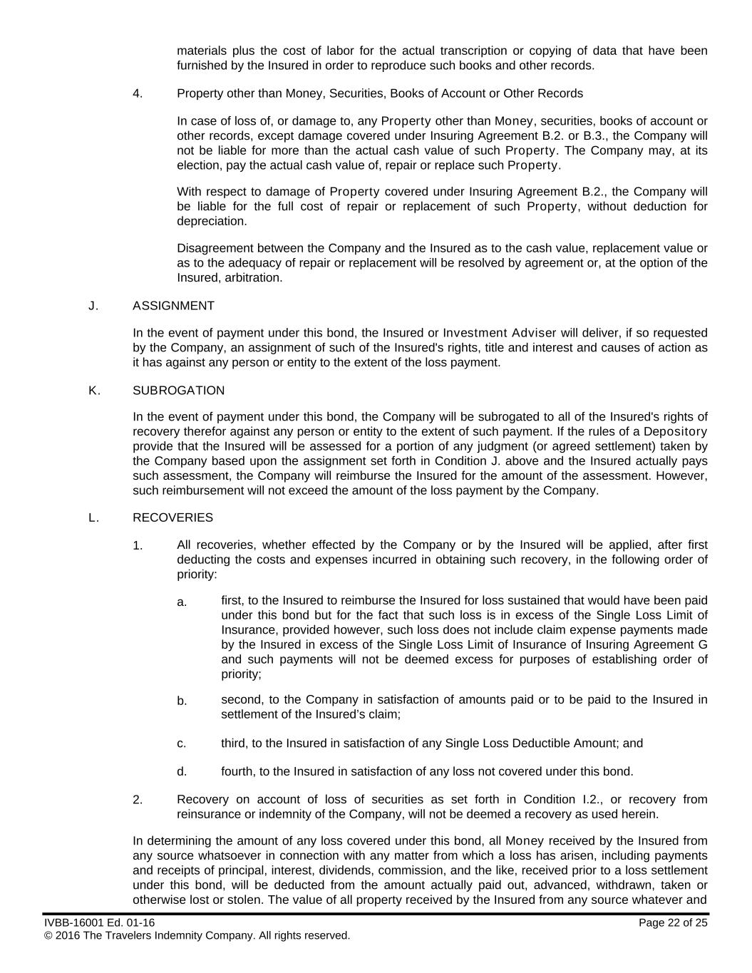 IVBB-16001版。01-16第25页第22页©2016 The Travelers Indemnity Company。版权所有。为复制这类账簿和其他记录,投保人已提供的资料实际抄录或复印的材料加人工费。4.除金钱、证券、账簿或其他记录以外的其他财产如发生金钱、证券、账簿或其他记录以外的任何财产的灭失或损坏,保险协议B.2.或B.3.涵盖的损坏除外,公司将不承担超过该财产实际现金价值的赔偿责任。公司可自行选择支付该财产的实际现金价值、维修或更换该财产。就保险协议B.2.涵盖的财产的损坏而言,公司将承担该财产的全部维修或更换费用,不扣除折旧。公司与被保险人之间关于现金价值、重置价值或关于修理或更换是否充分的分歧将通过协议解决,或由被保险人选择仲裁解决。J.转让在本债券项下发生付款的情况下,被保险人或投资顾问将在公司要求的情况下交付其在损失付款范围内对任何个人或实体所拥有的被保险人的权利、所有权和利益以及诉讼因由的转让。K. SubROGATION在发生本债券项下的付款时,公司将在该付款的范围内被代位行使被保险人对任何个人或实体的全部追偿权利。如果保管人的规则规定,公司根据上述条件J中规定的转让作出的任何判决(或约定的结算)的一部分将对被保险人进行评估,而被保险人实际支付了该评估,则公司将向被保险人补偿评估的金额。但此类补偿将不会超过公司支付的损失金额。L.复苏1。所有追偿,不论是由公司或由被保险人进行的追偿,在先扣除取得该等追偿所产生的成本及开支后,将按以下优先次序适用:a.首先,向被保险人偿付本应根据本保函支付的损失,但该损失超出保险的单一损失限额,但前提是,此类损失不包括被保险人支付的超过投保协议G保险单一损失限额的索赔费用付款,为建立优先权顺序的目的,此类付款不会被视为超额;b.第二,支付给公司以清偿已支付或将支付给被保险人以解决被保险人索赔的金额;c.第三,支付给被保险人以清偿任何单一损失免赔金额;以及d.第四,支付给被保险人以清偿本保证金未涵盖的任何损失。2.因条件I.2.中规定的证券损失而进行的追偿,或从公司的再保险或赔偿中进行的追偿,将不被视为此处使用的追偿。在确定本保函项下所涵盖的任何损失的金额时,被保险人从任何来源收到的与产生损失的任何事项有关的所有款项,包括在本保函项下的损失结算之前收到的本金、利息、股息、佣金等的付款和收款,将从实际支付、垫付、提取、拿走或以其他方式丢失或被盗的金额中扣除。被保险人从任何来源收到的所有财产的价值无论和