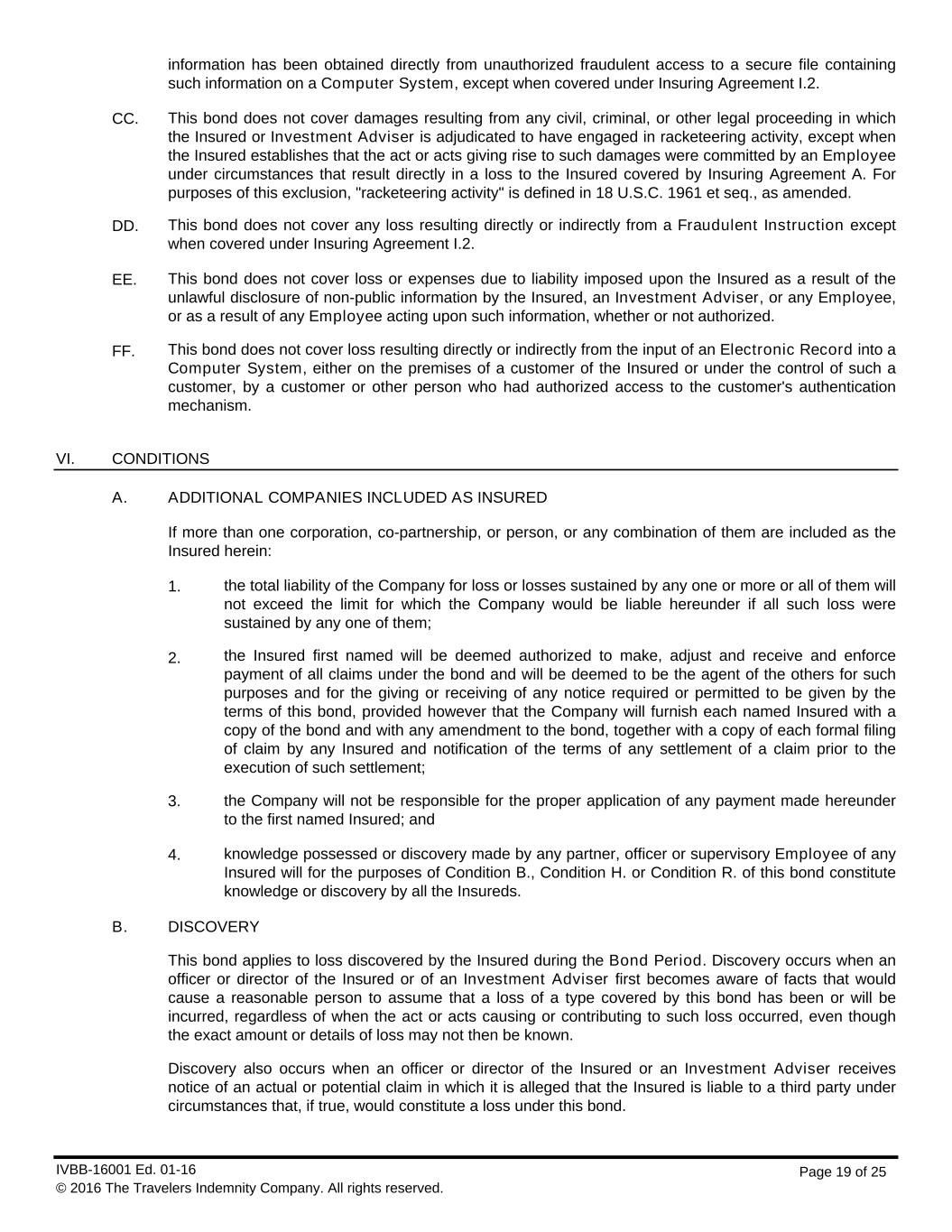 信息是直接从未经授权的欺诈性访问计算机系统上包含此类信息的安全文件中获得的,除非保险协议I.2涵盖。CC。本保证金不包括被保险人或投资顾问被裁定从事敲诈勒索活动的任何民事、刑事或其他法律程序所造成的损害,除非被保险人确定导致此类损害的一项或多项行为是雇员在直接导致保险协议A所涵盖的被保险人损失的情况下实施的。就本排除条款而言,经修订的18 U.S.C. 1961 et seq.中对“敲诈勒索活动”进行了定义。DD。除根据保险协议I.2承保外,本保函不承保因欺诈指示而直接或间接造成的任何损失。EE。本保证金不包括因被保险人、投资顾问或任何雇员非法披露非公开信息,或因任何雇员根据此类信息行事而导致被保险人承担的责任而导致的损失或费用,无论是否获得授权。FF。本保证金不包括客户或其他已授权访问客户认证机制的人在被保险人的客户场所或在该客户控制下将电子记录输入计算机系统直接或间接导致的损失。vi.条件A.如果有不止一家公司、共同合伙企业或个人,或他们的任何组合在此被列为被保险人,则包括额外的被保险人公司:1.公司对他们中的任何一方或多方或全部遭受的损失或损失承担的全部责任不会超过如果他们中的任何一方全部遭受该等损失,则公司在此项下应承担的限额;2.首先被点名的被保险人将被视为被授权作出,调整、接收和强制支付债券项下的所有债权,并将被视为其他人的代理人,用于此类目的以及发出或接收本次债券条款要求或允许发出的任何通知,但前提是公司将向每个指定的被保险人提供债券的副本以及对债券的任何修订,连同任何被保险人每次正式提出索赔的副本,以及在执行此类和解之前通知任何索赔和解的条款;3.公司将不负责将根据本协议支付的任何款项正确应用于第一个指定的被保险人;以及4.任何合伙人、高级职员或监管雇员对任何被保险人的遗嘱所拥有的知识或发现,就本债券的条件B、条件H或条件R而言,构成所有被保险人的知情或发现。B.发现本保函适用于被保险人在保证期内发现的损失。当被保险人或投资顾问的高级管理人员或董事首先意识到会导致合理的人假设本债券所涵盖的某一类型的损失已经或将会发生的事实时,就会发生发现,无论导致或促成这种损失的一种或多种行为何时发生,即使此时可能无法知道损失的确切金额或细节。发现也发生在被保险人的高级职员或董事或投资顾问收到实际或潜在索赔的通知时,在该通知中,据称被保险人在如果属实将构成本债券项下损失的情况下对第三方承担责任。第25页©2016年旅行者赔偿公司。版权所有。IVBB-16001版。01-16