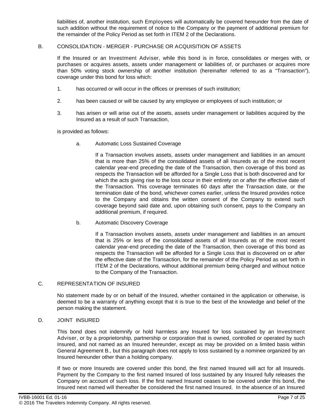 IVBB-16001版。01-16第7页,共25页©2016 The Travelers Indemnity Company。保留所有权利。、其他机构的责任,此类雇员将自该等增加之日起自动在本协议项下承保,而无需向公司发出通知或支付声明第2项所述保单期间剩余时间的额外保费。B.合并-合并-购买或收购资产如果被保险人或投资顾问在本期债券有效期间,与其他机构合并或合并,或购买或收购资产、管理下的资产或负债,或购买或收购其他机构50%以上有表决权的股份所有权(以下简称“交易”),本保证金项下对下列损失的承保范围:1.已发生或将发生在该机构的办公室或场所;2.已造成或将造成于该机构的任何雇员或雇员;或3.已产生或将产生于被保险人因该交易而取得的资产、管理下的资产或负债,规定如下:a.自动损失持续承保,如果交易涉及资产,管理下的资产和负债的金额超过交易日期前最近一个日历年末所有被保险人合并资产的25%,则本次债券就交易而言的覆盖范围将提供给在交易生效日期或之后既已发现且导致损失的行为全部发生的单一损失。此承保范围在交易日期后60天终止,或债券的终止日(以较早者为准),除非被保险人向公司发出通知并获得公司的书面同意,将该承保范围延长至所述日期之后,并在获得该同意后,在必要时向公司支付额外保费。b.如果交易涉及的资产、管理下的资产和负债的金额为交易日期前最近一个日历年末所有被保险人合并资产的25%或以下,则自动发现承保,然后,对于在交易生效日期或之后发现的单一损失,在声明第2项规定的保单期间的剩余时间内,将提供与交易相关的本次债券的覆盖范围,不收取额外溢价,也不向公司通知交易。C.被保险人的代表任何由被保险人或代表被保险人作出的陈述,不论是否包含在申请或其他方面,均被视为对任何事情的保证,除非作出该陈述的人尽其所知和所信是真实的。D.联合投保本债券不对投资顾问或由该被保险人拥有、控制或经营的独资企业、合伙企业或公司遭受的损失进行赔偿或使任何被保险人免受损害,但在总协议B中可能在有限的基础上提供的情况除外,但本款不适用于由本协议项下的被保险人组织的代理人遭受的损失,而不是控股公司。如果有两个或两个以上的被保险人在这个债券下被覆盖,第一个被命名的被保险人将代理所有被保险人。公司就任何被保险人遭受的损失向第一名指定被保险人支付的款项完全解除了公司因此类损失而承担的责任。如果第一个被点名的被保险人在本债券下停止承保,则此后被下一个被点名的被保险人将被视为第一个被点名的被保险人。在没有被保险人的情况下