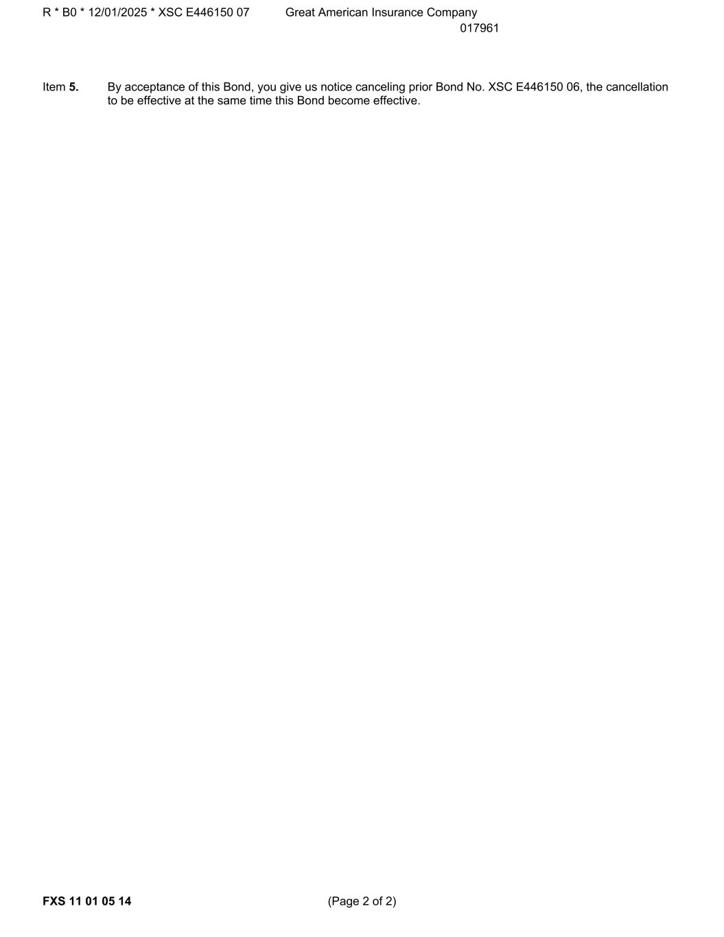 项目5。承兑本债券即通知我们注销先前第XSC E44615006,注销生效同时本券生效。FXS 11010514(第2页,共2页)R*B0*12/01/2025*XSC E446150 07 Great American保险公司017961