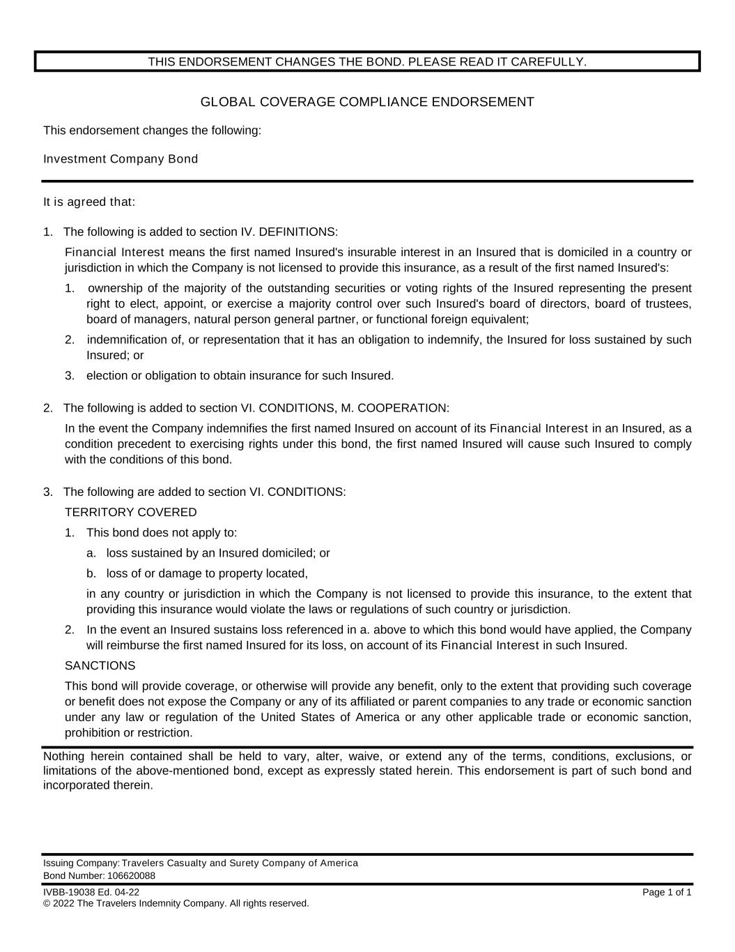 这种背书会改变债券。请仔细阅读。IVBB-19038编。04-22第1页共1页©2022 The Travelers Indemnity Company。版权所有。全球覆盖合规背书本背书变更如下:投资公司债券同意:1。第四节增加了以下内容。定义:财务利益是指在公司未获许可提供此种保险的国家或司法管辖区注册的被保险人中,由于第一名被保险人的:1.对被保险人大多数已发行证券或表决权的所有权,代表目前有权选举、任命或行使对该被保险人的董事会、董事会、经理人董事会、自然人普通合伙人或职能上的外国等同人的多数控制权;2.赔偿,或表示有义务赔偿、被保险人因该被保险人遭受的损失;或3.选择或有义务为该被保险人投保。2.第六节新增以下内容。条件丨M. COOPERATION:如果公司因其在被保险人的财务权益而赔偿第一名指定被保险人,作为行使本次债券项下权利的先决条件,第一名指定被保险人将促使该被保险人遵守本次债券的条件。3.第六节新增以下内容。条件:涵盖的领土1。本保证金不适用于:a.被保险人住所遭受的损失;或b.位于公司未获许可提供本保险的任何国家或司法管辖区的财产的损失或损坏,只要提供本保险会违反该国家或司法管辖区的法律或法规。2.如果被保险人蒙受了本应适用于本债券的上述a.中提及的损失,公司将补偿第一个被点名的被保险人的损失,原因是其在该被保险人中的财务利益。制裁本债券将提供保险,或以其他方式提供任何利益,但前提是提供此类保险或利益不会使公司或其任何关联或母公司面临美利坚合众国任何法律或法规或任何其他适用的贸易或经济制裁、禁止或限制下的任何贸易或经济制裁。本文所载的任何内容均不得被视为更改、更改、放弃或延长上述债券的任何条款、条件、除外责任或限制,除非本文明确说明。该背书是此类债券的一部分,并纳入其中。债券编号:106620088发行公司:Travelers Casualty and Surety Company of America