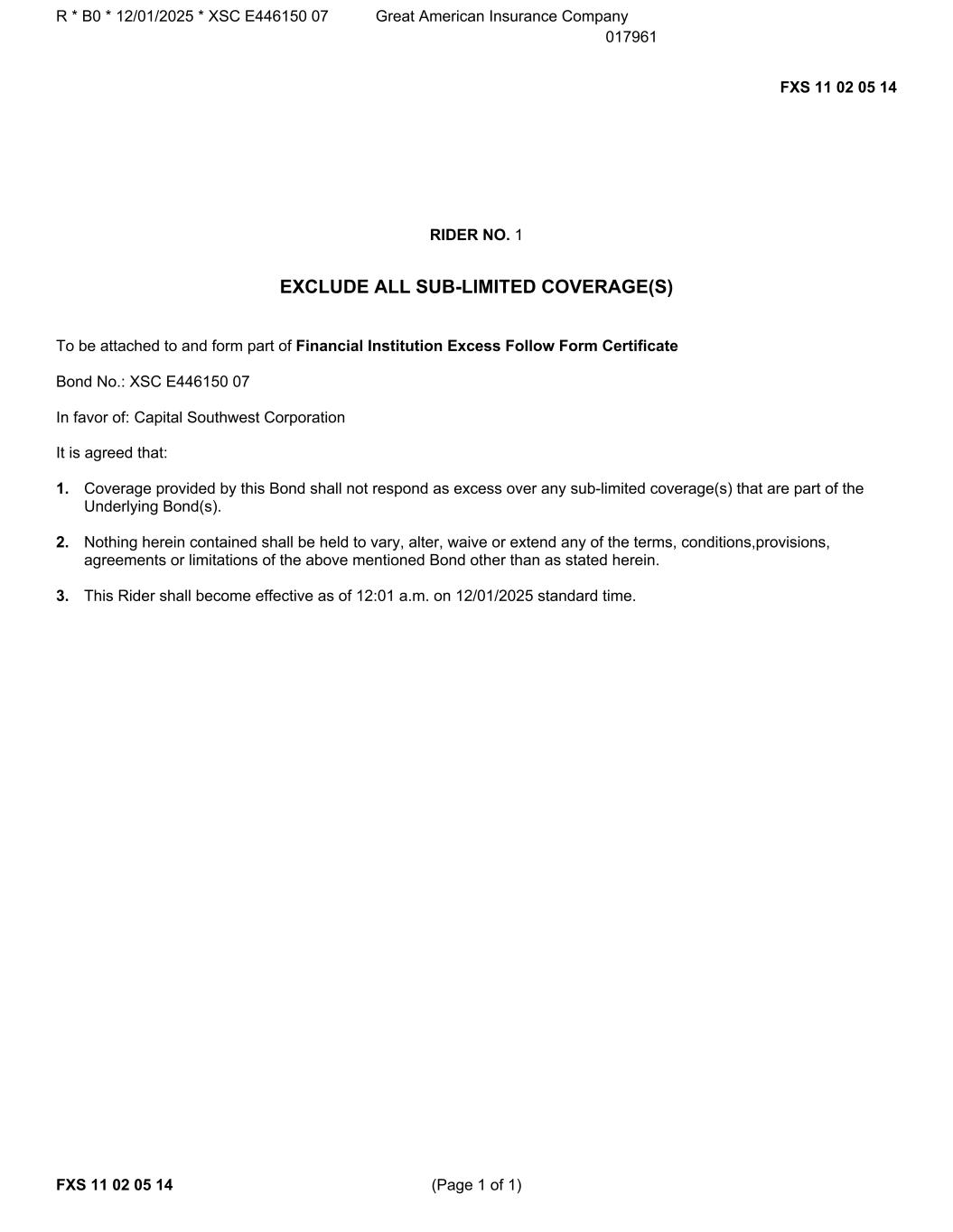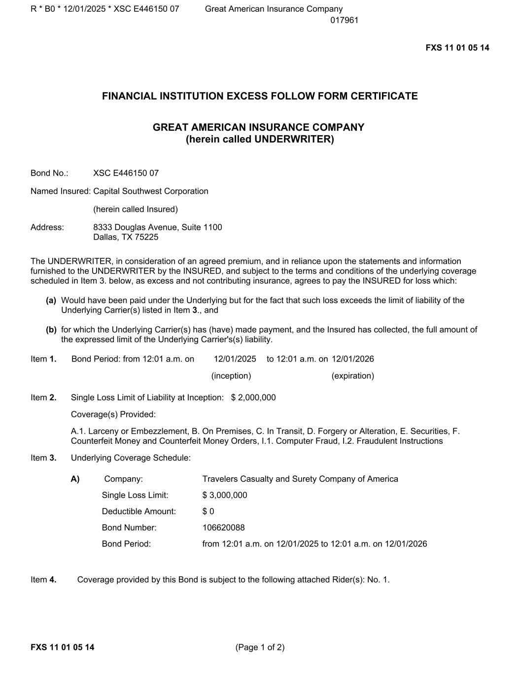 金融机构超额遵循表格证明Great American Insurance Company(herein called underwriter)Bond No.:XSC E44615007 Named Insured:Capital Southwest Corporation(herein called insured)address:8333 Douglas Avenue,Suite 1100 Dallas,TX 75225 underwriter,以商定的保费为代价,并依据被保险人提供给承销商的报表和信息,并在遵守下文第3项所列基础保险的条款和条件的情况下,作为超额且不缴纳保险,同意就以下损失向被保险人支付:(a)如果不是因为该损失超过了第3项所列的基础承运人的赔偿责任限额,以及(b)基础承运人已经(已经)支付且被保险人已收取的,则为基础承运人的赔偿责任明示限额的全部金额。项目1。债券期限:自12/01/2025上午12:01至12/01/2026上午12:01(开始)(到期)项目2。初始责任的单一损失限额:2,000,000美元承保范围,前提是:A.1。盗窃或挪用,B.处所内,C.运输途中,D.伪造或变造,E.证券,F.假币和假钞订单,I. 1。电脑诈骗,I.2。欺诈指令第3项。基础承保时间表:a)公司:Travelers Casualty and Surety Company of America单一损失限额:3,000,000美元可扣除金额:0美元债券编号:106620088债券期限:从2025年12月1日上午12:01至2026年12月1日上午12:01项目4。本期债券提供的覆盖范围以随附的1号附加条款为准。FXS 11010514 FXS 11010514(第1页,共2页)R*B0*12/01/2025*XSC E446150 07 Great American保险公司017961