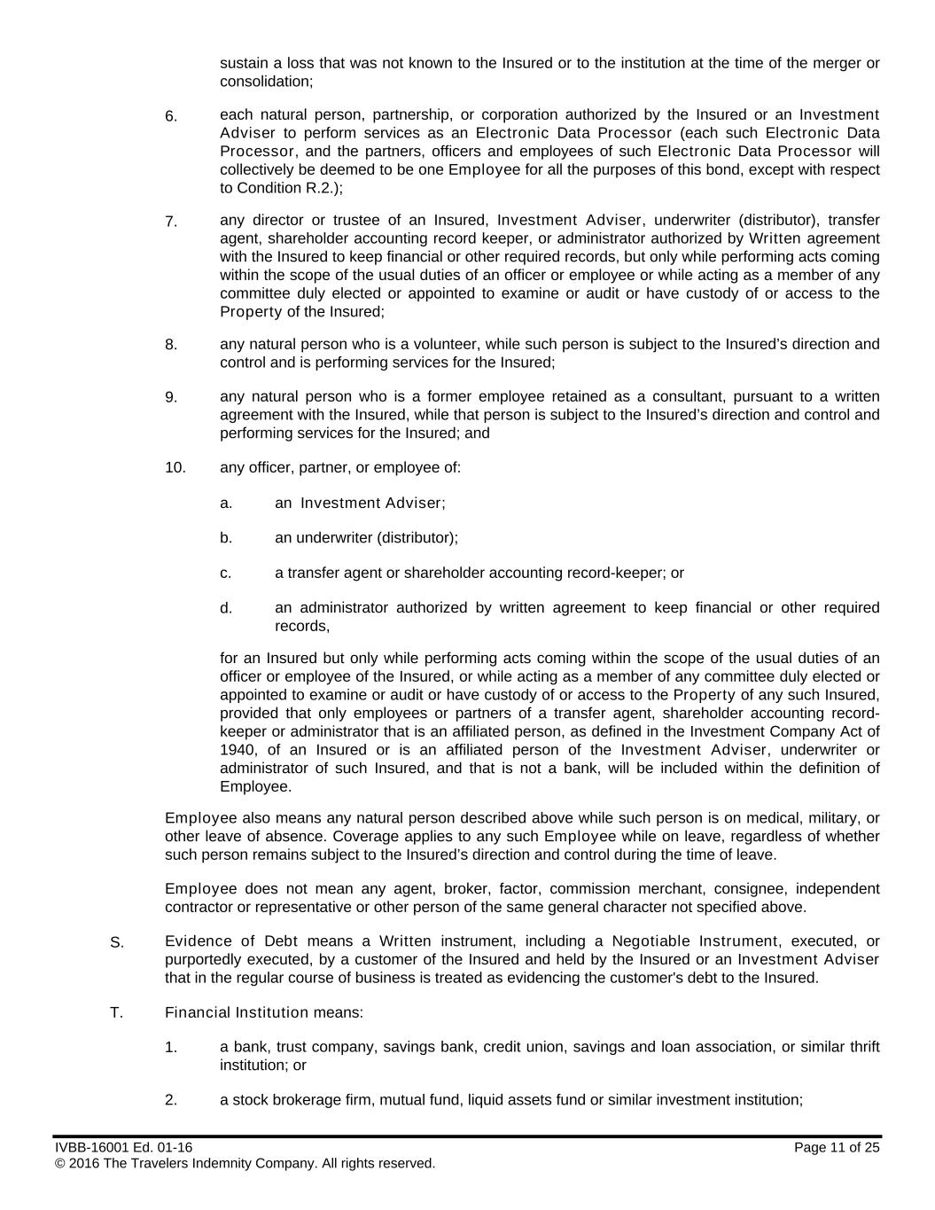 IVBB-16001版。01-16第11页,共25页©2016 The Travelers Indemnity Company。保留所有权利。承受在合并或合并时被保险人或机构不知道的损失;6.被保险人或投资顾问授权作为电子数据处理商提供服务的每个自然人、合伙企业或公司(每个此类电子数据处理商,以及此类电子数据处理商的合伙人、高级职员和雇员将集体被视为本债券的所有目的的一名雇员,但条件R.2除外);7.被保险人的任何董事或受托人、投资顾问、承销商(分销商),转让代理人、股东会计记录保管人或与被保险人书面协议授权的管理人保存财务或其他规定记录,但仅限于在执行属于高级职员或雇员通常职责范围内的行为时,或在作为任何正式选出或任命的委员会的成员行事时,以审查或审计或保管或访问被保险人财产;8.作为志愿者的任何自然人,当这类人受投保人的指导和控制,正在为被保险人提供服务时;9.作为前雇员的任何自然人,根据与被保险人的书面协议被保留为顾问,而该人受被保险人的指导和控制,并为被保险人提供服务;以及10.任何高级职员、合伙人或雇员:a.投资顾问;b.承销商(分销商);c.转让代理人或股东会计记录保管人;或d.经书面协议授权保存财务或其他所需记录的管理人,对于被保险人而言,但仅限于在执行属于被保险人的高级职员或雇员通常职责范围内的行为时,或在作为任何委员会的成员行事时,正式选出或指定审查或审计或保管或访问任何此类被保险人的财产,但前提是只有转让代理人、股东会计记录保管人或管理人的雇员或合伙人是被保险人的关联人(如1940年《投资公司法》所定义)或投资顾问的关联人,此类被保险人的承保人或管理人,也就是不是银行,将被包括在雇员的定义中。雇员也指上述任何自然人,当该自然人因病、服兵役或其他请假期间。保险范围适用于休假期间的任何此类雇员,无论此人在休假期间是否仍受被保险人的指示和控制。雇员并不是指任何代理人、经纪人、保理商、佣金商、收货人、独立承建商或代表或具有上述未指明的相同一般性质的其他人。S.债务证据是指由被保险人的客户签立或据称签立的、由被保险人或投资顾问持有的、在正常业务过程中被视为证明客户对被保险人的债务的书面文书,包括票据。T.金融机构是指:1.银行、信托公司、储蓄银行、信用社、储贷协会或类似节俭机构;或2.股票券商、共同基金、流动资产基金或类似投资机构;