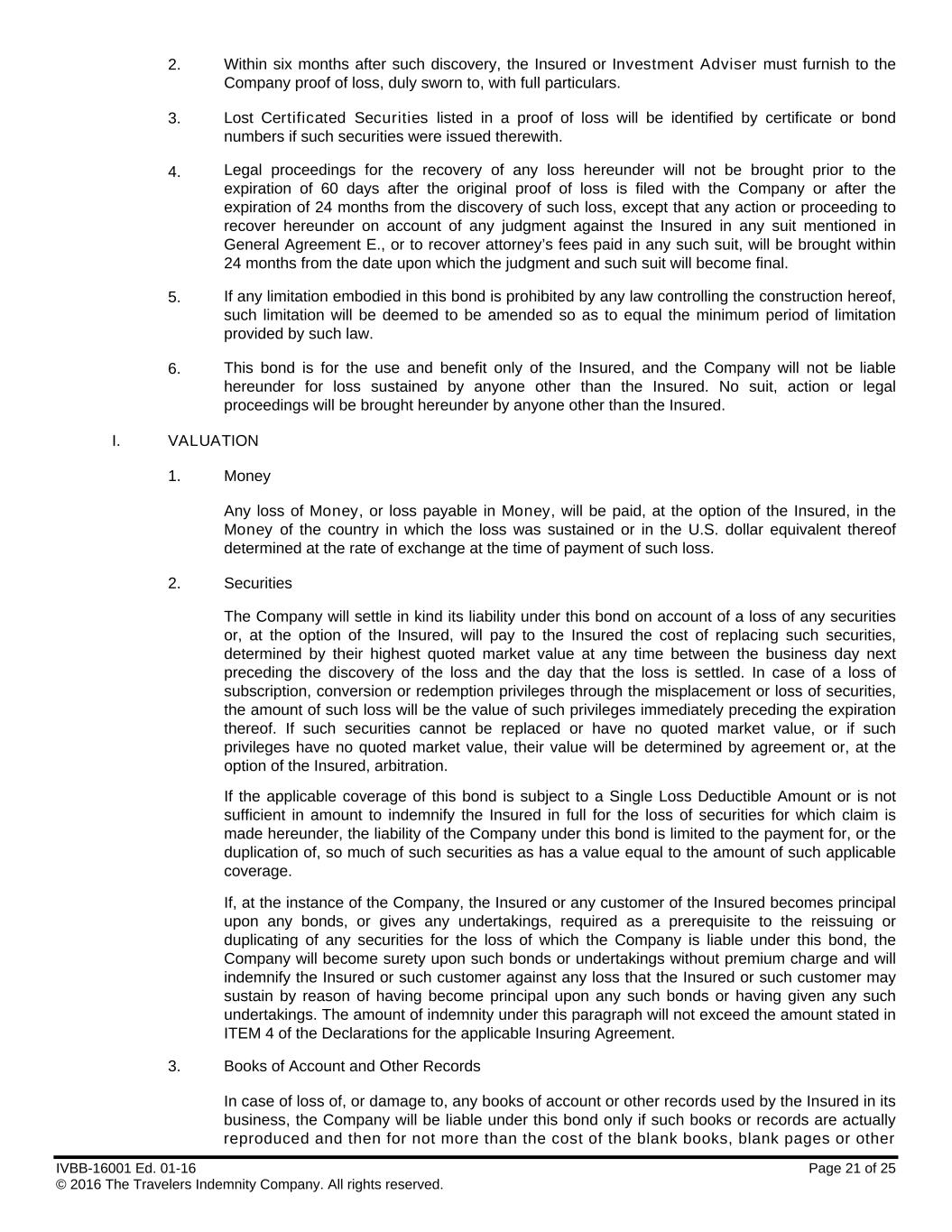 IVBB-16001版。01-16第25页©2016 The Travelers Indemnity Company。版权所有。2.在该发现后六个月内,被保险人或投资顾问必须向公司提供正式宣誓的损失证明,并附有完整的细节。遗失证明中所列的遗失凭证证券,如果与之一同发行,将通过凭证或债券编号进行识别。4.本协议项下任何损失的追讨法律程序将不会在向公司提交损失原始证据后60天届满前或自发现该损失后24个月届满后提起,但因在总协议E中提及的任何诉讼中对被保险人作出任何判决而根据本协议进行追讨的任何诉讼或程序,或追讨在任何该等诉讼中支付的律师费的任何诉讼或程序,将在该判决和该诉讼成为终局之日起24个月内提起。5.如本保证金所包含的任何限制被控制本合同施工的任何法律禁止,则该限制将被视为被修改,以等于该法律规定的最短时效期限。6.本次保证金仅供被保险人使用和受益,对于被保险人以外的其他人员遭受的损失,本公司不承担本项下的责任。被保险人以外的任何人不会在本协议项下提起诉讼、诉讼或法律诉讼。一、估值1。金钱任何金钱损失,或以金钱支付的损失,将根据被保险人的选择,以遭受损失的国家的金钱或按支付该损失时的汇率确定的等值美元支付。2.证券本公司将就任何证券的损失以实物结算其在本债券项下的负债,或根据被保险人的选择,向被保险人支付替换该等证券的费用,该费用由其在发现损失的下一个营业日之前的下一个营业日至损失结算之日之间的任何时间的最高报价市值确定。如果由于证券的错配或损失而丧失了认购、转换或赎回特权,这种损失的金额将是这些特权在紧接其到期之前的价值。如果此类证券无法被替换或没有报价市场价值,或者如果此类特权没有报价市场价值,则其价值将通过协议确定,或者由被保险人选择仲裁。如果本次债券的适用保障范围受制于单一的可免除损失金额或金额不足以就根据本协议提出索赔的证券的损失全额赔偿被保险人,则公司在本次债券项下的责任仅限于支付或复制价值等于该适用保障范围金额的证券的金额。如在公司的情况下,被保险人或被保险人的任何客户成为任何债券的本金,或作出任何承诺,作为重新发行或复制公司根据本债券对其承担损失的任何证券的先决条件,公司将成为该等债券或承诺的担保人,不收取溢价,并将赔偿被保险人或该客户因已成为任何该等债券的本金或已作出任何该等承诺而可能蒙受的任何损失。本款下的赔偿金额将不超过适用保险协议的声明项目4中规定的金额。3.账簿和其他记录如果被保险人在其业务中使用的任何账簿或其他记录发生灭失或损坏,公司将仅在该等账簿或记录被实际复制后才承担本保证金项下的赔偿责任,然后赔偿不超过空白账簿、空白页或其他3的费用。
