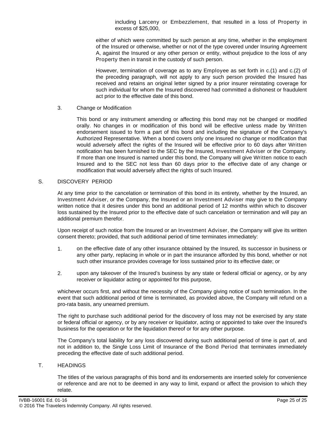 IVBB-16001版。01-16第25页,共25页©2016 The Travelers Indemnity Company。保留所有权利。包括盗窃或挪用,导致超过25000美元的财产损失,其中任何一项是该人在任何时候对被保险人或任何其他个人或实体实施的,无论是在受保人的雇用中还是在其他情况下,无论是否属于保险协议A所涵盖的类型,但不影响当时由该人保管的任何在途财产的损失。但是,前款c.(1)和c.(2)规定的对任何雇员的保险终止,将不适用于任何此类人员,条件是被保险人已收到并保留由先前保险人签署的恢复对被保险人在本保证金生效日期之前发现为其实施了不诚实或欺诈行为的该个人的保险的原始信函。3.变更或修改本次债券或任何修改或影响本次债券的文书不得口头变更或修改。本次债券的任何变更或修改,除非经为构成本次债券的一部分而出具的书面背书作出,并包括公司授权代表的签字,否则不会生效。当债券仅覆盖一个被保险人时,不会对被保险人权利产生不利影响的任何变更或修改将在被保险人、投资顾问或公司向SEC提交书面通知后60天前生效。如果超过一名被保险人在此债券下被点名,公司将在不少于生效日期前60天向每个被保险人和SEC发出书面通知,这将对该被保险人的权利产生不利影响。S.发现期在本次债券全部注销或终止之前的任何时间,无论是由被保险人、投资顾问还是公司,被保险人或投资顾问可向公司发出书面通知,表示其希望根据本次债券获得额外的12个月期间,在此期间内发现被保险人在此类注销或终止生效日期之前遭受的损失,并将为此支付额外的溢价。在收到被保险人或投资顾问的此类通知后,公司将给予其书面同意;但该额外期限立即终止:1.在被保险人、其业务继承人或任何其他方获得的任何其他保险生效之日起,全部或部分取代本保证金提供的保险,无论该其他保险是否为在其生效日期之前遭受的损失提供保险;或2.在任何州或联邦官员或机构接管被保险人的业务时,或由为此目的行事或获委任的任何接管人或清盘人(以先发生者为准),而无须公司发出有关终止的通知。如上述规定,如该额外期限终止,本公司将按比例退还任何未赚取的保费。任何州或联邦官员或机构,或任何接管人或清算人,不得行使为发现损失而购买这类额外期限的权利,不得代理或指定接管被保险人的业务,以进行经营或清算其业务或为任何其他目的。本公司对在该额外期间内发现的任何损失的全部责任是紧接该额外期间生效日期之前终止的债券期间保险的单一损失限额的一部分,而不是额外的。T.标题本债券各段的标题及其背书仅为方便或参考而插入,不得被视为以任何方式限制、扩展或影响与其有关的条文。