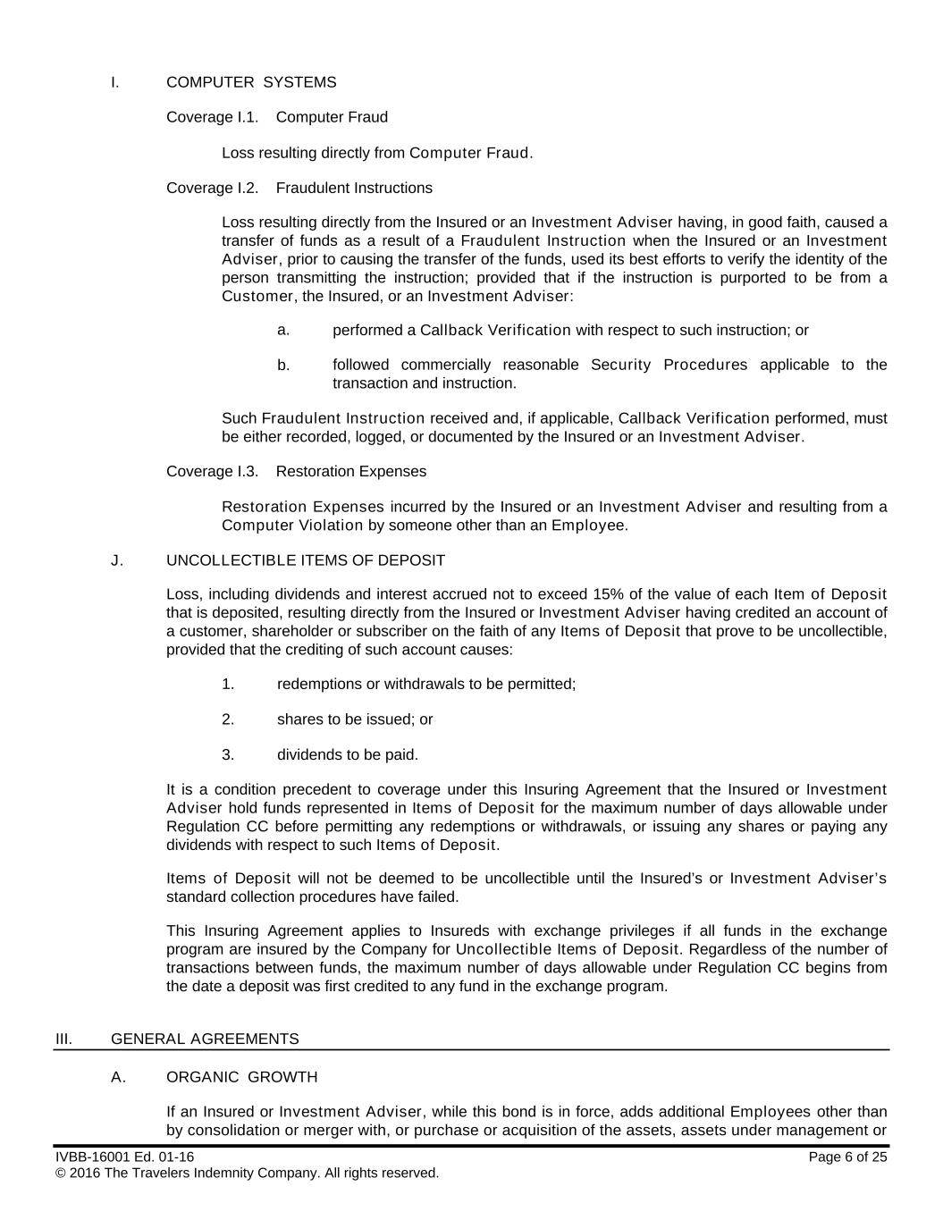 IVBB-16001版。01-16第6页,共25页©2016 The Travelers Indemnity Company。版权所有。一、计算机系统覆盖范围一、1。直接由计算机诈骗导致的计算机诈骗损失。覆盖范围I.2。欺诈性指令当被保险人或投资顾问在造成资金转移之前尽最大努力核实传递指令的人的身份时,由于欺诈性指令而导致资金转移的被保险人或投资顾问直接造成的损失;前提是,如果该指令声称来自客户、被保险人或投资顾问:就此类指令执行回拨验证;或b.遵循适用于交易和指令的商业上合理的安全程序。收到的此类欺诈指示以及(如适用)执行的回拨验证必须由被保险人或投资顾问记录、记录或记录。覆盖范围I.3。修复费用指被保险人或投资顾问因雇员以外的人的计算机违规行为而产生的修复费用。J.不可收回的存款损失项目,包括应计不超过所存入的每一存款项目价值15%的股息和利息,直接源于被保险人或投资顾问对任何被证明无法收回的存款项目的信任而将其记入客户、股东或认购人的账户,前提是该账户的贷记导致:1.允许赎回或提取;2.发行股票;或3.支付股息。本保险协议项下承保的先决条件是,被保险人或投资顾问在允许任何赎回或提款,或就该等存款项目发行任何股份或支付任何股息之前,持有存款项目中所代表的资金的最长天数符合《CC条例》的规定。在被保险人或投资顾问的标准收款程序失败之前,不会将存款项目视为无法收回。如果兑换计划中的所有资金均由公司为无法收回的存款项目投保,则本保险协议适用于具有兑换特权的被保险人。无论基金之间的交易次数如何,CC条例允许的最长天数从存款首次记入兑换计划中任何基金的日期开始。iii.一般协议A.有机增长如果被保险人或投资顾问在本债券生效期间,增加了额外的雇员,而不是通过合并或合并,或购买或收购资产、管理下的资产或a。