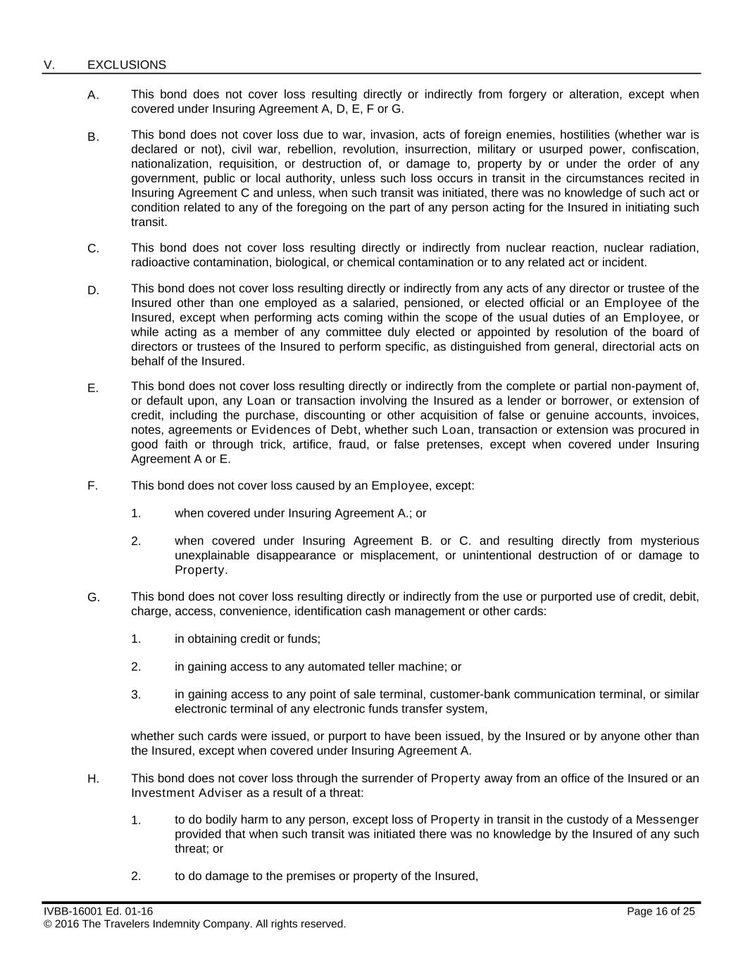 IVBB-16001版。01-16第16页,共25页©2016 The Travelers Indemnity Company。版权所有。五、除外责任A.本保证金不涵盖直接或间接因伪造或变造而造成的损失,除非在投保协议A、D、E、F或G下涵盖。B.本保证金不涵盖因战争、入侵、外敌行为、敌对行动(无论是否宣战)、内战、叛乱、革命、叛乱、军事或篡权、由任何政府、公共或地方当局或根据其命令没收、国有化、征用或破坏或损坏财产造成的损失,除非此类损失在投保协议C所述情况下发生在运输途中,除非,在启动此类过境时,代表被保险人的任何人在启动此类过境时并不知道与上述任何一项有关的此类行为或条件。C.本保证金不包括核反应、核辐射、放射性污染、生物、化学污染或任何相关行为或事件直接或间接造成的损失。D.本保证金不包括任何董事或被保险人受托人的任何行为直接或间接导致的损失,但受雇为受薪人员、退休人员或当选官员或被保险人的雇员的董事或受托人除外,除非在执行属于雇员通常职责范围内的行为时,或在担任由被保险人的董事会或受托人决议正式选出或任命的任何委员会的成员时,代表被保险人执行与一般董事行为不同的特定董事行为。E.本保函不涵盖因涉及被保险人作为贷款人或借款人的任何贷款或交易的全部或部分未付款或违约、或信贷展期直接或间接导致的损失,包括购买、贴现或以其他方式获得虚假或真实的账户、发票、票据、协议或债务证据,无论此类贷款、交易或展期是出于善意或通过诡计、诡计、欺诈或虚假借口获得的,除非在保险协议A或E. F项下涵盖,本保函不涵盖由雇员造成的损失,除:1.在投保协议A项下承保时;或2.在投保协议B项或C项下承保时,且直接由神秘的无法解释的消失或错位,或非故意破坏或损坏财产所致。G.本保证金不包括因使用或声称使用贷记、借记、收费、存取、便利、身份现金管理或其他卡而直接或间接造成的损失:1.在获得信贷或资金方面;2.在获得任何自动柜员机的存取权方面;或3.在获得任何销售点终端、客户银行通信终端或任何电子资金转账系统的类似电子终端的存取权方面,无论这些卡是由被保险人或被保险人以外的任何人发行的,或声称已发行,除非根据保险协议A.H.承保,本保证金不承保因受到威胁而在被保险人的办公室或投资顾问之外交出财产而造成的损失:1.对任何人造成人身伤害,但由信使保管的在途财产损失除外,条件是在启动此类转运时,被保险人不知道任何此类威胁;或2.对被保险人的房地或财产造成损害,