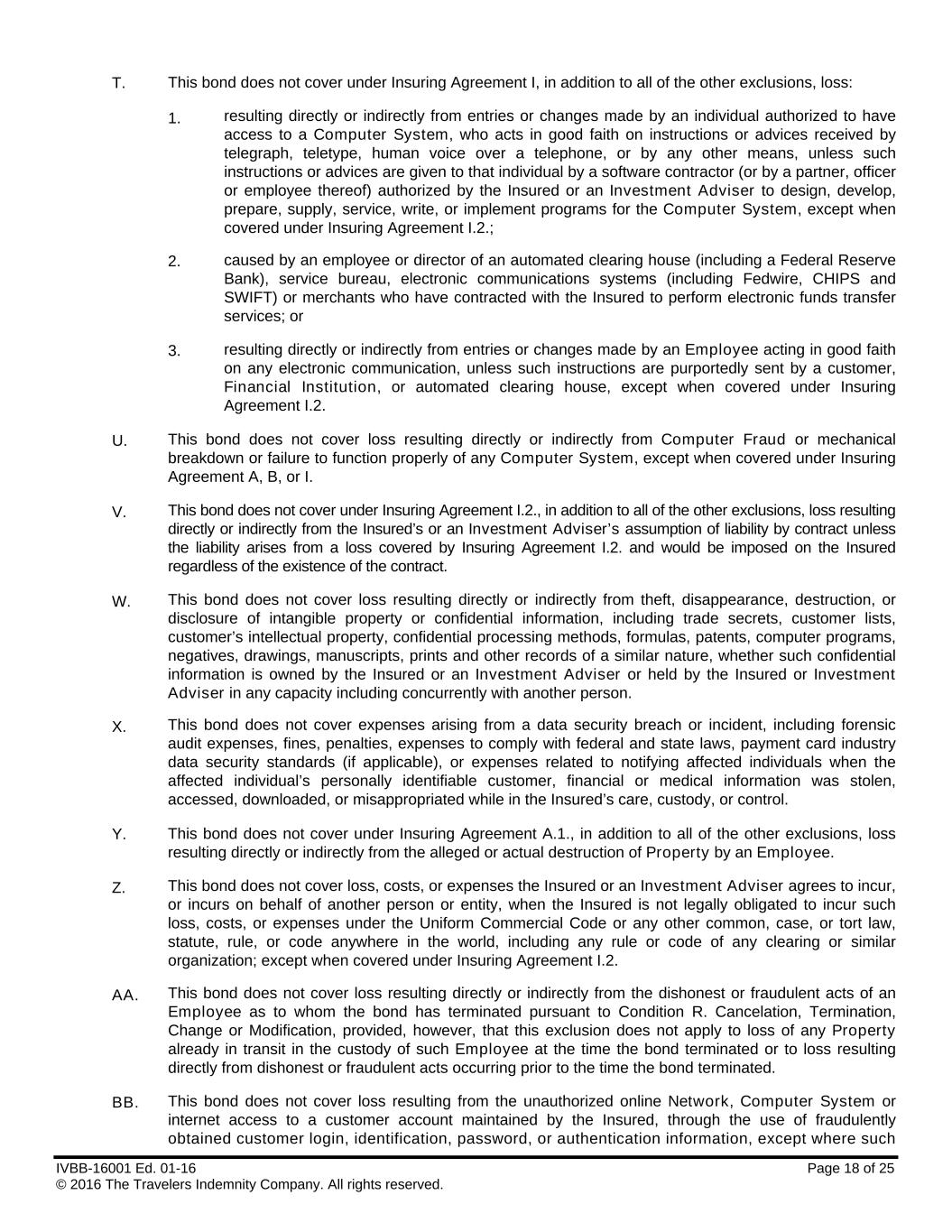 IVBB-16001版。01-16第25页第18页©2016 The Travelers Indemnity Company。版权所有。T.除所有其他除外责任外,本保证金不涵盖投保协议I项下的损失:1.直接或间接由被授权访问计算机系统的个人根据电报、电传打字、电话人声或任何其他方式收到的指示或建议善意行事而直接或间接导致的,除非此类指示或建议是由受保人或投资顾问授权设计、开发、准备、供应的软件承包商(或其合作伙伴、高级职员或雇员)向该个人发出的,为计算机系统提供服务、编写或实施程序,除非保险协议I.2.涵盖;2.由自动清算所(包括联邦储备银行)、服务局、电子通信系统(包括FedWire、CHIPS和SWIFT)的雇员或主管或与被保险人签约执行电子资金转账服务的商家造成;或3.直接或间接由善意行事的雇员对任何电子通信作出的录入或更改造成,除非这些指示据称是由客户、金融机构或自动清算所发送的,保险协议I.2涵盖的情况除外。U.本保函不涵盖直接或间接因计算机欺诈或任何计算机系统发生机械故障或无法正常运行而导致的损失,除非根据保险协议A、B或IV承保。除所有其他除外情况外,本保函不涵盖根据保险协议I.2.直接或间接因被保险人或投资顾问通过合同承担责任而导致的损失,除非该责任产生于保险协议I.2.承保的损失,并且无论合同是否存在都将强加给被保险人。W.本保证金不包括因盗窃、消失、毁坏或泄露无形财产或机密信息,包括商业秘密、客户名单、客户知识产权、机密处理方法、公式、专利、计算机程序、底片、图纸、手稿、印刷品和其他类似性质的记录而直接或间接造成的损失,无论这些机密信息是由被保险人或投资顾问拥有,还是由被保险人或投资顾问以任何身份持有,包括与他人同时持有。十、本保证金不包括因数据安全漏洞或事件而产生的费用,包括法证审计费用、罚款、处罚、遵守联邦和州法律的费用、支付卡行业数据安全标准(如适用),或在受保险人看管、保管或控制期间,当受影响个人的个人身份客户、财务或医疗信息被窃取、访问、下载或盗用时,与通知受影响个人有关的费用。Y.除所有其他除外责任外,本保证金不包括根据保险协议A.1.,因雇员声称或实际毁坏财产而直接或间接造成的损失。Z.当被保险人根据《统一商法典》或世界任何地方的任何其他共同、案例或侵权法、法规、规则或代码(包括任何清算或类似组织的任何规则或代码)没有法律义务承担此类损失、成本或费用时,本保证金不涵盖被保险人或投资顾问同意承担或代表他人或实体承担的损失、成本或费用;除非保险协议I.2涵盖的情况除外。AA。本保证金不包括根据条件R.取消、终止、变更或修改债券已终止的雇员的不诚实或欺诈行为直接或间接导致的损失,但此除外情形不适用于债券终止时该雇员保管中已在运输途中的任何财产的损失或债券终止前发生的不诚实或欺诈行为直接导致的损失。BB。本保证金不包括因使用骗取的客户登录、身份证明、密码或认证信息,擅自上网网络、计算机系统或互联网接入被保险人维护的客户账户而造成的损失,但如有