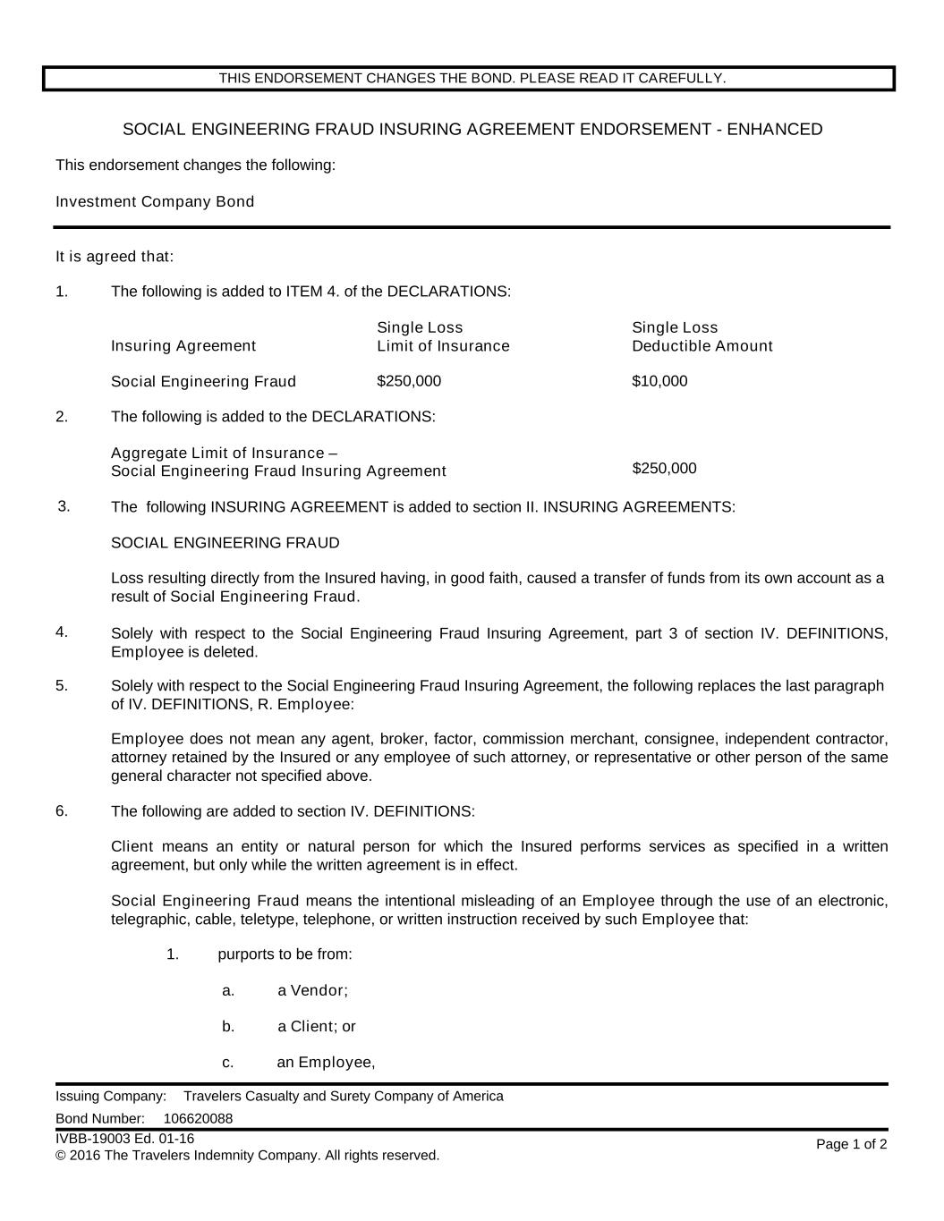 这种背书会改变债券。请仔细阅读。社会工程欺诈保险协议背书-增强本背书变更如下:投资公司债券同意:1。声明项目4.增加以下内容:保险单次损失限额单次损失免赔额保险协议社会工程诈骗250,000美元2。声明中添加了以下内容:保险总限额–社会工程欺诈保险协议250,000美元以下保险协议被添加到第II节中。投保协议:社会工程欺诈直接导致被保险人因社会工程欺诈而善意造成资金从自己账户转移的社会工程欺诈损失。4.仅就社会工程欺诈保险协议而言,第IV节第3部分。定义,员工被删除。5.仅就社会工程欺诈保险协议而言,以下取代IV最后一段。定义,R.雇员:雇员并非指任何代理人、经纪人、保理商、佣金商、收货人、独立承建商、被保险人聘请的律师或该律师的任何雇员,或代表或具有上述未指明的相同一般性质的其他人。6.第四节增加了以下内容。定义:客户是指被保险人按书面协议规定为其提供服务的实体或自然人,但仅限于书面协议生效期间。社会工程欺诈是指通过使用电子、电报、电报、电传打字、电话或该雇员收到的以下书面指示故意误导雇员:1.声称来自:a.供应商;b.客户;或c.雇员,10,000美元发行公司:Travelers Casualty and Surety Company of America债券编号:106620088 IVBB-19003 Ed。01-16©2016 The Travelers Indemnity Company。版权所有。第1页,共23页。