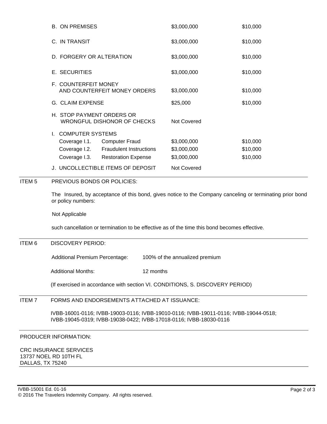 IVBB-15001版。01-16©2016年旅行者赔偿公司。版权所有。第2页,共3页B.关于房地$ 3,000,000 $ 10,000 C.过境$ 3,000,000 $ 10,000 D.伪造或变卖$ 3,000,000 $ 10,000 E.证券$ 3,000,000 $ 10,000 F.反洗钱和反洗钱订单$ 3,000,000 $ 10,000 G.索赔费用$ 25,000 $ 10,000 H.停止支付订单或错误地拒付未涵盖的支票I.计算机系统覆盖范围I.1。计算机诈骗$ 3,000,000 $ 10,000保险范围I.2。欺诈指令$ 3,000,000 $ 10,000保险范围I.3。修复费用3,000,000美元10,000美元J.未涵盖项目5的不可收回存款项目以前的债券或保单:被保险人通过接受这笔债券,向公司发出取消或终止先前的债券或保单编号的通知:不适用此类取消或终止自该债券生效时起生效。项目6发现期:附加保费百分比:100%年化保费附加月份:12个月(如按照第六节行使。条件,S. Discovery Period)Item 7 Forms and endorsements attached at Issuance:IVBB-16001-0116;IVBB-19003-0116;IVBB-19010-0116;IVBB-19011-0116;IVBB-19044-0518;IVBB-19045-0319;IVBB-19038-0422;IVBB-17018-0116;IVBB-18030-0116 Producer Information:CRC Insurance Services 13737 NOEL RD 10th FL DALLAS,TX 75240