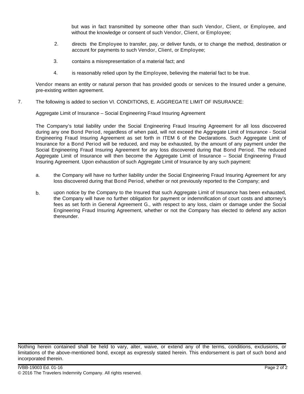 但事实上由该等卖方、客户或雇员以外的人传送,且未经该等卖方、客户或雇员知悉或同意;指示该雇员转移、支付或交付资金,或更改向该等卖方、客户或雇员付款的方式、目的地或账户;3.包含对重大事实的虚假陈述;以及4.被该雇员合理依赖,认为该重大事实是真实的。卖方是指根据真实的、预先存在的书面协议向被保险人提供商品或服务的实体或自然人。7.第六节新增以下内容。条件,E.保险的总限额:保险的总限额–社会工程欺诈保险协议公司根据社会工程欺诈保险协议对在任何一个保证期内发现的所有损失承担的总责任,无论何时支付,将不超过声明第6项规定的保险的总限额-社会工程欺诈保险协议。对于在该债券期间发现的任何损失,该债券期间的此类保险总限额将减少,并可能用尽,金额为根据社会工程欺诈保险协议支付的任何款项。降低后的保险总限额随后将成为保险总限额–社会工程欺诈保险协议。在任何该等付款用尽该等保险总限额后:a.公司将不会根据社会工程欺诈保险协议对在该保证期内发现的任何损失承担进一步责任,无论先前是否向公司报告;及b.一旦公司通知被保险人该等保险总限额已用尽,公司将不会就任何损失承担一般协议G中规定的支付或赔偿法庭费用和律师费的进一步义务,社会工程欺诈保险协议项下的索赔或损害,无论公司是否选择根据该协议对任何诉讼进行抗辩。2.本文所载的任何内容均不得被视为更改、更改、放弃或延长上述债券的任何条款、条件、除外责任或限制,除非本文明确说明。该背书是此类债券的一部分,并纳入其中。IVBB-19003编。01-16©2016 The Travelers Indemnity Company。版权所有。第2页,共2页