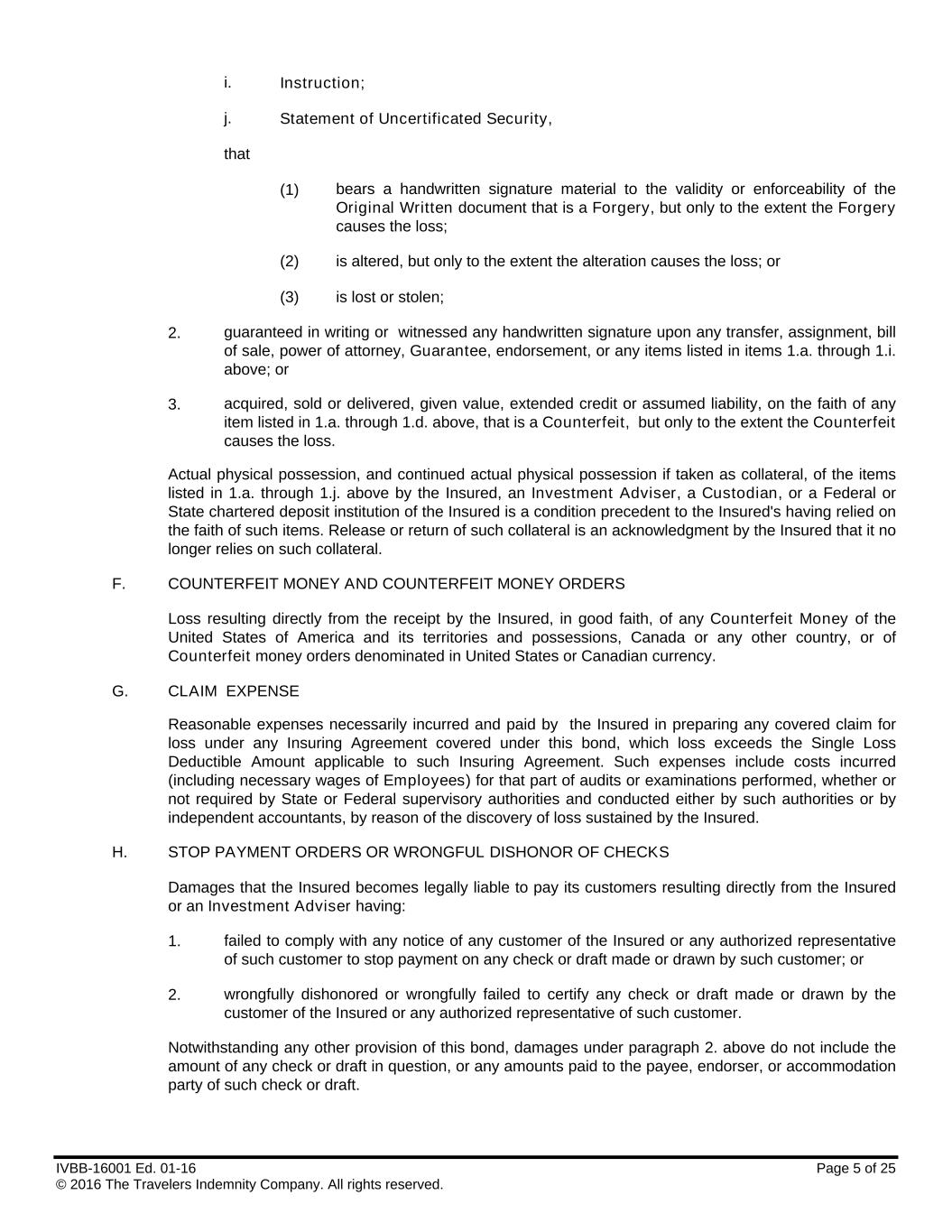 IVBB-16001版。01-16第5页,共25页©2016 The Travelers Indemnity Company。版权所有。i.指示;j.无证明担保声明,指(1)对属于伪造的原始书面文件的有效性或可执行性载有手写签字材料,但仅限于伪造造成灭失的程度;(2)被涂改,但仅限于该涂改造成灭失的程度;或(3)遗失或被盗;2.在任何转让、转让、销售票据、授权书、保证、背书或上述1.a.至1.i.项所列任何事项上以书面保证或见证任何手写签字;或3.取得、出售或交付,给定的价值、提供的信用或承担的责任,对上述1.a.至1.d.中所列的任何物品的信任,即为假货,但仅限于假货造成损失的程度。被保险人、投资顾问、托管人或被保险人的联邦或州特许存款机构对上述1.a.至1.j.所列物品的实际实际占有,以及如果作为抵押品继续实际占有,是被保险人依赖此类物品的信仰的先决条件。解除或返还此类担保物,是被保险人对其不再依赖此类担保物的确认。F. CounterfeIT MONEY和CounterfeIT MONEY ORDER损失直接由被保险人善意地收到美利坚合众国及其领土和属地、加拿大或任何其他国家的任何假币或以美国或加拿大货币计价的假钞而导致的损失。G.索赔费用被保险人在准备本保函项下涵盖的任何保险协议项下的任何承保损失索赔时必然发生和支付的合理费用,该损失超过适用于该保险协议的单一损失可扣除金额。此类费用包括因发现被保险人遭受的损失而为所进行的审计或检查的该部分所产生的费用(包括雇员的必要工资),无论是否有州或联邦监督当局要求,并由这些当局或独立会计师进行。H.停止付款订单或错误地不兑现支票受保人直接因被保险人或投资顾问具有以下行为而对其客户承担支付法律责任的损害赔偿:1.未遵守被保险人的任何客户或该客户的任何授权代表的任何通知,以停止支付该客户所制作或提取的任何支票或汇票;或2.错误地不兑现或错误地未证明被保险人的客户或该客户的任何授权代表所制作或提取的任何支票或汇票。尽管有本保证金的任何其他规定,上述第2款下的损害赔偿不包括任何有关支票或汇票的金额,或支付给此类支票或汇票的收款人、背书人或通融方的任何金额。