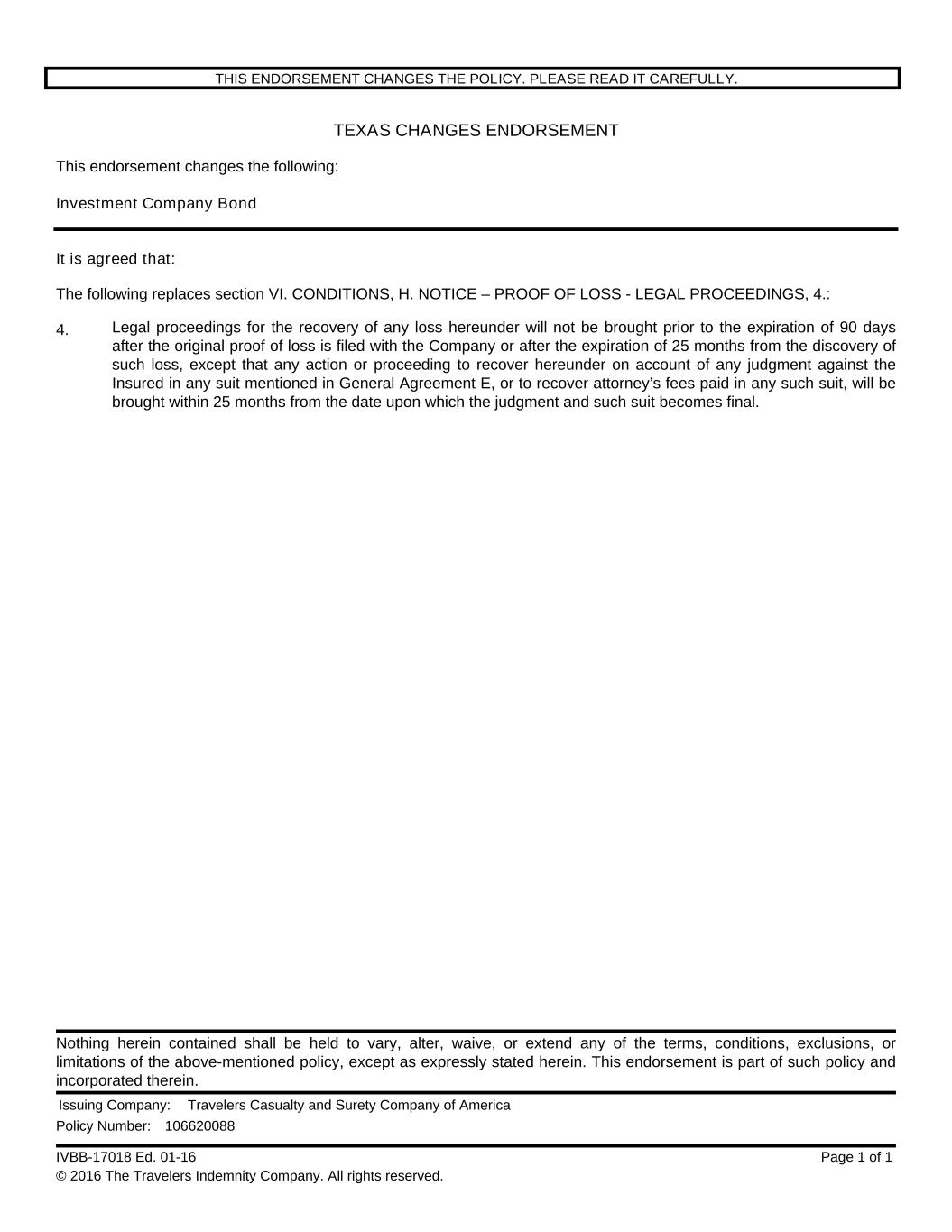 这一认可改变了政策。请仔细阅读。TEXAS更改背书此背书更改如下:投资公司债券同意:以下取代第六节。条件,H.通知–损失证明-法律程序,4。:4。本协议项下任何损失的追偿法律程序将不会在向公司提交原始损失证明后90天届满前或自发现该损失后25个月届满后提起,但因在总协议E中提及的任何诉讼中对被保险人作出任何判决而根据本协议进行的任何追偿诉讼或追讨在任何该等诉讼中支付的律师费的任何诉讼或程序将在该判决和该诉讼成为最终判决之日起25个月内提起。本文所载的任何内容均不得被视为更改、更改、放弃或扩展上述政策的任何条款、条件、排除或限制,除非本文明确说明。这一背书是此类政策的一部分,并被纳入其中。IVBB-17018版。01-16©2016 The Travelers Indemnity Company。版权所有。第1页,共1页发行公司:Travelers Casualty and Surety Company of America保单编号:106620088