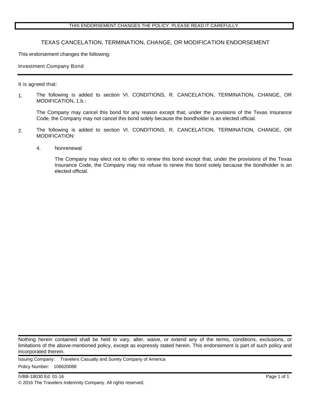 这一认可改变了政策。请仔细阅读。TEXAS注销、终止、变更或修改背书本背书变更如下:投资公司债券约定:1。第六节新增以下内容。条件,R.取消、终止、变更或修改,1.b.:公司可出于任何原因取消本次债券,但根据德州保险法的规定,公司不得仅因为债券持有人是民选官员而取消本次债券。2.第六节新增以下内容。条件、R.取消、终止、变更或修改:4。不展期公司可选择不提出展期本次债券,但根据德州保险法的规定,公司不得仅因债券持有人是经选举产生的官员而拒绝展期本次债券。本文所载的任何内容均不得被视为更改、更改、放弃或扩展上述政策的任何条款、条件、排除或限制,除非本文明确说明。这一背书是此类政策的一部分,并被纳入其中。IVBB-18030版。01-16©2016 The Travelers Indemnity Company。版权所有。第1页,共1页发行公司:Travelers Casualty and Surety Company of America保单编号:106620088