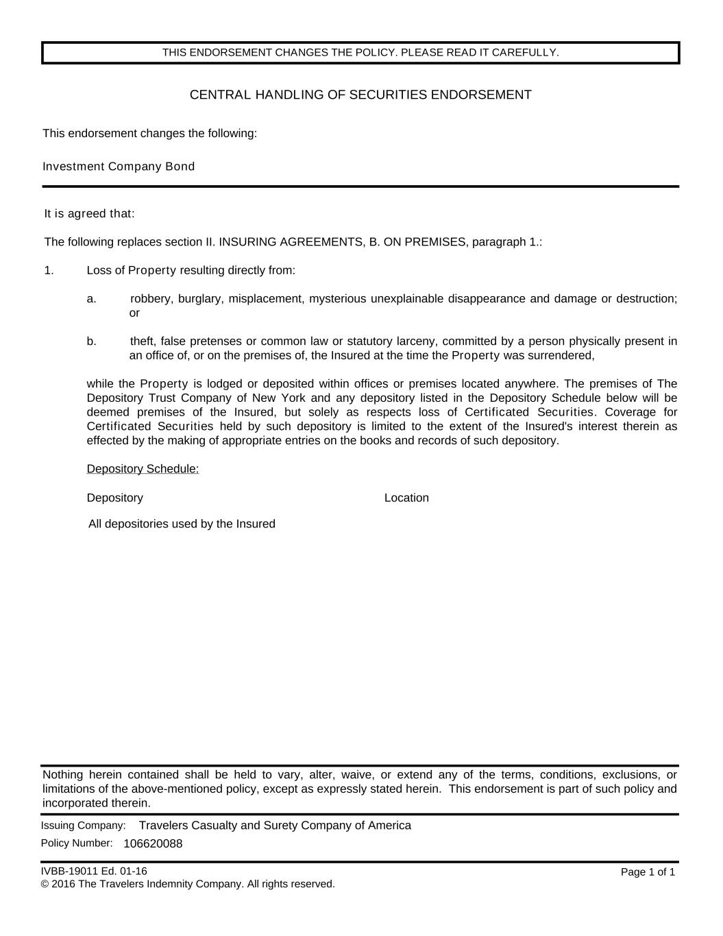 第1页,共1页本文所载的任何内容均不得被视为更改、更改、放弃或扩展上述政策的任何条款、条件、排除或限制,除非本文明确说明。这一背书是此类政策的一部分,并被纳入其中。发行公司:Travelers Casualty and Surety Company of America保单编号:106620088 IVBB-19011 Ed。01-16©2016 The Travelers Indemnity Company。版权所有。这一认可改变了政策。请仔细阅读。证券背书的中央处理本背书变更如下:投资公司债券同意:以下取代第二节。保险协议,B.关于房地,第1款。:1。直接导致的财产损失:a.抢劫、入室盗窃、放错地方、神秘的无法解释的失踪和损坏或破坏;或b.盗窃、虚假借口或普通法或法定盗窃,由在交出财产时实际存在于被保险人的办公室或场所内的人实施,而财产存放在位于任何地方的办公室或场所内。纽约存管信托公司的处所和以下存管附表所列的任何存管机构将被视为被保险人的处所,但仅作为凭证证券的损失。该存管机构持有的凭证式证券的承保范围仅限于在该存管机构的簿册和记录上作出适当分录所影响的被保险人在其中的利益范围。存管明细表:存管地点被保险人使用的所有存管
