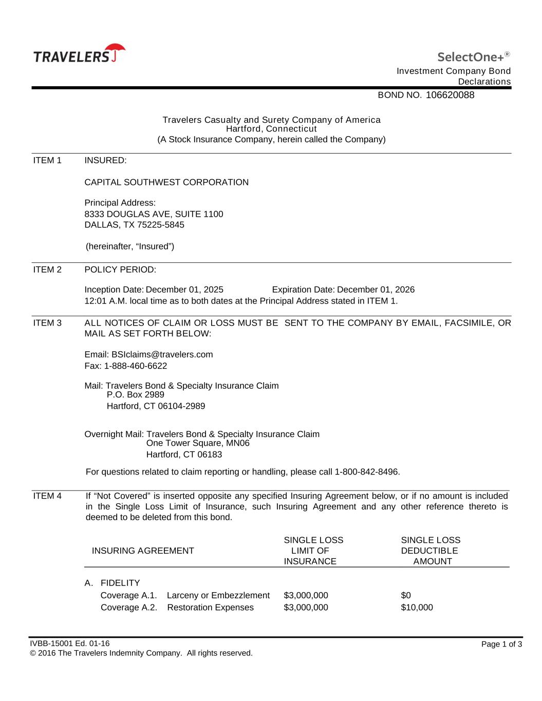 IVBB-15001版。01-16©2016 The Travelers Indemnity Company。版权所有。第1页,共3页投资公司债券申报债券NO.106620088 Travelers Casualty and Surety Company of America Hartford,Connecticut(a stock insurance company,在此称为公司)项目1投保:CAPITAL SOUTHWEST CORPORATION主地址:8333 DOUGLAS AVE,SUITE 1100 DALLAS,TX 75225-5845(以下简称“已投保”)项目2保单期限:成立日期:2025年12月1日到期日:2026年12月1日上午12:01当地时间两个日期均为项目1所述主地址。项目3所有索赔或损失通知必须通过电子邮件、传真或如下所列邮件发送给公司:电子邮件:BSIclaims@travelers.com传真:1-888-460-6622邮件:Travelers Bond & Specialty Insurance Claim P.O. Box 2989 Hartford,CT 06104-2989隔夜邮件:Travelers Bond & Specialty Insurance Claim One Tower Square,MN06 Hartford,CT 06183有关索赔报告或处理的问题,请致电1-800-842-8496。项目4如果在下文任何指定的投保协议的对面插入“未涵盖”,或者如果保险的单一损失限额中没有包含任何金额,则该投保协议及其任何其他提及均视为从本保证金中删除。保险协议单笔损失限额保险单笔损失可抵扣金额A.诚信保障范围A.1。盗窃或挪用公款3,000,000美元0美元保险范围A.2。修复费用$ 3,000,000 $ 10,000