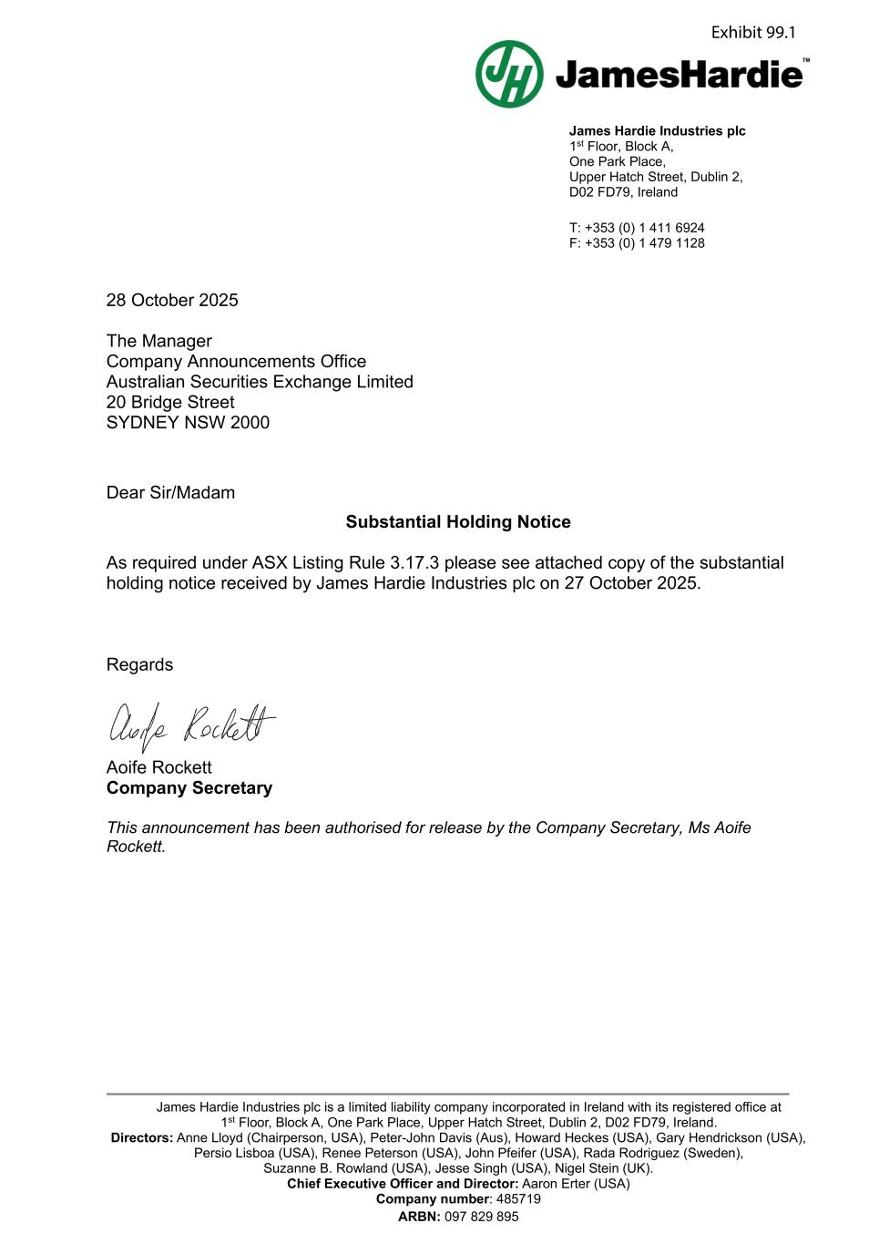 詹姆斯哈迪 plc 1st Floor,One Park Place,Upper Hatch Street,Dublin 2,D02 FD79,Ireland电话:+ 353(0)14116924 F:+ 353(0)14791128 詹姆斯哈迪 plc是一家在爱尔兰注册成立的有限责任公司,注册办事处位于爱尔兰D02 FD79,Dublin 2,Upper Hatch Street,One Park Place,Block A座1st Floor。董事:Anne Lloyd(主席,美国)、彼得-约翰·戴维斯(澳大利亚)、Howard Heckes(美国)、Gary Hendrickson(美国)、TERM2(美国)、Persio Lisboa(美国)、Renee Peterson(美国)、John Pfeifer(美国)、Rada Rodriguez(瑞典)、Suzanne B. Rowland(美国)、TERM4(美国)、Jesse Singh(美国)、Nigel Stein(英国)。首席执行官兼董事:Aaron Erter(USA)公司编号:485719 ARBN:0978298952025年10月28日管理人公司公告办公室Australian Securities Exchange Limited 20 Bridge Street SYDNEY NSW 2000尊敬的先生/女士根据ASX上市规则第3.17.3条的要求发出的实质性持股通知,请参阅附件中所附的詹姆斯哈迪plc于2025年10月27日收到的实质性持股通知的副本。关于Aoife Rockett公司秘书本公告已获公司秘书Aoife Rockett女士授权发布。