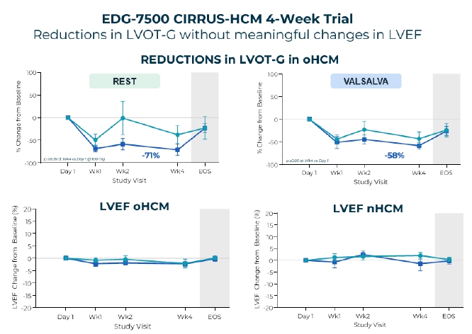 CIRRUS-HCM是一项EDG-7500在HCM个体中的多部分、开放标签试验。2024年9月,该公司公布了来自试验A部分的积极顶线数据,显示在患有阻塞性HCM的参与者中单次口服剂量EDG-7500显示出左心室流出道梯度(LVOT-G)的稳健降低,而左心室射血分数(LVEF)没有显着变化。