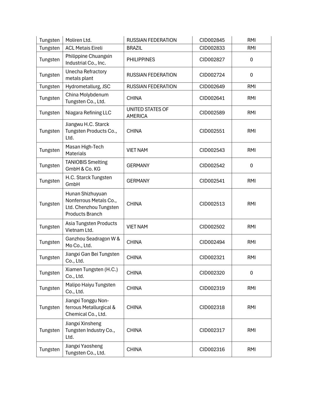 Moliren Tungsten Ltd. RUSSIAN FEDERATION CID002845 RMI Tungsten ACL METAI EIReli Brazil CID002833 RMI Tungsten Philippine Increase Industrial Co.,Inc. PHILIPPINES CID002827 0 Tungsten Unecha难熔金属厂RUSSIAN FEDERATION CID0027240 Tungsten Hydrometallurg,JSC RUSSIAN FEDERATION CID002649 RMITERMTungsten China Molybden Tungsten Co.,Ltd. China CID002641 RMI Tungsten Niagara Refining LLC United States of America CID002589 RMI Tungsten Jiangwu H.CLtDCHINA CID002551 RMI钨业Masan High-Tech Materials VIET NAM CID002543 RMI TANIOBIS Smelting GmbH & Co. KG Germany CID002542 0 Tungsten H.C. Starck Tungsten GmbH Germany CID002541 RMITERMTungsten湖南石竹园有色金属有限公司郴州钨品分公司中国CID002513 RMITERM3TERM3 Tungsten Asia Tungsten Products Vietnam Ltd. VIET NAM CID002502 RMI Tungsten Ganzhou Seadragon W & Mo Co. Ltd. CHINA CID002494 RMITERM5江西赣北钨业有限公司CHINA CID002321 RMI有限公司中国CID002319 RMI钨业江西铜鼓有色冶金化工股份有限公司中国CID002318 RMI钨业江西鑫盛钨业股份有限公司中国CID002317 RMIRMI江西耀盛钨业股份有限公司中国CID002316 TERM3