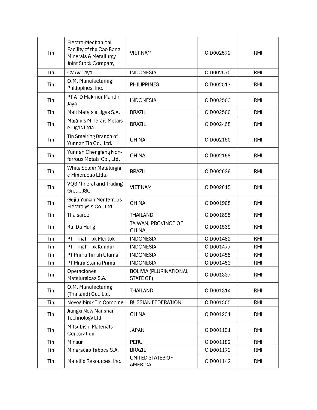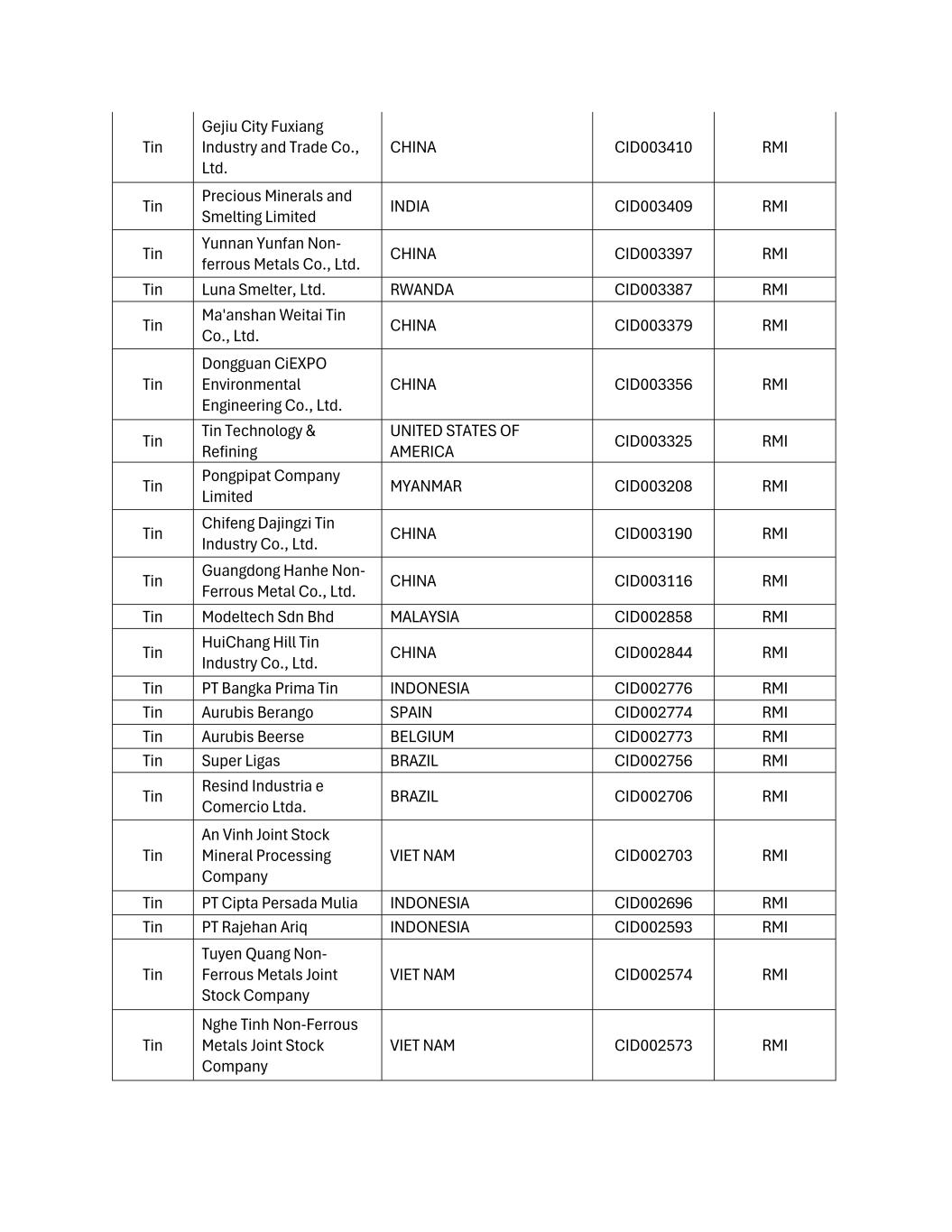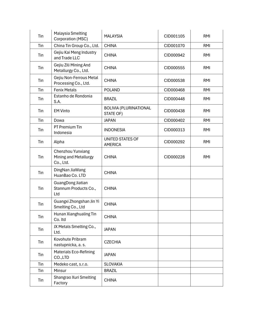 Tin Malaysia Smelting Corporation(MSC)Malaysia CID001105 RMI Tin China锡业集团有限公司中国CID001070 RMI Tin Gejiu Kai Meng Industry and Trade LLC中国CID000942 RMI Tin Gejiu Zili Mining and Metallurgy Co.,Ltd.中国CID000555 RMI Tin Gejiu有色金属加工有限公司,Ltd. China CID000538 RMI Tin Fenix Metals POLAND CID000468 RMI Tin Estanho de Rondonia S.A. Brazil CID000448 RMI Tin EM Vinto BOLIVIA(多民族国)CID000438 RMI Tin Dowa JAPAN CID000402 RMI Tin PT Premium Tin Indonesia Indonesia CID000313 RMI Tin Alpha美国CID000292 RMI Tin郴州云翔矿冶有限公司中国CID000228 RMI Tin DingNan Jiawang Co.,Ltd。Ltd. Japan Tin Kovohute Pribram nastupnicka,a. s. CZECHIA Tin Materials Eco-Refining CO.,LTD. Japan Tin Medeko Cast,s.r.o. Slovakia Tin Minsur Brazil Tin Shangrao Xuri Smelting Factory China