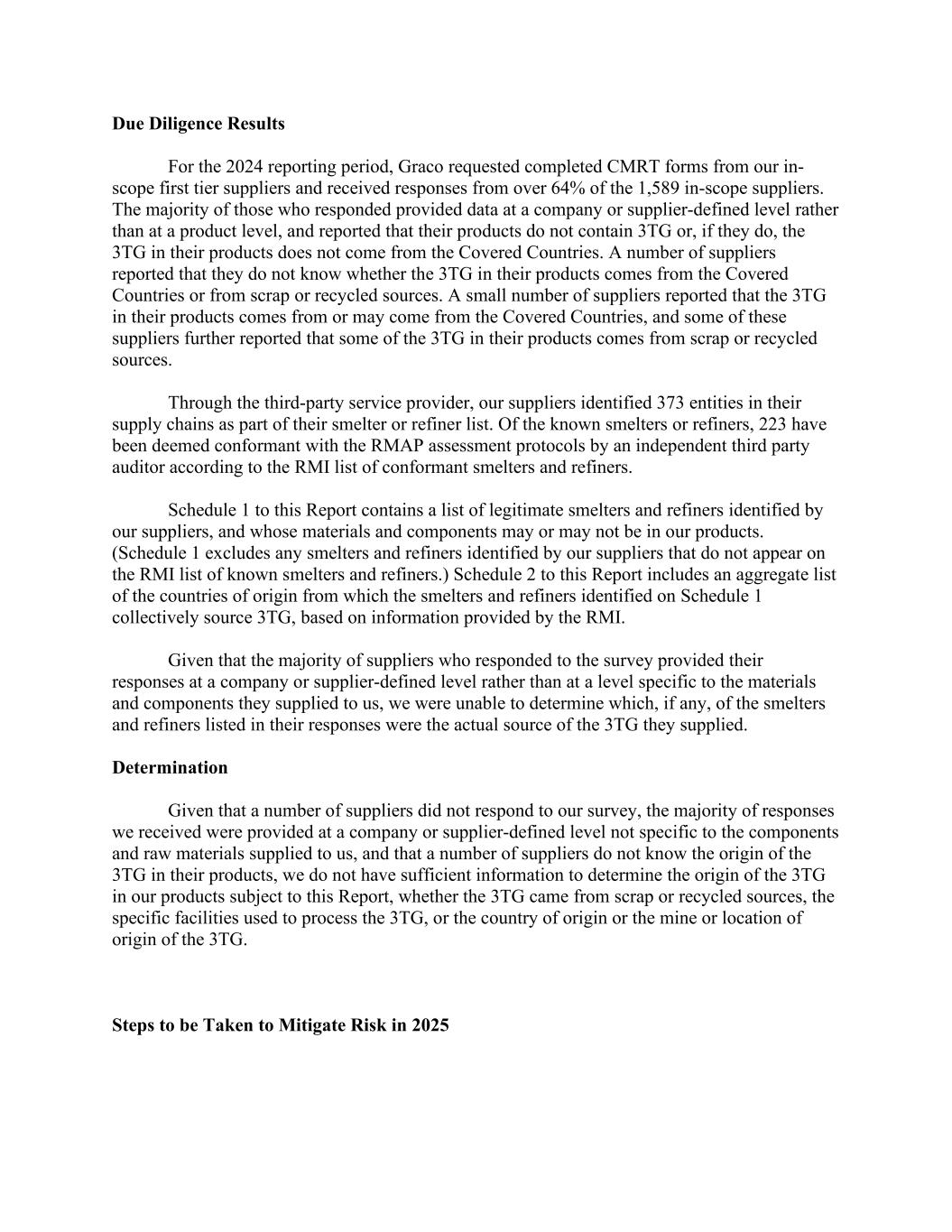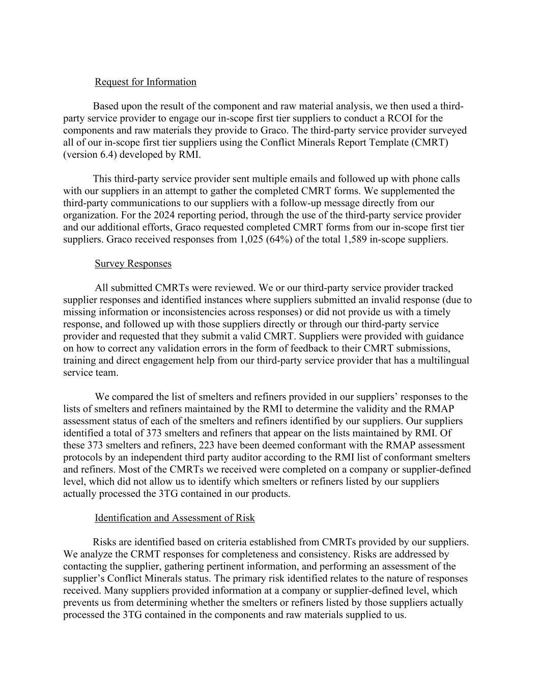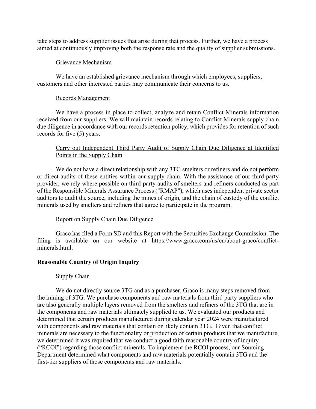 采取措施解决该过程中出现的供应商问题。此外,我们有一个流程,旨在不断提高应答率和供应商提交的质量。申诉机制我们有一个既定的申诉机制,员工、供应商、客户和其他利益方可以通过该机制向我们传达他们的关切。记录管理我们有一个适当的流程来收集、分析和保留从供应商处收到的冲突Minerals信息。我们将根据我们的记录保留政策维护与冲突Minerals供应链尽职调查相关的记录,该政策规定将此类记录保留五(5)年。在供应链中确定的点对供应链尽职调查进行独立的第三方审计我们与任何3TG冶炼厂或精炼厂没有直接关系,也不对我们供应链中的这些实体进行或直接进行审计。在我们的第三方供应商的协助下,我们尽可能依赖对冶炼厂和精炼商进行的第三方审计,这是负责任的Minerals保证流程(“RMAP”)的一部分,该流程使用独立的私营部门审计员来审计来源,包括原产地矿山,以及同意参与该计划的冶炼厂和精炼商使用的冲突矿物的保管链。关于供应链尽职调查的报告固瑞克已向美国证券交易委员会提交了表格SD和本报告。该文件可在我们的网站上查阅:https://www.graco.com/us/en/about-graco/conflict-minerals.html。合理的原产地询价供应链我们不直接采购3TG并且作为采购商,固瑞克是从3TG的开采中移除多个步骤的。我们从第三方供应商采购组件和原材料,这些供应商通常也是从3TG的冶炼厂和精炼厂中移除的多层,这些组件和原材料最终供应给我们。我们评估了我们的产品,并确定在2024日历年制造的某些产品是使用含有或可能含有3TG的组件和原材料制造的。鉴于冲突矿物对我们生产的某些产品的功能或生产是必要的,我们确定要求我们对这些冲突矿物进行诚信合理的调查国(“RCOI”)。为实施RCOI流程,我们的采购部门确定了哪些组件和原材料可能含有3TG以及这些组件和原材料的一级供应商。