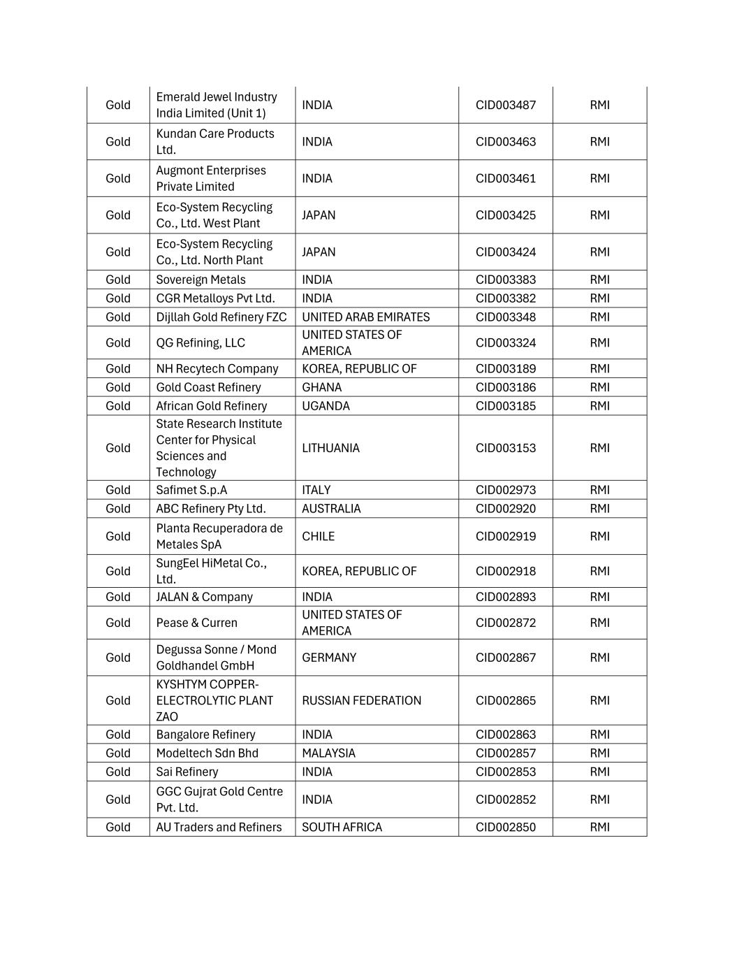 Gold Emerald Jewel Industry India Limited(Unit 1)India CID003487 RMI Gold Kundan Care Products Ltd. India CID003463 RMI Gold Augmont Enterprises Private Limited India CID003461 RMI Gold Eco-System Recycling Co.,Ltd. West Plant JAPAN CID003425 RMITERM3 Gold Eco-System Recycling Co.,Ltd. North Plant JAPAN CID003424 RMI Gold Sovereign Metals India CID003383 RMI Gold CGR Metalloys PVT Ltd. India CID003382 RMI Gold Dijllah Gold Refinery FZC UNITED Arab EMIRATESTCID003189共和国RMI黄金海岸炼油厂加纳CID003186 RMI黄金TERM1RMI Gold State Research Institute for Physical Sciences and Technology Center LITHUANIA CID003185 RMITERM1 Gold Safimet S.p.a ITALY CID002973 RMI Gold ABC Refinery Pty Ltd. Australia CID002920 TERM0 Gold Planta Recuperadora de Metales Spa CHILE CID002919 RMI Gold Sungeel HiMetal Co.,Ltd. Korea,CID002918共和国RMI Gold JALAN & Company India CID002893 RMI Gold Pease & Curren United States of America CID002872 RMI Gold Degussa Sonne/Mond Goldhandel GmbH Germany CID002867 丨RMI丨Gold KYSHTYM COPPER-Electrolytic Plant ZAO RUSian FEDERATION CID002865 丨RMI丨Gold Bangalore Refinery India CID002863 丨RMI丨Gold Modeltech Sdn Bhd Malaysia CID002857 丨RMI丨Gold Sai Refinery India CID002857
