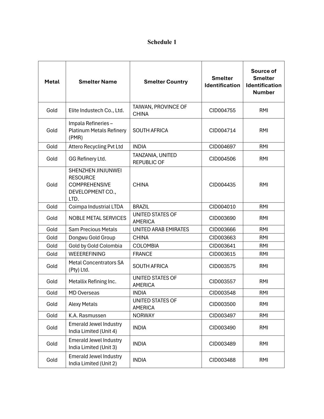 黄金SOE Shyolkovsky二次贵金属工厂俄罗斯联邦CID001756 RMI黄金四川天泽贵金属有限公司中国CID001736 RMITERM1黄金山东招金金银精制有限公司中国CID001622 RMI黄金山东天成生物黄金实业有限公司中国CID001619 RMI Gold SEMPSA Joyeria Plateria S.A.西班牙CID001585 RMI Gold Samwon Metals Corp. Korea,CID001562共和国RMI Gold Samduck Precious Metals Korea,CID001555共和国RMI Gold Sabin Metal Corp.美国CID001546 RMI Gold加拿大皇家铸币厂CID001534 RMI Gold Rand Refinery(Pty)Ltd.南非CID001512 RMITERM3 Gold PX Precinox S.A.瑞士CID001498 RMI Gold PT Aneka Tambang(Persero)Tbk印度尼西亚CID001397 RMI Gold Prioksky工厂有色金属俄罗斯联邦CID001386 RMI Gold蓬莱鹏港金业有限公司。Ltd. JAPAN CID001325 RMI Gold Nihon Material Co.,Ltd. JAPAN CID001259 RMI Gold Navoi Mining and Metallurgical Combinat UZBEKISTAN CID001236 RMI Gold Nadir Metal Rafineri San。Ve Tic。A.S.土耳其CID001220 RMI黄金莫斯科特种合金加工厂俄罗斯联邦CID001204 RMI黄金三井矿业冶炼有限公司日本CID001193 RMI
