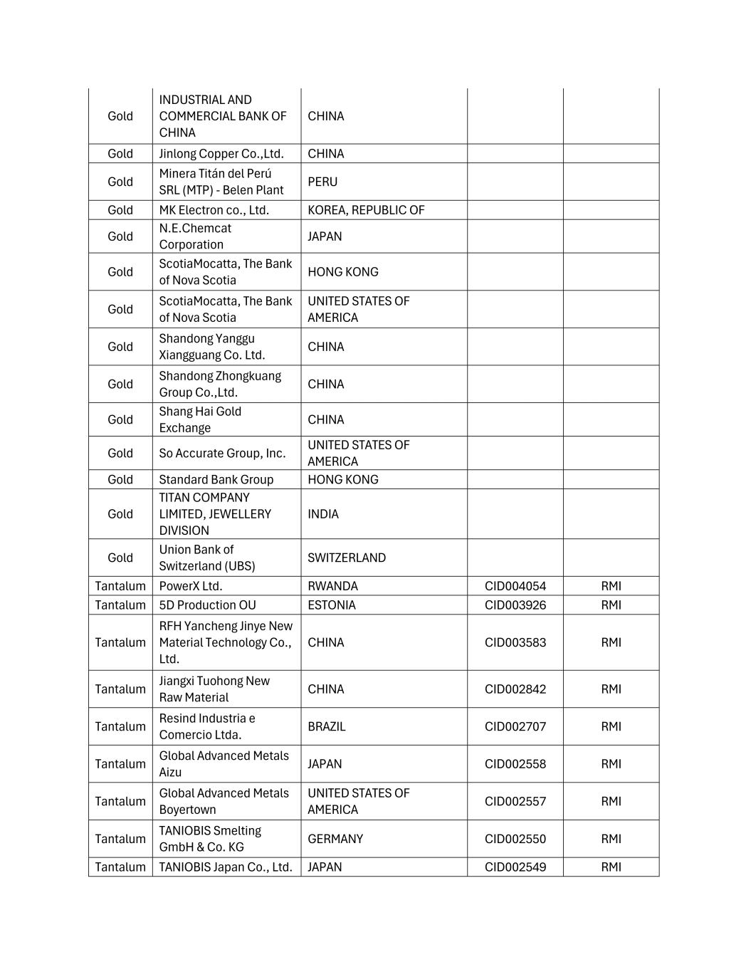 中国黄金工业和商业银行中国黄金金龙铜业有限公司中国黄金矿业TIT á n del Per ú SRL(MTP)-Belen Plant PERU Gold MK Electron Co.,Ltd. Korea,Republic of Gold N.E.Chemcat Corporation JAPAN Gold ScotiaMocatta,The Bank of Nova Scotia Hong Kong Gold ScotiaMocatta,the Bank of Nova Scotia United States of America Gold山东阳谷祥光有限公司中国黄金山东中矿集团有限公司中国黄金上海黄金交易所中国黄金So Accurate Group,Inc. United States of America珠宝司印度金联瑞士银行(UBS)SWITZERLAND Tantalum PowerX Ltd. RWANDA CID004054 RMI钽业5D生产OU ESTONIA CID003926 RMI钽业RFH盐城金业新材料科技有限公司中国CID003583 RMI钽业江西拓宏新原料中国CID002842 TERM3钽业树脂工业电子商务有限公司。巴西CID002707 RMI钽业全球先进金属会津日本CID002558 RMI钽业全球先进金属博雅敦美国CID002557 RMIRMI钽钽业冶炼有限公司KG德国CID002550 TERM3钽钽业日本有限公司JAPAN CID002549 RMI