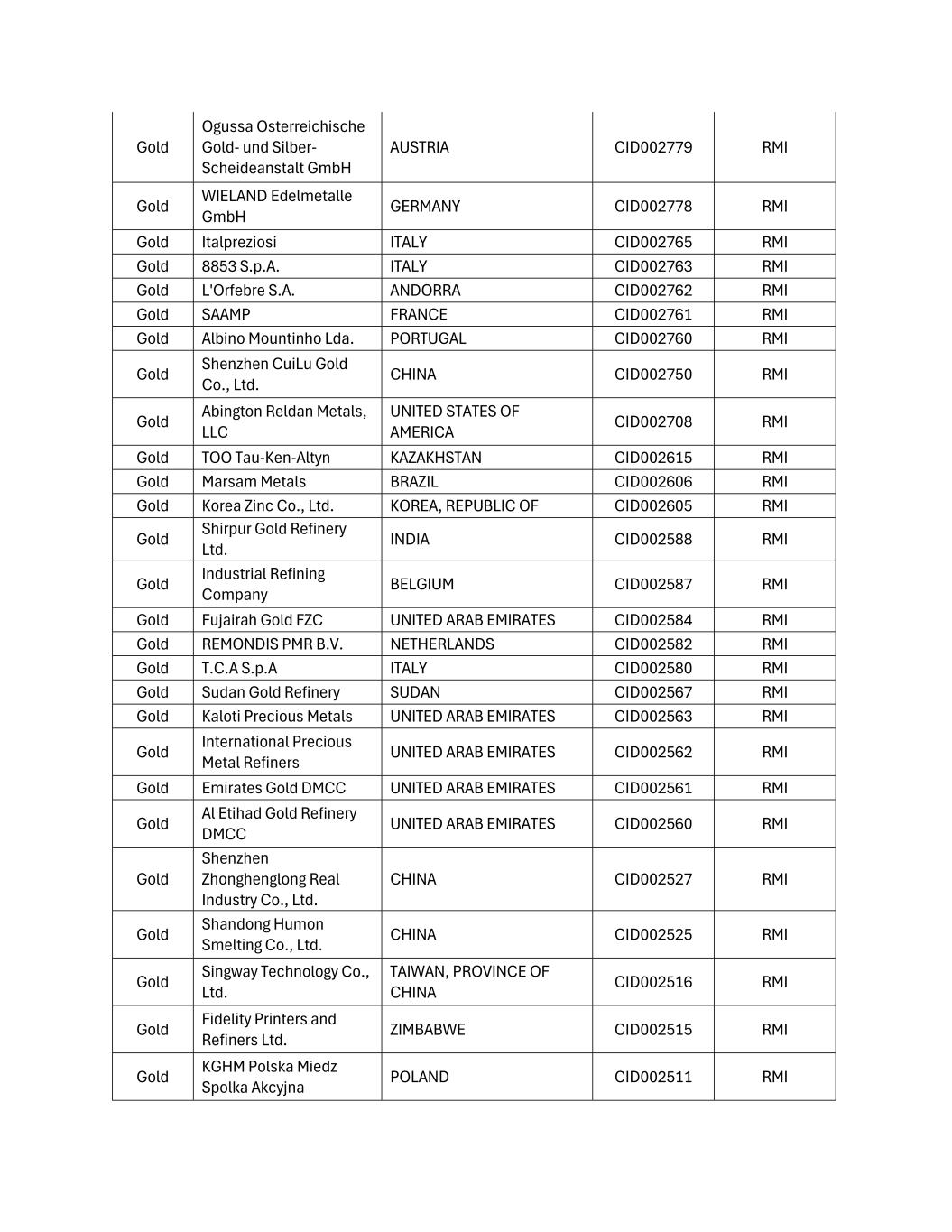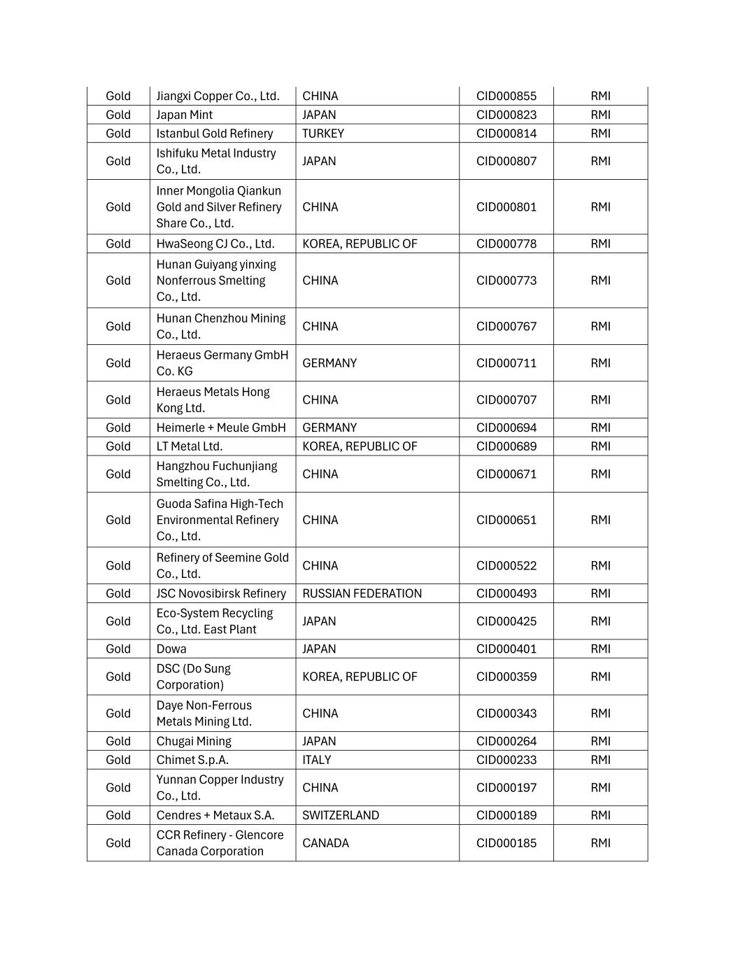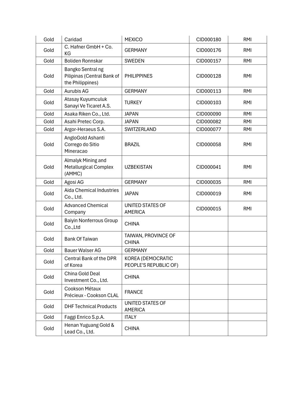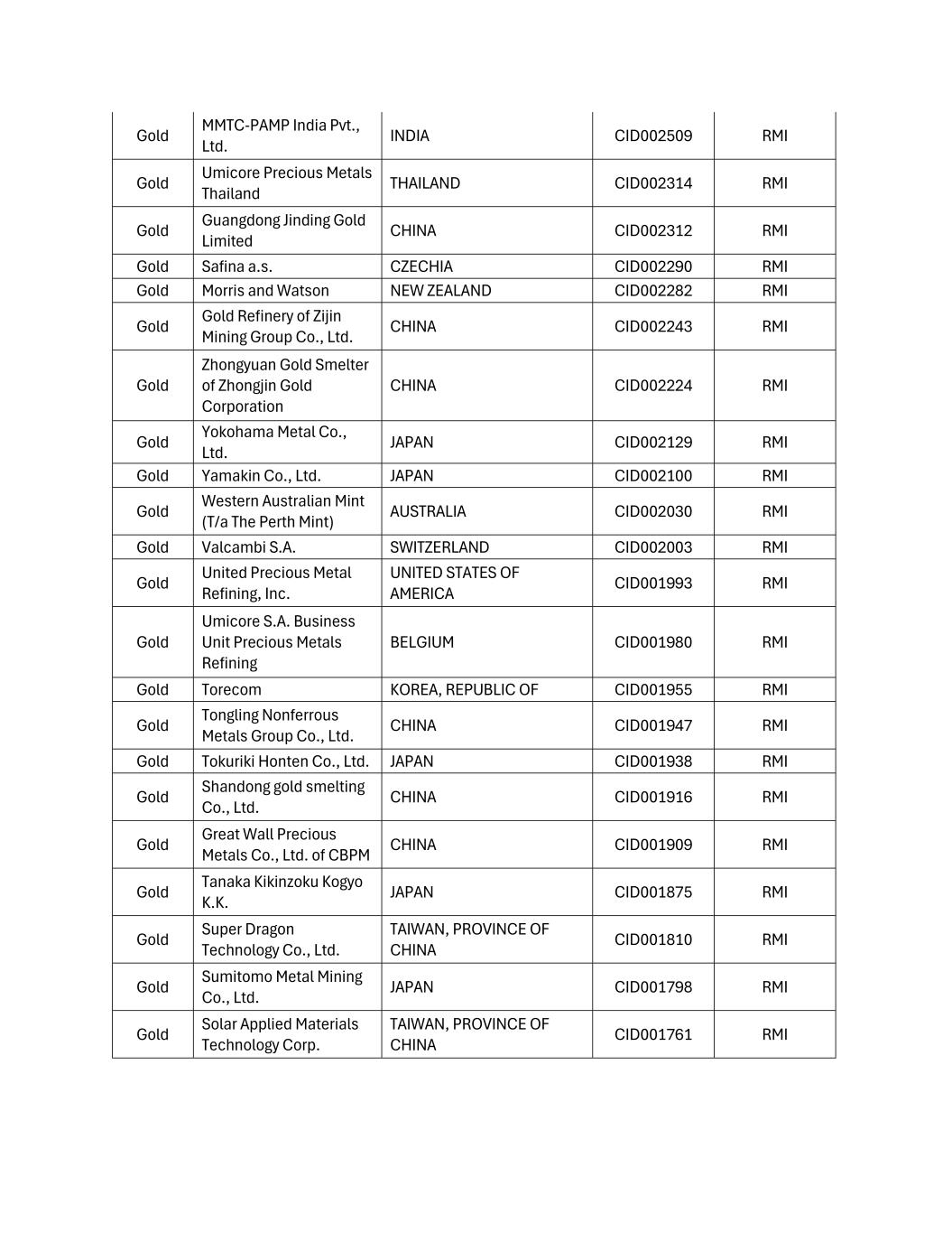 Gold MMTC-PAMP India Pvt.,Ltd.印度CID002509 RMI Gold Umicore Precious Metals泰国Thailand CID002314 RMI Gold Guangdong Jinding Gold Limited中国CID002312 RMI Gold Safina a.s. CZECHIA CID002290 RMITERM3 Gold Morris and Watson New Zealand CID002282 RMI ]紫金矿业集团有限公司黄金精炼厂中国CID002243 RMI丨中金黄金总公司中原黄金冶炼厂中国CID002224 RMI丨金横滨金属有限公司日本CID002129 RMI丨金YamakinInc.美国CID001993 RMI Gold Umicore S.A.业务部门贵金属精炼比利时CID001980 丨RMI丨金TORECOM韩国,CID001955共和国铜陵有色金属集团有限公司中国CID001947 RMI丨金Tokuriki Honten Co.,Ltd.日本CID001938丨RMI RMI丨金山东黄金冶炼有限公司中国CID001916 RMI丨金长城贵金属有限公司of CBPM中国CID001909丨RMI RMI丨金Tanaka Kikinzoku Kogyo K。Ltd. Japan CID001798 RMI Gold Solar 应用材料 Technology Corp. Taiwan,Province of China CID001761 RMI