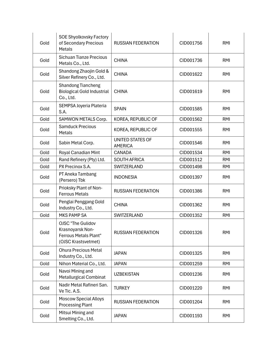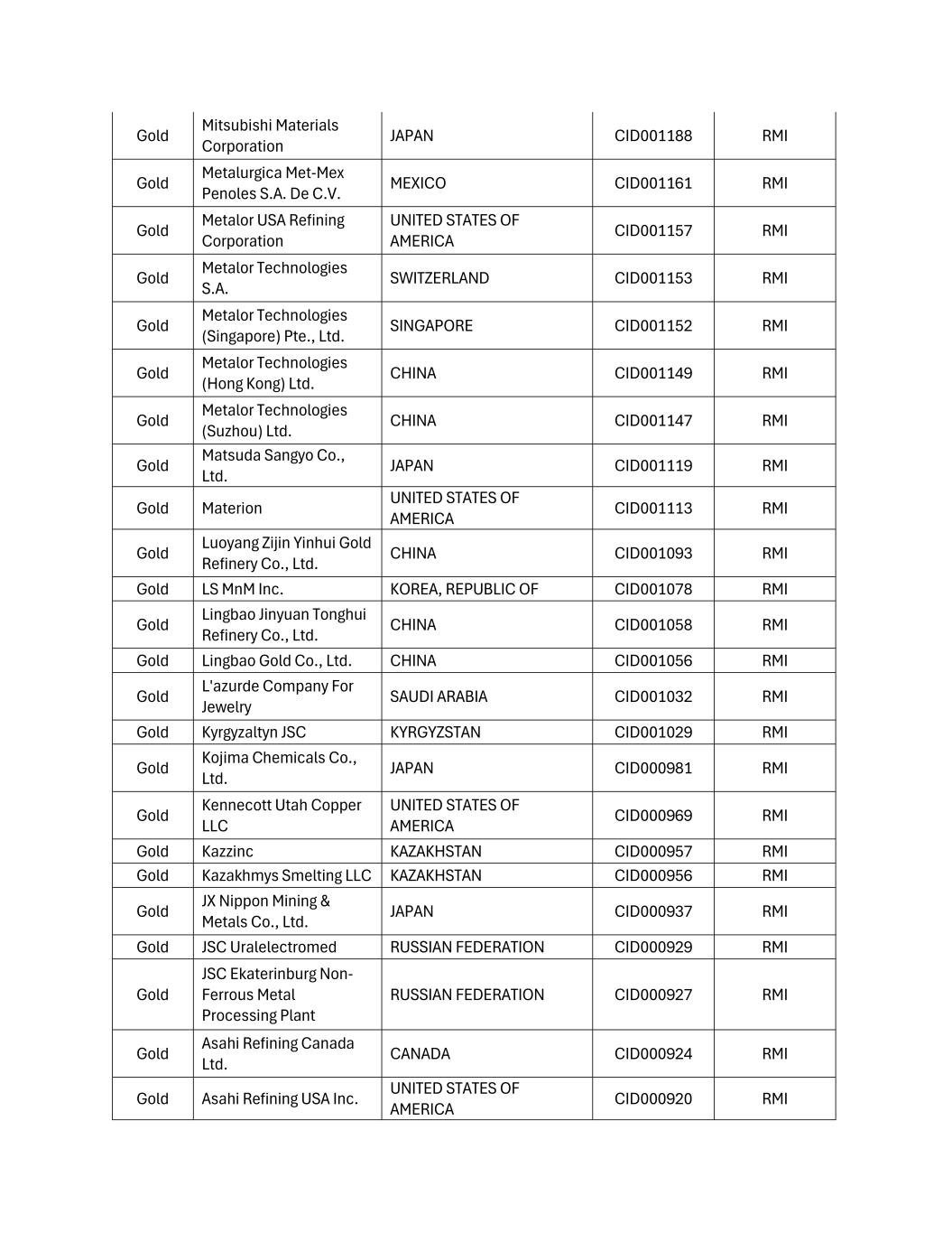 Gold Mitsubishi Materials Corporation JAPAN CID001188 RMI Gold Metalurgica Met-Mex Penoles S.A. De C.V. MEXICO CID001161 RMI Gold Metalor USA Refining Corporation United States of AMERICA CID001157 RMI Gold Metalor Technologies S.A. SWITZERLAND CID001153 RMITERM3 Gold Metalor Technologies(Singapore)Pte.,Ltd. Singapore CID001152 RMI Gold Metalor Technologies(Hong Kong)Ltd. China CID001149 RMI Gold Metalor Technologies(Suzhou)Ltd. China CID001147 RMI Gold Matsuda Sangyo Co。CID001078共和国RMI黄金灵宝金源同辉精炼厂有限公司中国CID001058 RMI黄金灵宝黄金有限公司中国CID001056 RMI Gold L'azurde公司珠宝沙特阿拉伯CID001032 RMITERM3 Gold Kyrgyzaltyn JSC KyrgyZSTAN CID001029 RMI Gold Kojima Chemicals Co.,Ltd. JAPAN CID000981 RMI Gold Kennecott Utah Copper LLC United States of America CID000969 RMI Gold Kazzinc哈萨克斯坦CID000957Ltd. JAPAN CID000937 RMI Gold JSC UralElectromed俄罗斯联邦CID000929 RMI Gold JSC Ekaterinburg有色金属加工厂俄罗斯联邦CID000927 RMI Gold Asahi Refining Canada Ltd. Canada CID000924 RMI Gold Asahi Refining USA Inc. United States of AMERICA CID000920 RMI