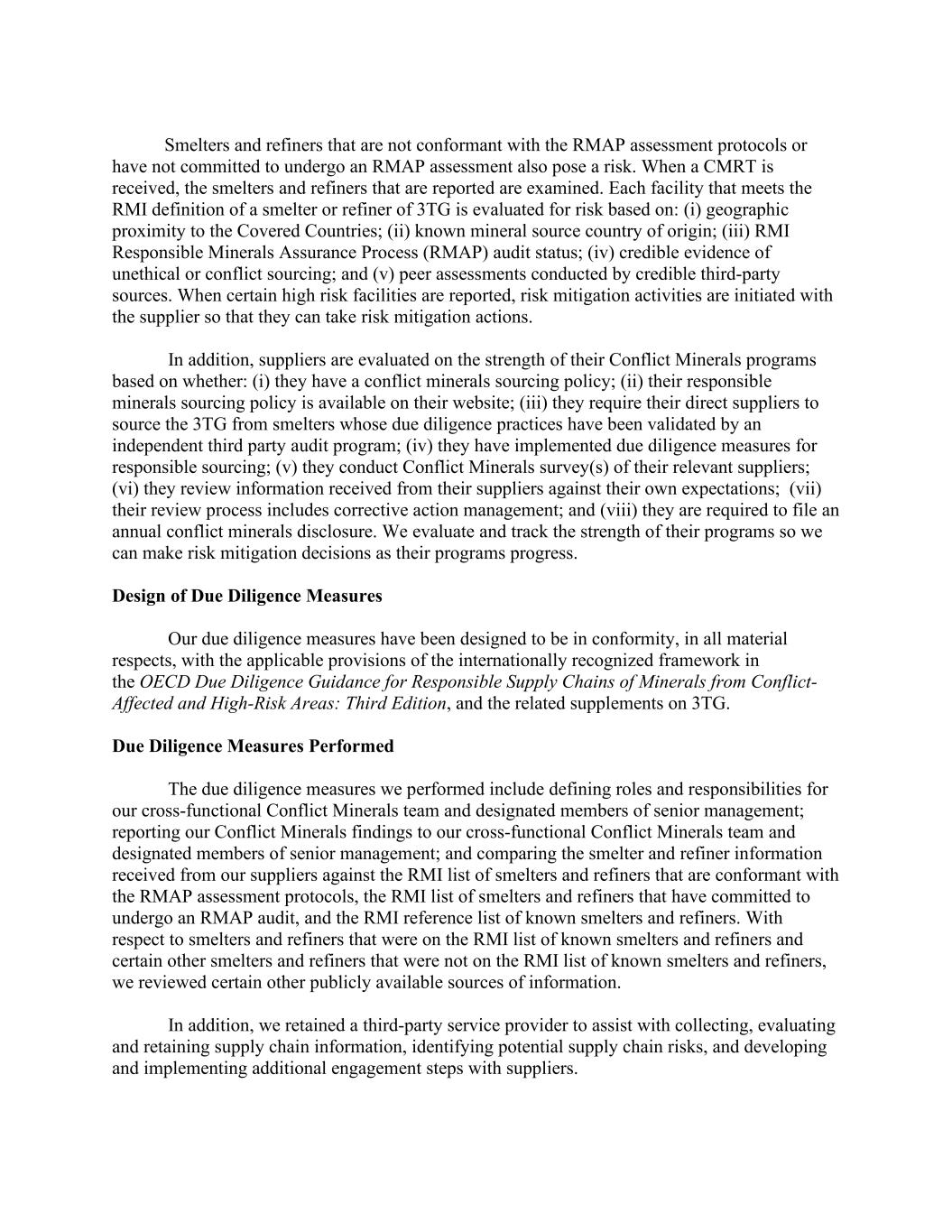 不符合RMAP评估协议或未承诺接受RMAP评估的冶炼厂和精炼厂也构成风险。当收到CMRT时,将对报告的冶炼厂和精炼厂进行检查。符合3TG的冶炼厂或精炼厂的RMI定义的每个设施的风险评估依据是:(i)与所涵盖国家的地理邻近程度;(ii)已知的矿物来源原产国;(iii)RMI负责任的Minerals保证程序(RMAP)审计状态;(iv)不道德或冲突来源的可靠证据;以及(v)由可靠的第三方来源进行的同行评估。当报告某些高风险设施时,与供应商一起发起风险缓解活动,以便他们能够采取风险缓解行动。此外,供应商根据其冲突Minerals计划的实力进行评估,其依据是否:(i)他们有冲突的矿物采购政策;(ii)他们负责任的矿物采购政策可在其网站上查阅;(iii)他们要求其直接供应商从其尽职调查做法已得到独立第三方审计计划验证的冶炼厂采购3TG;(iv)他们已实施尽职调查措施负责任的采购;(v)他们对相关供应商进行冲突Minerals调查;(vi)他们根据自己的期望审查从供应商那里收到的信息;(vii)他们的审查过程包括纠正行动管理;(viii)他们被要求提交年度冲突矿物披露。我们评估并跟踪他们项目的实力,这样我们就可以随着他们项目的进展做出风险缓解决策。尽职调查措施的设计我们的尽职调查措施在所有重大方面均符合《经合组织关于来自受冲突影响和高风险地区的Minerals负责任供应链的尽职调查指南:第三版》以及关于3TG的相关补充文件中国际公认框架的适用条款。已采取尽职调查措施我们采取的尽职调查措施包括:为我们的跨职能冲突Minerals团队和指定的高级管理人员确定角色和责任;向我们的跨职能冲突Minerals团队和指定的高级管理人员报告我们的冲突Minerals调查结果;将从我们的供应商处收到的冶炼厂和精炼商信息与符合RMAP评估协议的RMI冶炼厂和精炼商名单、承诺接受RMAP审计的RMI冶炼厂和精炼商名单以及已知冶炼厂和精炼商的RMI参考名单进行比较。关于已知冶炼厂和精炼商的RMI名单上的冶炼厂和精炼商以及不在已知冶炼厂和精炼商的RMI名单上的某些其他冶炼厂和精炼商,我们审查了某些其他可公开获得的信息来源。此外,我们聘请了第三方服务提供商,以协助收集、评估和保留供应链信息,识别潜在的供应链风险,并制定和实施与供应商的额外接触步骤。
