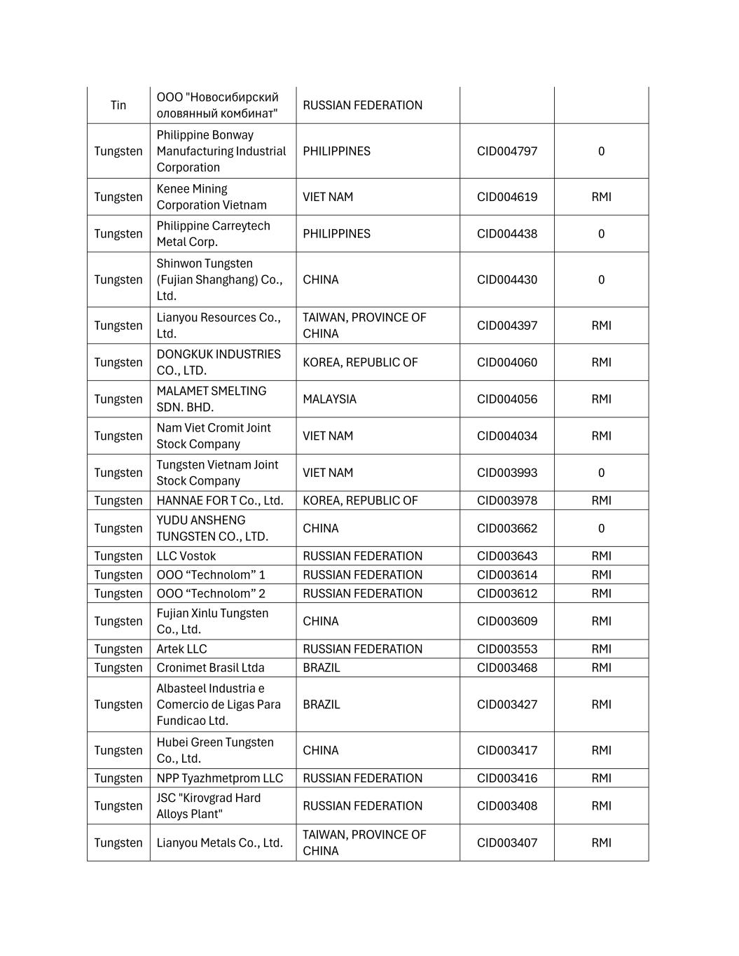 Tin OR OR " NINA FEDERATION Tungsten Philippine Bonway Manufacturing Industrial Corporation PHILIPINES CID004797 0 Tungsten Kenee Mining Corporation Vietnam NAM CID004619 RMI Tungsten Philippine Carreytech Metal Corp. PHILIPPINES CID004438 0 Tungsten Shinwon Tungsten(Fujian Shanghang)Co.,Ltd. China CID0044300 Tungsten Lianyou Resources Co.,Ltd. Taiwan,Province of China CID004397 RMI Tungsten DONGKUK Industries Co.,Ltd.,Ltd。韩国,CID004060共和国RMI钨蛋白熔炼SDN。BHD。马来西亚CID004056 RMI Tungsten Nam Viet Cromit股份公司VIET NAM CID004034 RMI Tungsten Tungsten Vietnam股份公司VIET NAM CID003993 0Tungsten HANNAE for T Co.,Ltd. Korea,Republic of CID003978 RMI Tungsten YUDU ANSHENG Tungsten Co.,Ltd。中国CID003662 0 Tungsten LLC Vostok RUSSian FEDERATION CID003643 RMI Tungsten OOO“Technolom”1俄罗斯FEDERATION CID003614 RMI Tungsten OOO“Technolom”2俄罗斯FEDERATION CID003612 RMITERMTungsten福建新鹭钨业有限公司中国CID003609 RMITERMTungsten Artek LLC RUSSian FEDERATION CID003553 RMI Tungsten Cronimet Brasil Ltda Brazil CID003468 RMI Tungsten Albazeel Industria e Comercio de Ligas Para Fundicao Ltd。中国省CID003407 RMI