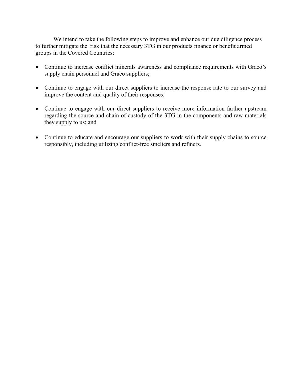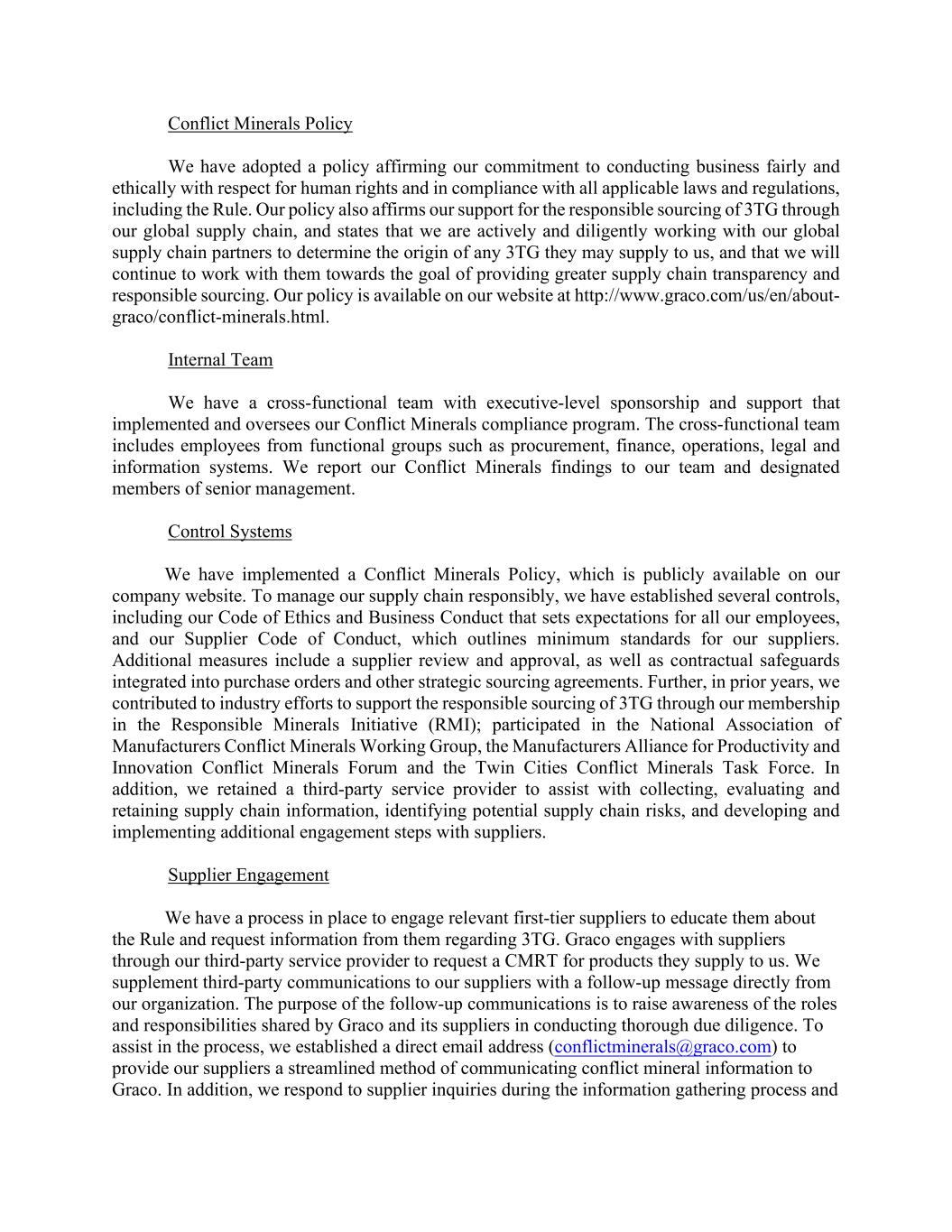 冲突Minerals政策我们采用了一项政策,申明我们致力于在尊重人权的情况下并在遵守包括《规则》在内的所有适用法律和法规的情况下以公平和合乎道德的方式开展业务。我们的政策还肯定了我们对通过我们的全球供应链负责任地采购3TG的支持,并表示我们正在积极和勤奋地与我们的全球供应链合作伙伴合作,以确定他们可能向我们供应的任何3TG的原产地,我们将继续与他们合作,以实现提供更大的供应链透明度和负责任的采购的目标。我们的政策可在我们的网站http://www.graco.com/us/en/about-graco/conflict-minerals.html上查阅。内部团队我们有一个拥有高管级赞助和支持的跨职能团队,负责实施和监督我们的冲突Minerals合规计划。跨职能团队包括来自采购、财务、运营、法律和信息系统等职能组的员工。我们向我们的团队和指定的高级管理人员报告我们在冲突中的Minerals调查结果。控制系统我们实施了冲突Minerals政策,该政策可在我们公司的网站上公开查阅。为了负责任地管理我们的供应链,我们建立了若干控制措施,包括我们的Code of Ethics和为所有员工设定期望的商业行为,以及我们的供应商行为准则,它为我们的供应商概述了最低标准。其他措施包括供应商审查和批准,以及纳入采购订单和其他战略采购协议的合同保障措施。此外,在前几年,我们通过成为负责任的Minerals倡议(RMI)的成员,为支持3TG负责任采购的行业努力做出贡献;参加了全国制造商协会冲突Minerals工作组、制造商联盟生产力和创新冲突Minerals论坛以及双城冲突Minerals工作组。此外,我们聘请了第三方服务提供商,以协助收集、评估和保留供应链信息,识别潜在的供应链风险,并制定和实施与供应商的额外接触步骤。供应商参与我们有一个流程,让相关的一级供应商参与进来,让他们了解规则,并要求他们提供有关3TG的信息。固瑞克通过我们的第三方服务提供商与供应商接触,为他们供应给我们的产品请求CMRT。我们通过直接来自我们组织的后续消息来补充与供应商的第三方沟通。后续沟通的目的是提高人们对固瑞克及其供应商在进行彻底尽职调查中所分担的角色和责任的认识。为了协助这一过程,我们建立了一个直接的电子邮件地址(conflictMinerals@graco.com),为我们的供应商提供一个向固瑞克传达冲突矿物信息的简化方法。此外,我们在信息收集过程中回复供应商的询问和