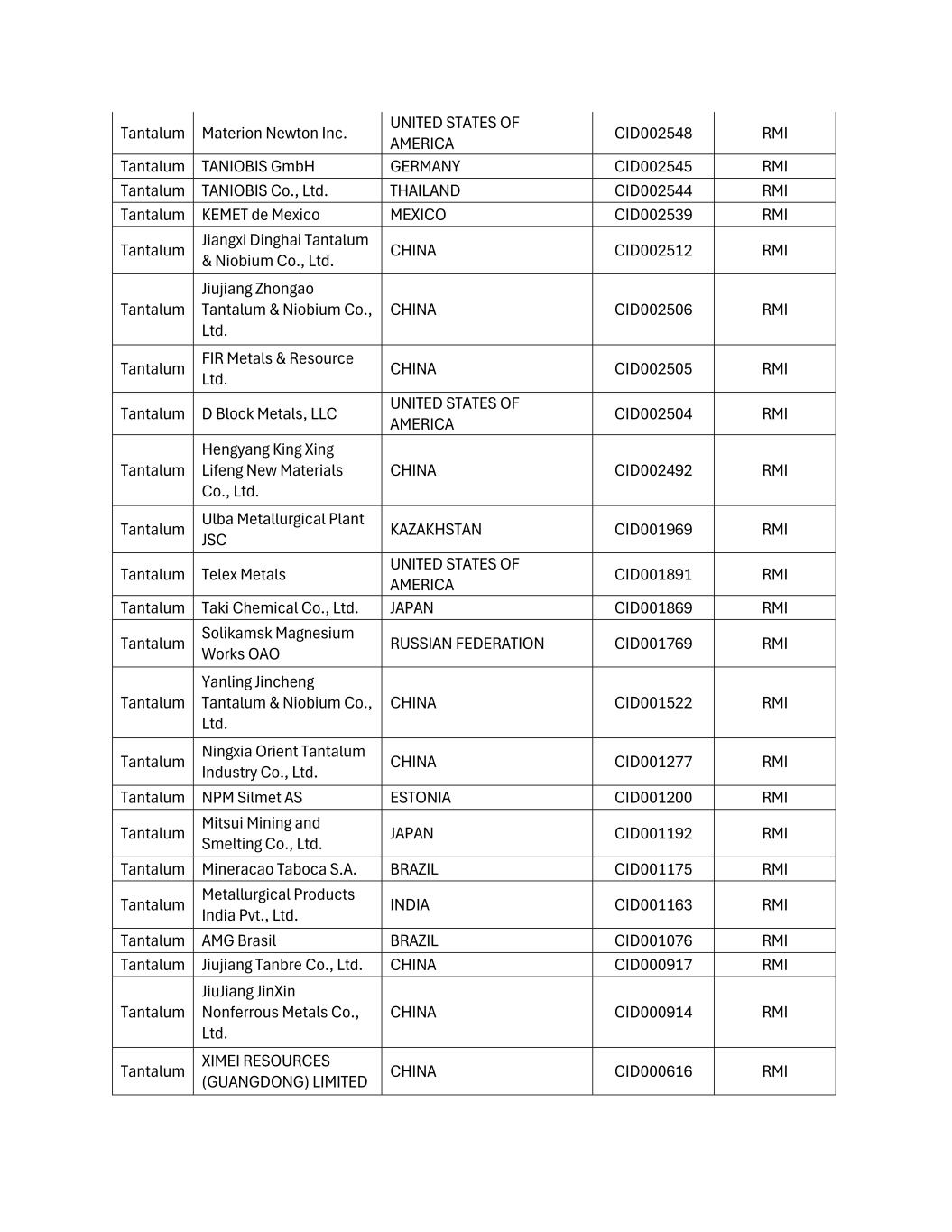Tantalum Materion Newton Inc. United States of AMERICA CID002548 RMI Tantalum TANIOBIS GmbH Germany CID002545 RMI Tantalum TANIOBIS Co.,Ltd. Thailand CID002544 RMITERM3 Tantalum KEMET de Mexico CID002539 RMITERM4 Tantalum Jianghai Tantalum & Niobium Co.,Ltd. CHINA CID002512 RMI Tantalum Jiujiang Zhongao Tantalum & Niobium Co.,Ltd. CHINA CID002506 RMI Tantalum FIR Metals & Resource Ltd. CHINA CID002505丨RMI TERM4 Tantalum FIR Metals & Resource Ltd。Ltd.中国CID002492 RMI丨钽Ulba冶金厂JSC哈萨克斯坦CID001969 RMIRMIRMIRMI中国CID001522 RMITERM5钽业宁夏东方钽业有限公司中国CID001277 TERM6Ltd.印度CID001163 RMI钽业AMG巴西CID001076 RMI钽业九江钽业有限公司中国CID000917 RMITERM3钽业九江金鑫有色金属有限公司中国CID000914 RMI钽业西美资源(广东)有限公司中国CID000616 RMI