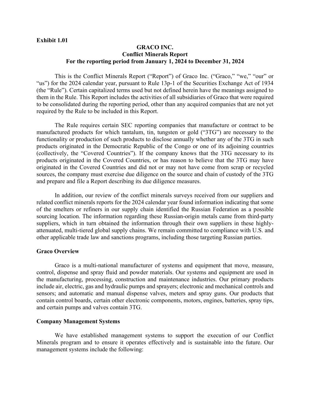 附件 1.01 GRACO公司冲突Minerals 2024年1月1日至2024年12月31日报告期间报告这是Graco Inc.TERM2Minerals(“固瑞克”、“我们”、“我们的”或“我们”)根据1934年证券交易法第13p-1条规则(“规则”)编制的2024年日历年度冲突TERM1报告(“报告”)。此处使用但未定义的某些大写术语具有规则中赋予它们的含义。本报告包括固瑞克所有被要求在报告期间合并的子公司的活动,但规则尚未要求纳入本报告的任何被收购公司除外。该规则要求某些SEC报告公司制造或承包制造的产品,其中钽、锡、钨或金(“3TG”)是此类产品的功能或生产所必需的,每年披露此类产品中的任何3TG是否起源于刚果民主共和国或其毗邻国家之一(统称为“涵盖国家”)。如果公司知道其产品所需的3TG起源于所涵盖的国家,或有理由相信3TG可能起源于所涵盖的国家,并且没有或可能没有来自废料或回收来源,公司必须对3TG的来源和保管链进行尽职调查,并编制和提交一份报告,说明其尽职调查措施。此外,我们对从我们的供应商收到的冲突矿物调查和2024日历年相关冲突矿物报告的审查发现,有信息表明,我们供应链中的一些冶炼厂或精炼商将俄罗斯联邦确定为可能的采购地点。有关这些俄罗斯原产金属的信息来自第三方供应商,而第三方供应商又通过他们自己在这些高度衰减、多层次的全球供应链中的供应商获得了这些信息。我们仍然致力于遵守美国和其他适用的贸易法和制裁计划,包括针对俄罗斯各方的制裁计划。固瑞克综述固瑞克是一家跨国制造商,生产移动、测量、控制、分配和喷洒流体和粉体材料的系统和设备。我们的系统和设备应用于制造、加工、建筑和维修行业。我们的主要产品包括空气、电动、气体和液压泵和喷雾器;电子和机械控制和传感器;以及自动和手动分配阀、仪表和喷枪。本公司含有控制板、某些其他电子元器件、电机、发动机、电池、喷头、某些泵阀的产品含有3TG。公司管理系统我们建立了管理系统来支持我们的冲突Minerals计划的执行,并确保该计划有效运作并在未来具有可持续性。我们的管理系统包括以下方面: