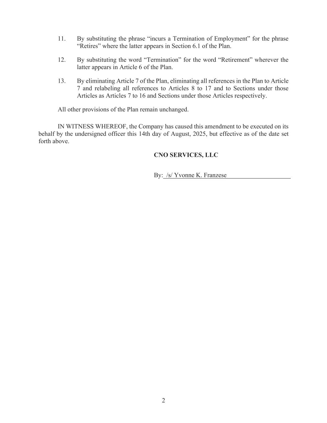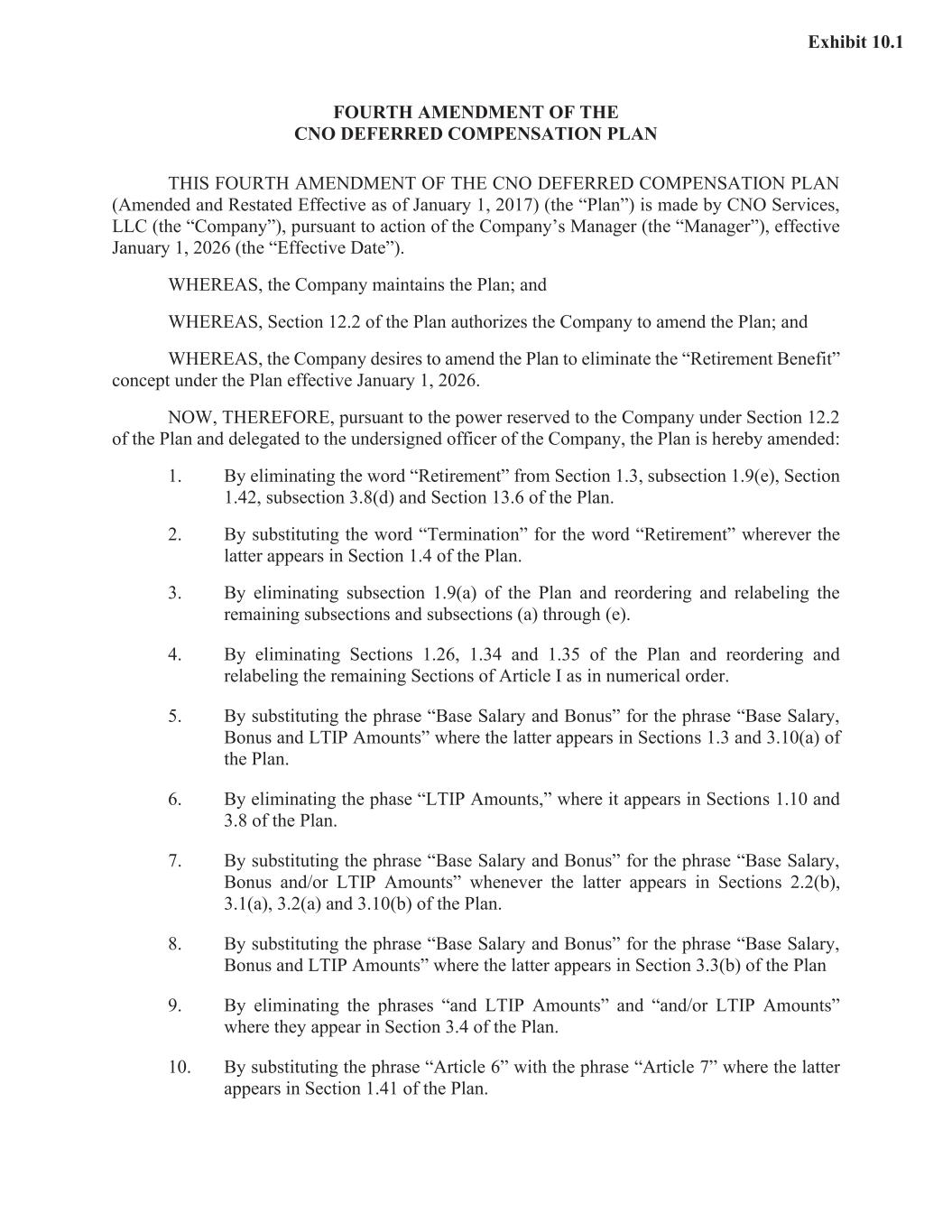 CNO递延补偿计划的第四次修订此次对CNO递延补偿计划(经修订和重述,自2017年1月1日起生效)(“计划”)的第四次修订由CNO Services,LLC(“公司”)根据公司管理人(“管理人”)的行动作出,自2026年1月1日(“生效日期”)起生效。然而,公司维持该计划;及鉴于该计划第12.2节授权公司修订该计划;及鉴于公司希望修订该计划,以消除该计划下的“退休福利”概念,自2026年1月1日起生效。因此,现根据根据计划第12.2条保留予公司并转授予以下签署的公司高级人员的权力,现将计划修订为:1。透过取消计划第1.3节、第1.9(e)款、第1.42节、第3.8(d)款及第13.6节中的「退休」字样。2.通过将“终止”一词替换为“退休”一词,无论后者出现在计划第1.4节中。3.删除计划第1.9(a)款,并将其余各款及(a)至(e)款重新排序及重新贴上标签。4.通过删除计划的第1.26、1.34和1.35节,并按数字顺序对第一条其余章节进行重新排序和重新标记。5.以“基本工资、奖金和长期投资计划金额”取代“基本工资、奖金和长期投资计划金额”,后者出现在该计划第1.3和3.10(a)节中。6.通过消除该计划第1.10和3.8节中出现的阶段“LTIP金额”。7.只要后者出现在计划第2.2(b)、3.1(a)、3.2(a)和3.10(b)节中,就用“基本工资和奖金”取代“基本工资、奖金和/或长期投资计划金额”。8.将“基本工资、奖金和长期投资计划金额”替换为“基本工资、奖金和长期投资计划金额”,后者出现在计划9的第3.3(b)节中。通过删除计划第3.4节中出现的短语“和LTIP金额”和“和/或LTIP金额”。10.通过将“第6条”一语替换为“第7条”,如果后者出现在计划的第1.41节中。附件 10.1