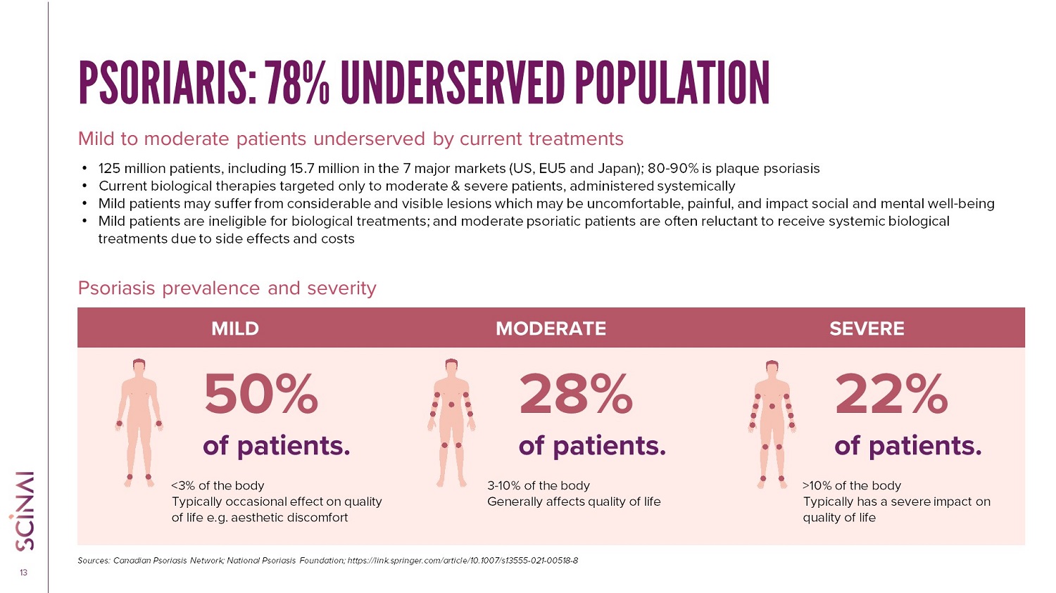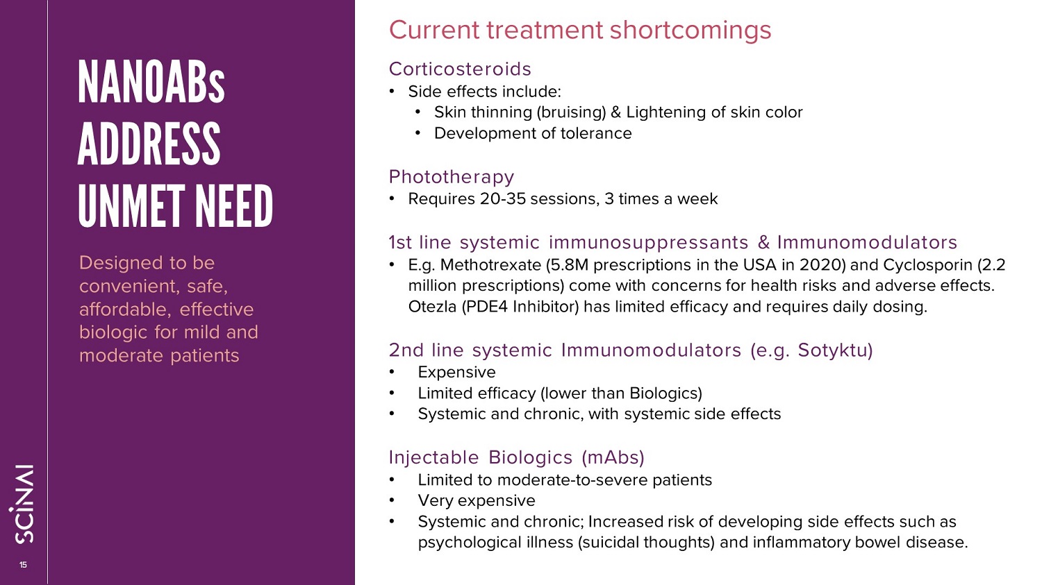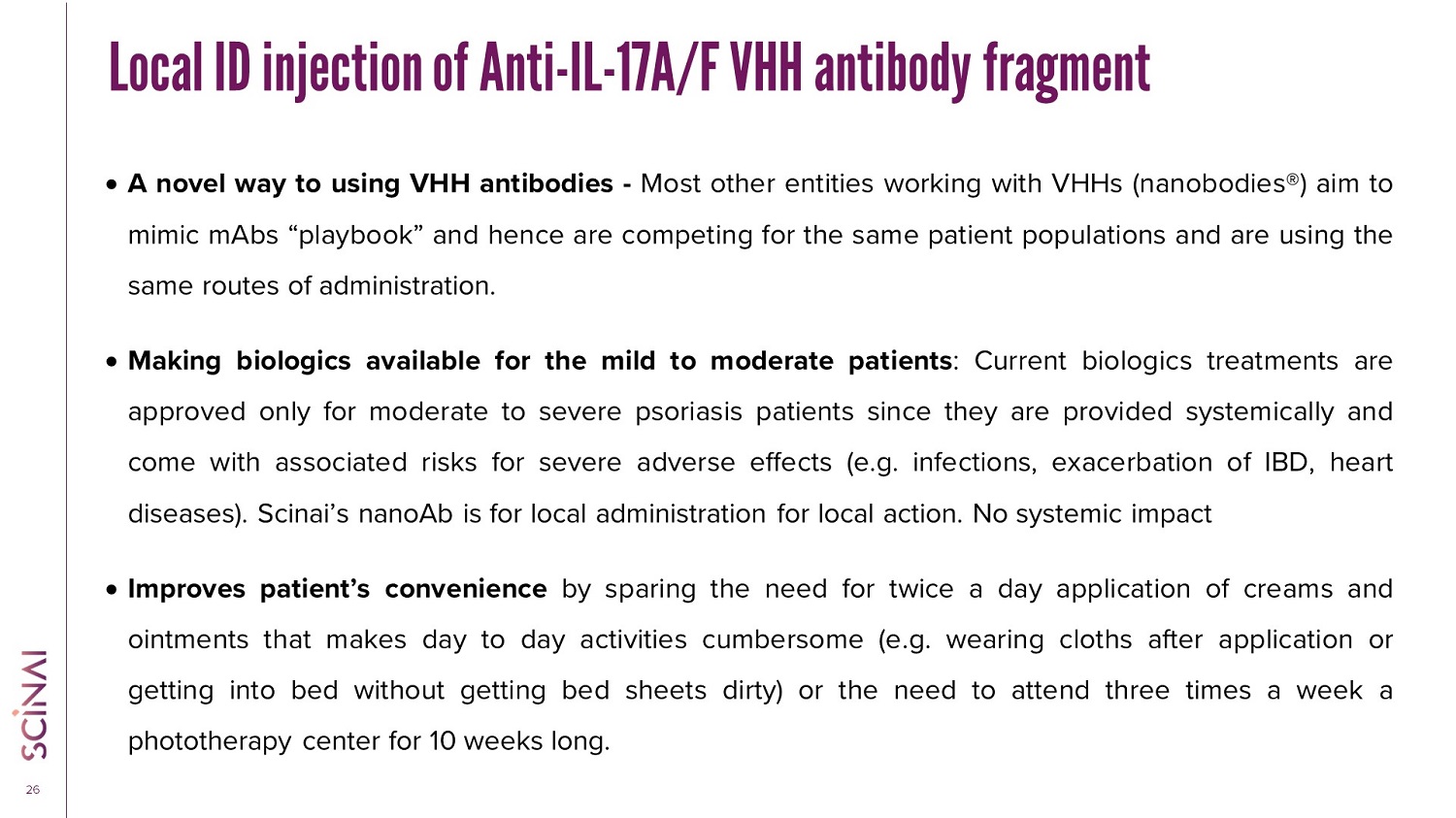 点击编辑Master Title STYLE 26抗IL-17A/F VHH抗体片段的局部ID注射一种使用VHH抗体的新方法——大多数其他与VHH(nanobodies ®)合作的实体旨在模拟单抗“剧本”,因此正在竞争相同的患者群体,并使用相同的给药途径。为轻中度患者提供生物制剂:目前的生物制剂治疗仅被批准用于中度至重度银屑病患者,因为它们是系统性提供的,并伴随着严重不良反应(例如感染、IBD加重、心脏病)的相关风险。Scinai的nanoAB用于地方行政当局的地方行动。没有全身性影响通过省去每天两次涂抹乳膏和软膏的需要来提高患者的便利性,这使得日常活动变得繁琐(例如,涂抹后穿衣服或在不弄脏床单的情况下上床),或者需要每周三次光疗中心就诊10周。