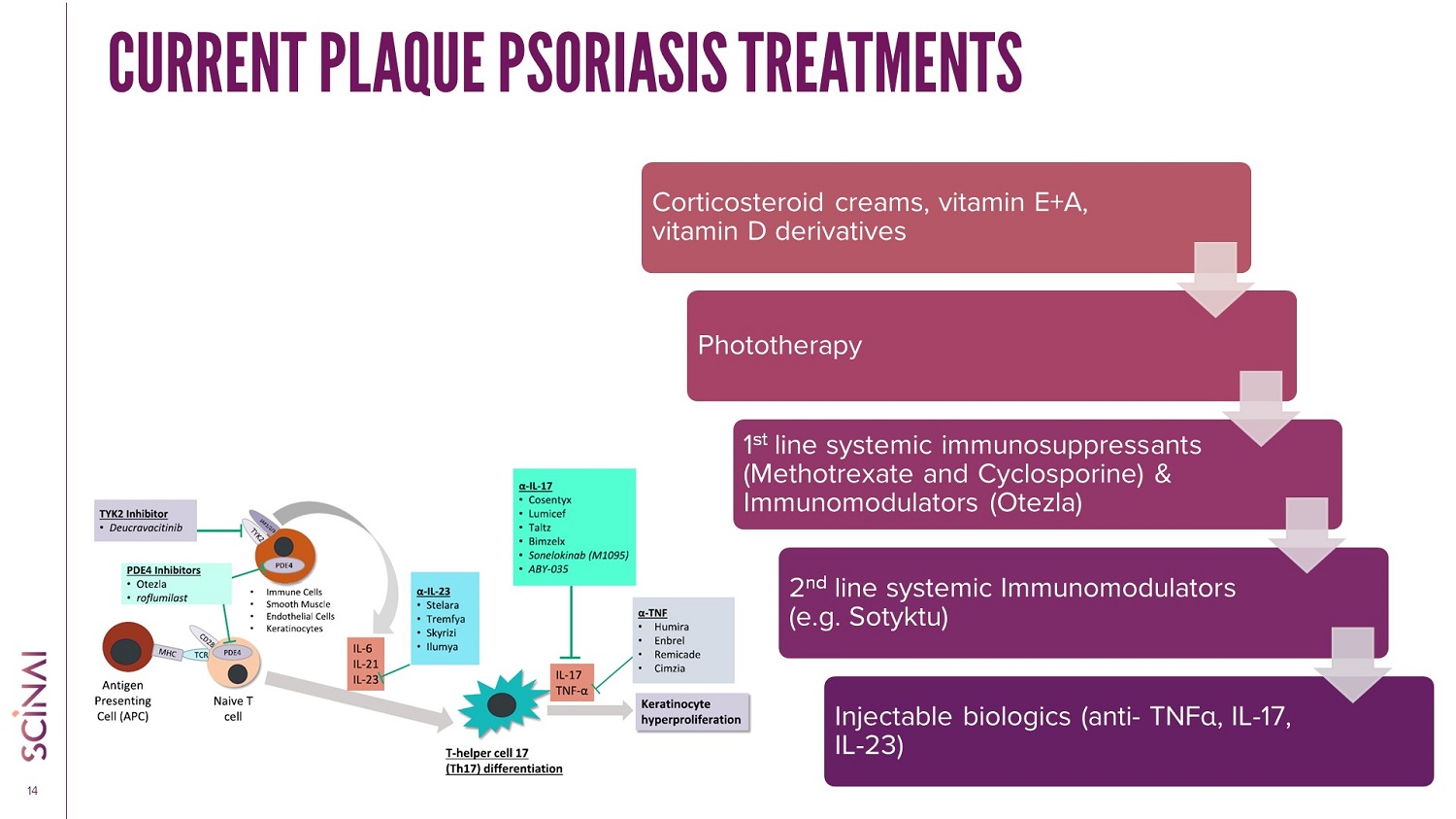 点击编辑master title style 14当前PLAQUE PSORIASIS Treatments皮质类固醇乳膏、维生素E + A、维生素D衍生物光疗1线全身免疫抑制剂(甲氨蝶呤和环孢素)&免疫调节剂(Otezla)2线全身免疫调节剂(例如Sotyktu)注射用生物制剂(抗-TNF α、IL-17、IL-23)