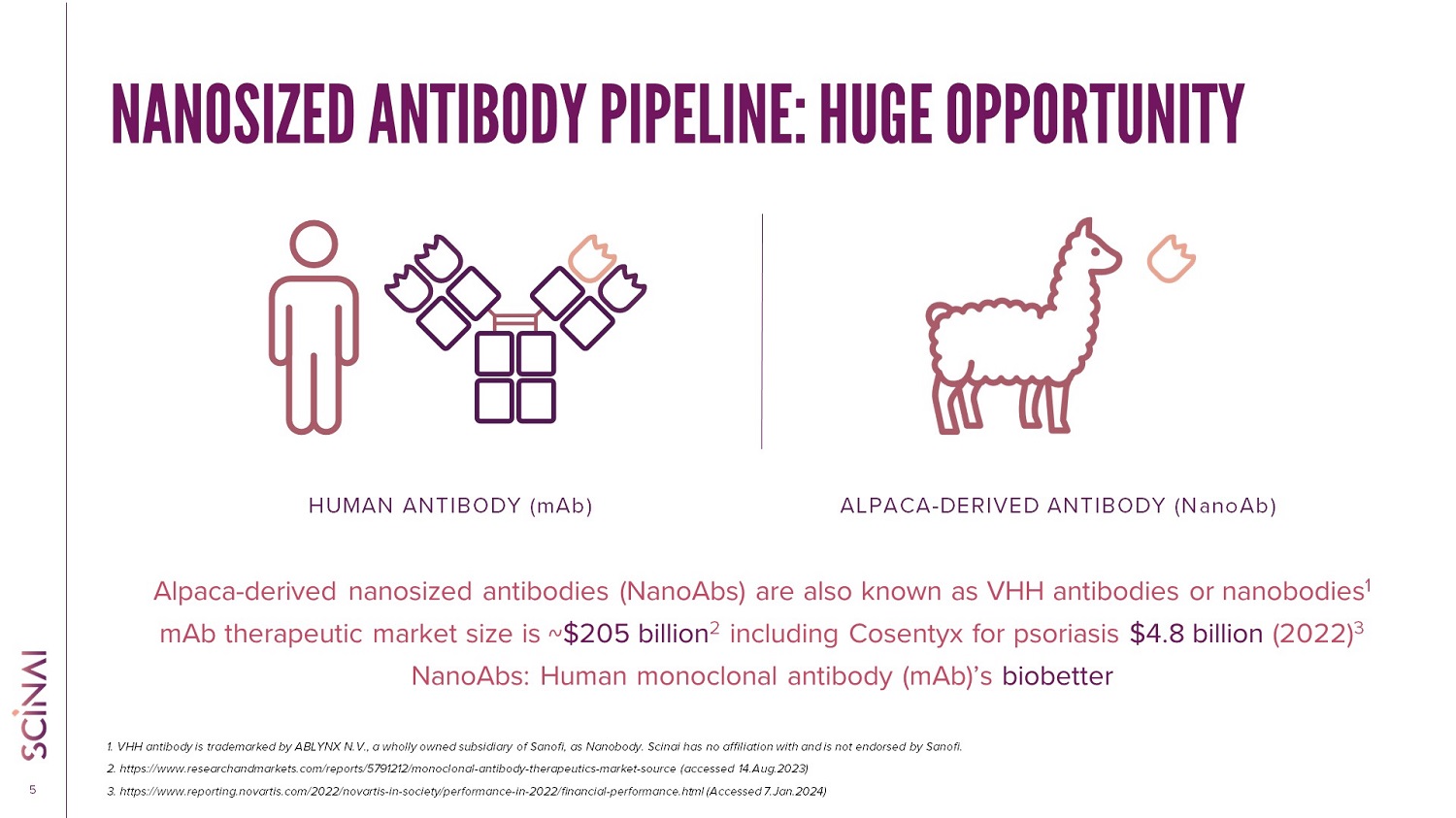 点击编辑大师标题STYLE 5羊驼衍生的纳米抗体(nanoAB)也被称为VHH抗体或纳米抗体1 mAB治疗市场规模约为2050亿美元2包括Cosentyx治疗银屑病48亿美元(2022)3 nanoAB:人单克隆抗体(MAB)的生物增强剂1。VHH抗体由赛诺菲全资子公司ABLYNX N.V.注册商标为Nanobody。Scinai与Wi th没有从属关系,也没有赛诺菲背书。2. https://www.researchandmarkets.com/reports/5791212/monoclonal-antibody-therapeutics-market-source(accessed 14.Aug.2023)3. https://www.reporting.novartis.com/2022/novartis-in-society/performance-in-2022/financial-performance.html(accessed 7.Jan.2024)human antiBODY(MAB)ALPACA-derived antiBODY(NANOAB)nanosized antiBOD Y PIPELINE:HUGE Opportunity