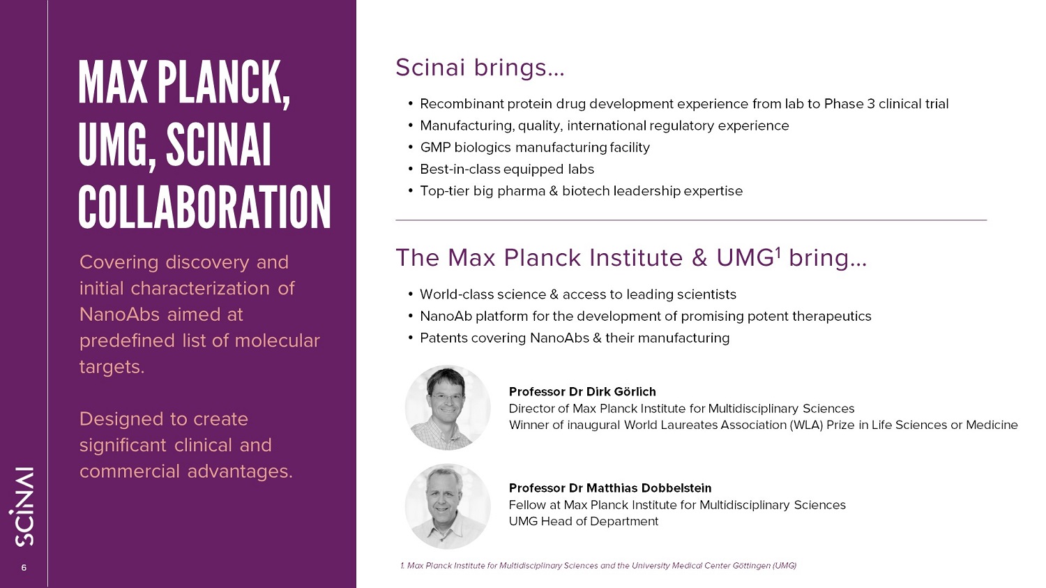点击编辑Master Title STYLE 6 Max Planck Institute & UMG 1带来…•从实验室到3期临床试验的重组蛋白药物开发经验•制造、质量、国际监管经验• GMP生物制剂制造设施•一流配备的实验室•顶级大型制药公司和生物技术领导专业知识•世界一流的科学和获得领先科学家的机会• NanoAB平台,用于开发有前途的有效疗法•专利涵盖NanoAB及其制造教授Dirk G ö rlich博士马克斯·普朗克多学科科学研究所所长首届世界获奖者协会(WLA)生命科学奖或医学教授Matthias Dobbelstein博士马克斯·普朗克多学科科学研究所UMG涵盖发现的部门负责人以及针对预先定义的分子靶点列表的NanoAB的初步表征。旨在创造显着的临床和商业优势。Scinai带来…MAX PLANCK、UMG、SCINAI协作1。马克斯·普朗克多学科科学研究所和G ö ttingen大学医学中心(UMG)