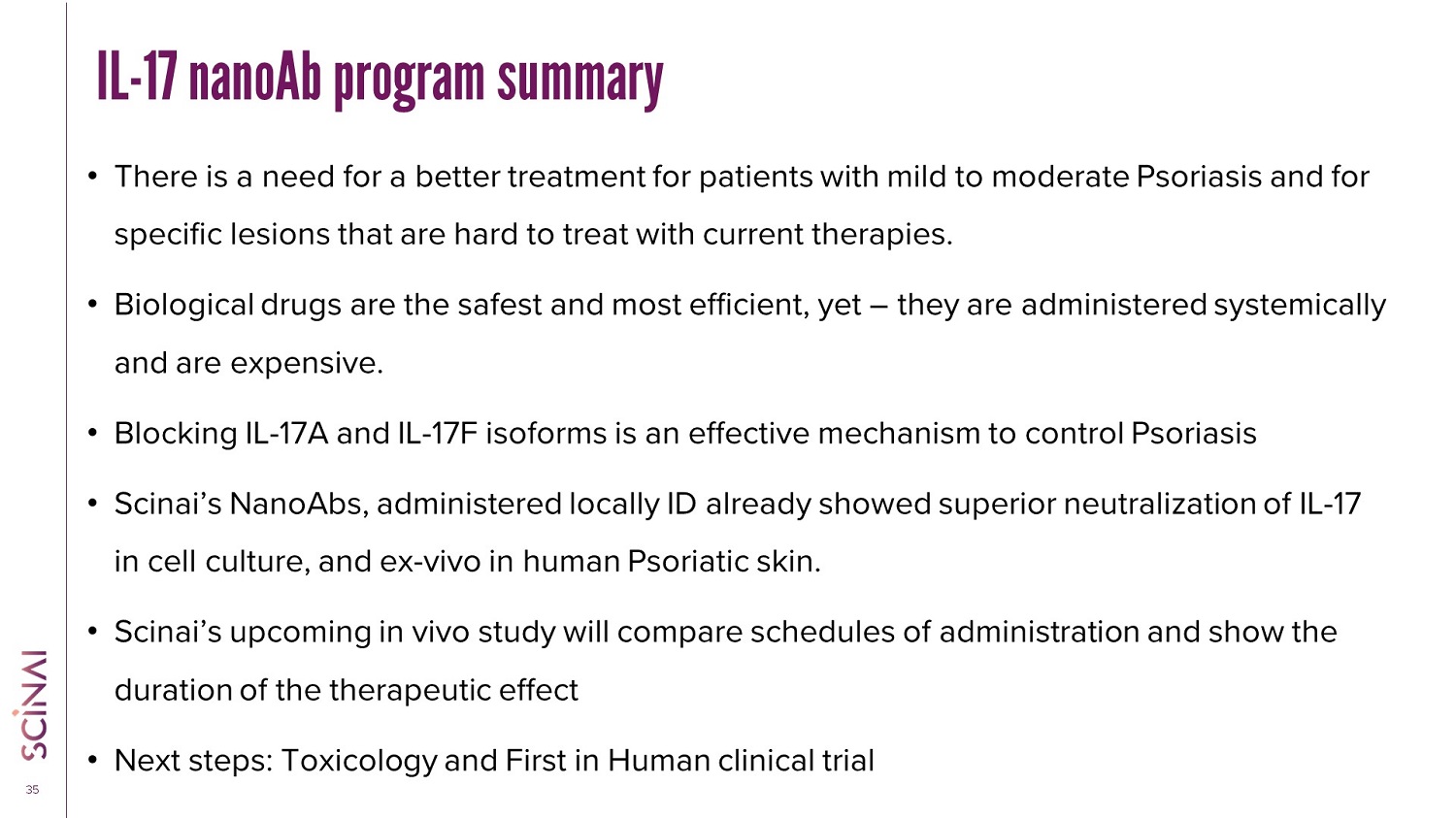 点击编辑Master Title STYLE 35 IL-17 nanoAB程序摘要• T这里是对轻中度银屑病患者和目前疗法难以治疗的特定病变的更好治疗的需求。•生物药物是最安全、最有效的,然而——它们是全身性给药的,而且价格昂贵。•阻断IL-17A和IL-17F异构体是控制银屑病的有效机制• Scinai的纳米抗体,局部给药ID已经在细胞培养中显示出对IL-17的优越中和作用,并在人银屑病皮肤中进行离体。• Scinai即将进行的体内研究将比较给药时间表并显示治疗效果的持续时间•下一步:毒理学和首次人体临床试验